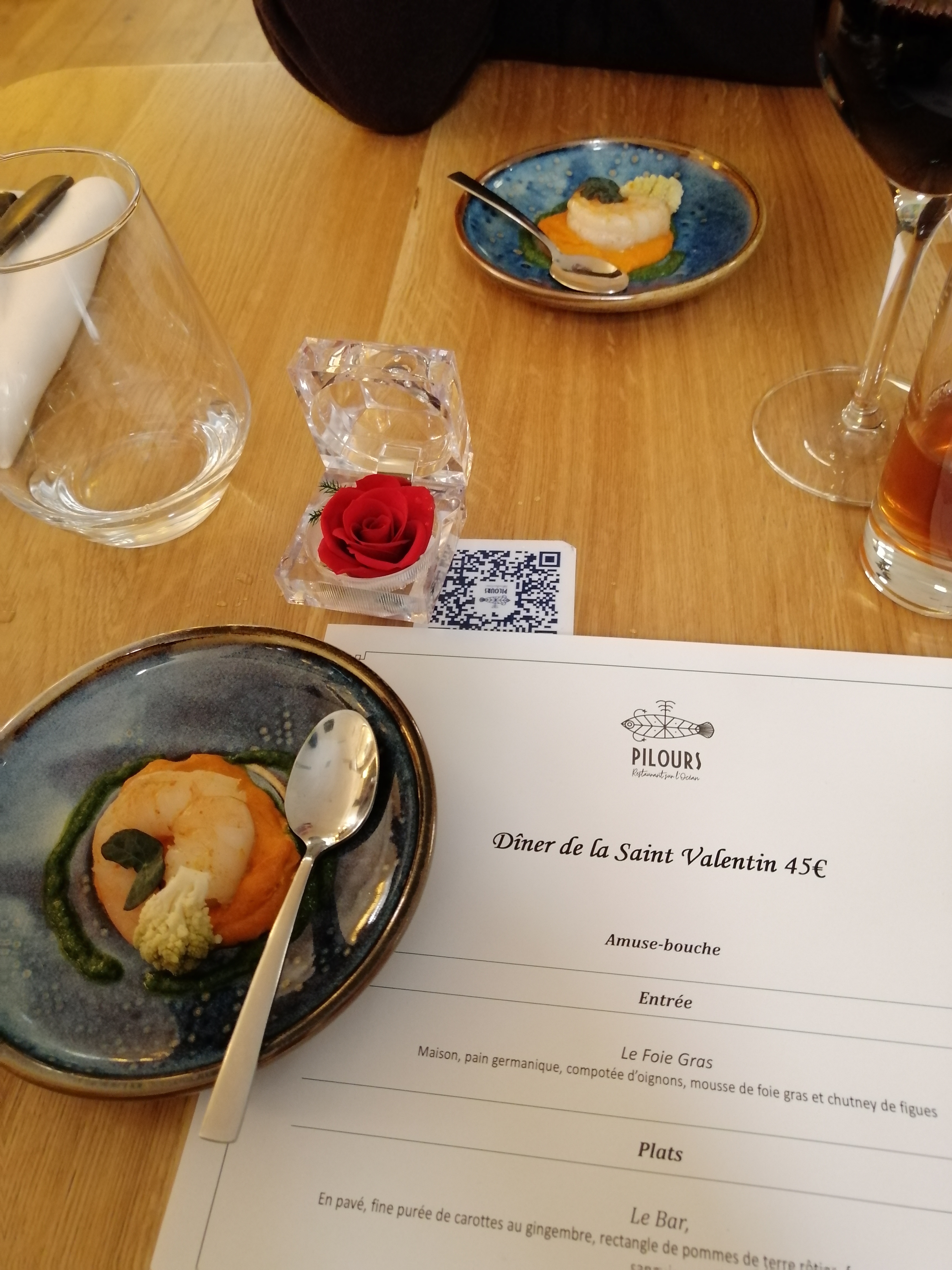 En partie déçu À la réservation pour la St Valentin il ne nous ont pas précisé que c'etais un menu unique imposé à 45 euros On a demander de l'eau plate On nous a mis de l'eau en bouteille et pas en carafe débouché donc trop tard pour changer Et sur la table en déco dans un coffret à bague une rose éternel offert par beneteau RCM marine et que nous pouvions prendre mais cela ne nous a pas été non-plus expliqué à notre installation à table- L'équipe de serveurs et serveuses MOYEN Sinon dans l'ensemble le repas était correct mais pas à la hauteur du prix