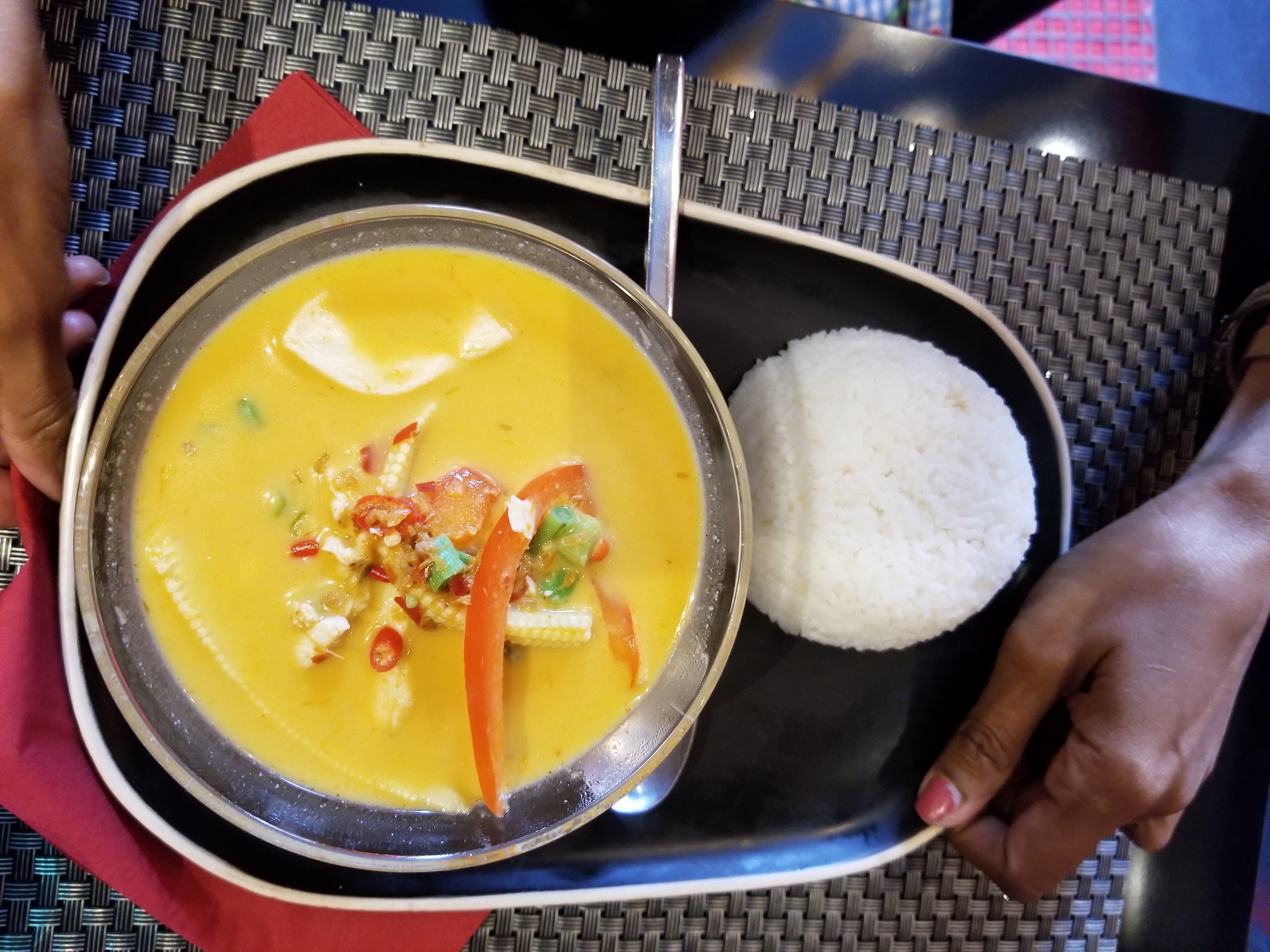 La nourriture est très bonne, rien à dire, le riz est bon et le curry excellent. Les nouilles étaient légèrement trop cramés. Le service était un peu long , nous avons attendu environ 30 minutes. Belle décoration, confortable.