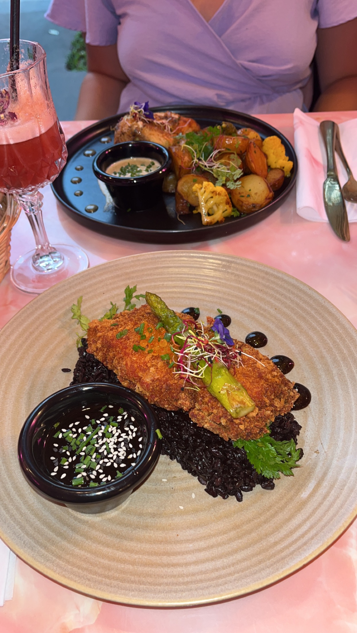Alors endroit magnifique pour les photos mais bien plus petit que ce que j'imaginais, 20 personnes assisses tout au plus, ensuite il y a la terrasse ou a fini bien sur, j'ai voulu faire plaisir à ma fille pour ses photos et insta mais la douloureuse m'a bien embêté toute la soirée, bref, le diner on a le choix entre 4 plats, j'ai choisi le filet de poulet, à peine deux morceaux de viande sous un lit de purée de patates douces, qui n'était pas très bonne et je n'aime pas trop ça, j'ai donc demandé si on pouvait changer de légumes, elle m'a dit non c'est une décoration bla bla, trop difficile de changer, j'ai donc pris des légumes poêlés, 7€ de supplément pour des carottes et courgettes, lol les légumes les moins chers du marché, bref le diner pas top, et le coca 250ml 6€, mon poulet 23€ oui oui et le saumon de ma fille 26€, bref une note à 69€ pour un repas très bof. je trouve ça dommage de faire des menus aussi cher sous prétexte que le décor est sympa, mais il faudrait revoir vos menus diner en tout cas, le reste je peux pas juger, c'est bien trop cher, et tout le monde ne peut pas se le permettre. Moi le prix je m'en fou, mais lorsque je paie autant, je dois être satisfaite en partant hors ce ne fut pas le cas. Donc attention aux tarifs prohibitif de ce restaurant, allez y pour boire un verre et encore pour 20€ vous aurez deux verres. Et les filles à l'entrée franchement, elles pourraient s'habiller mieux, une touche de rose et des fringues un peu plus habillé, il faut jouer le jeu jusqu'au bout, on vous prend votre argent mais on est bien habillé dans un joli cadre. Bref je n'y retournerai surement pas....