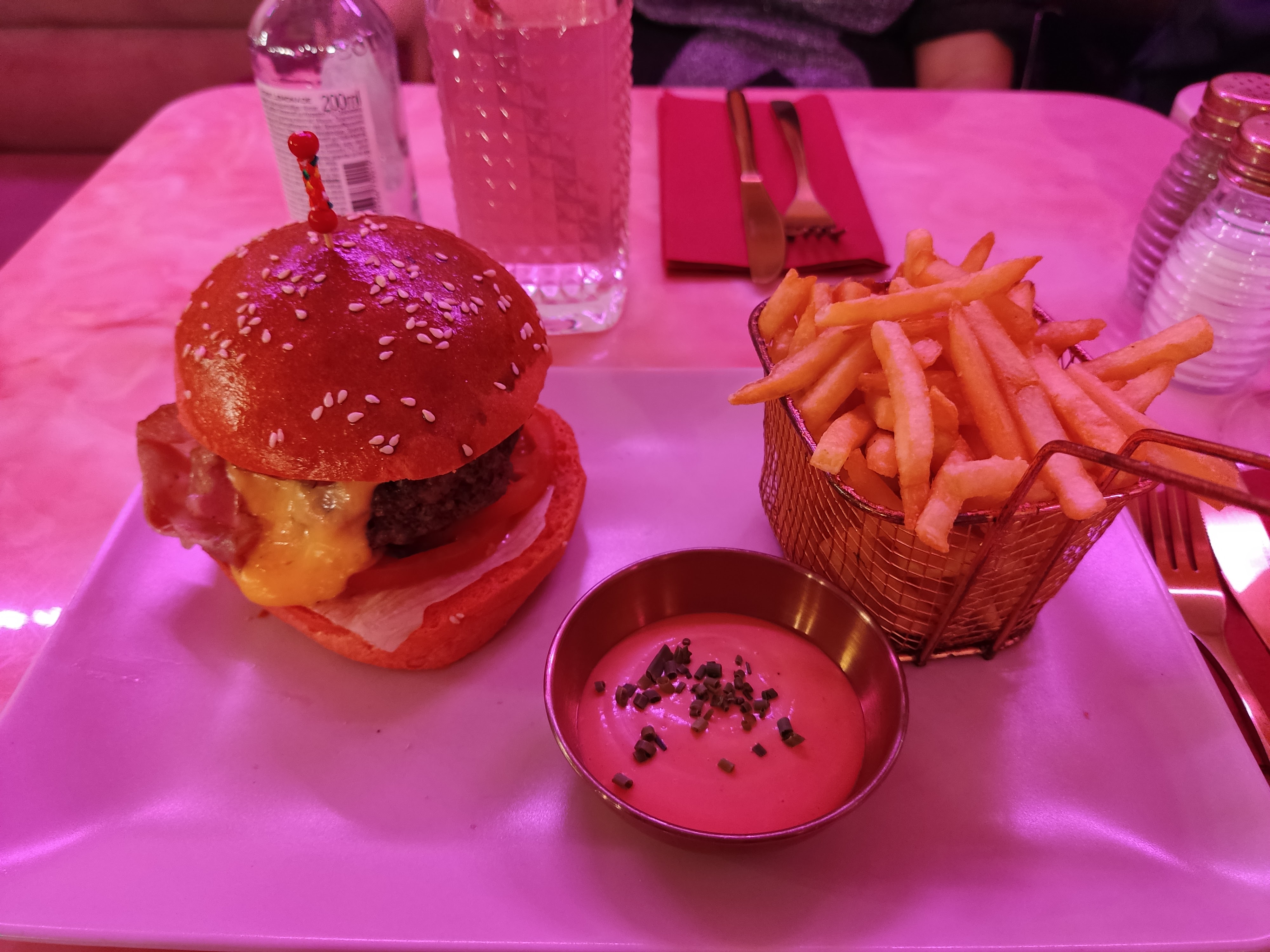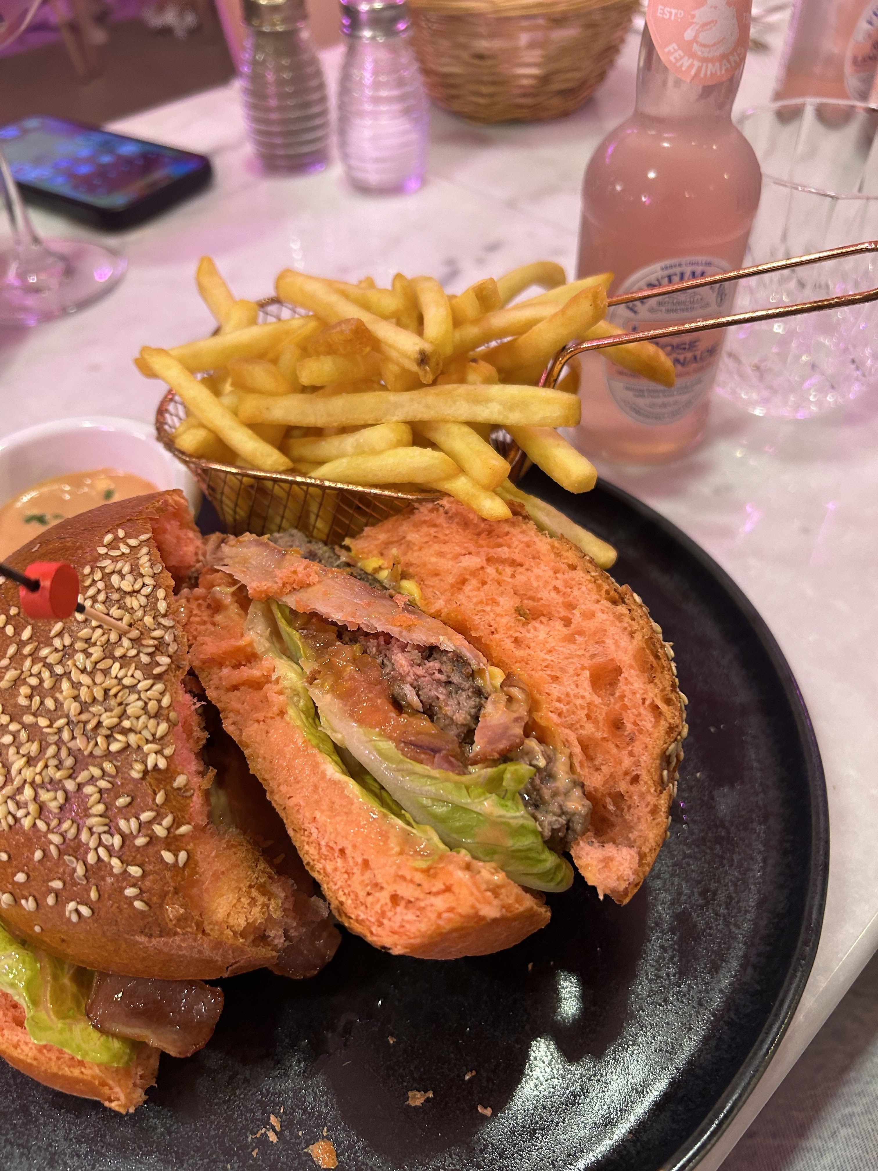 Si tu viens pour les photos insta, tu es servie ! Par contre le reste laisse à désirer..... 1️⃣ L'endroit rose et chaleureux ne semble pas renvoyé la même image auprès de l'accueil et du service. J'ai demandé tout au long du repas, un pichet d'eau, que je n'ai reçu seulement après 15-20min. 2️⃣ Pour y manger, il faut réservé alors que des places sont disponibles déjà sur places. 3️⃣ Très étroit entre les tables, il faut littéralement soulevez et décalé la table pour sortir, côté fauteuil. 4️⃣ Sinon le prix ne vaut pas la qualité des plats (23€-30, entrée 17-18€ et dessert 14€) mais uniquement de la qualité visuel (et encore, sur certains plats uniquement). Surveillé l'addition, ça devient vite plus salé que ton repas ! ⚠️ Ne prenne pas les ticket et carte restau