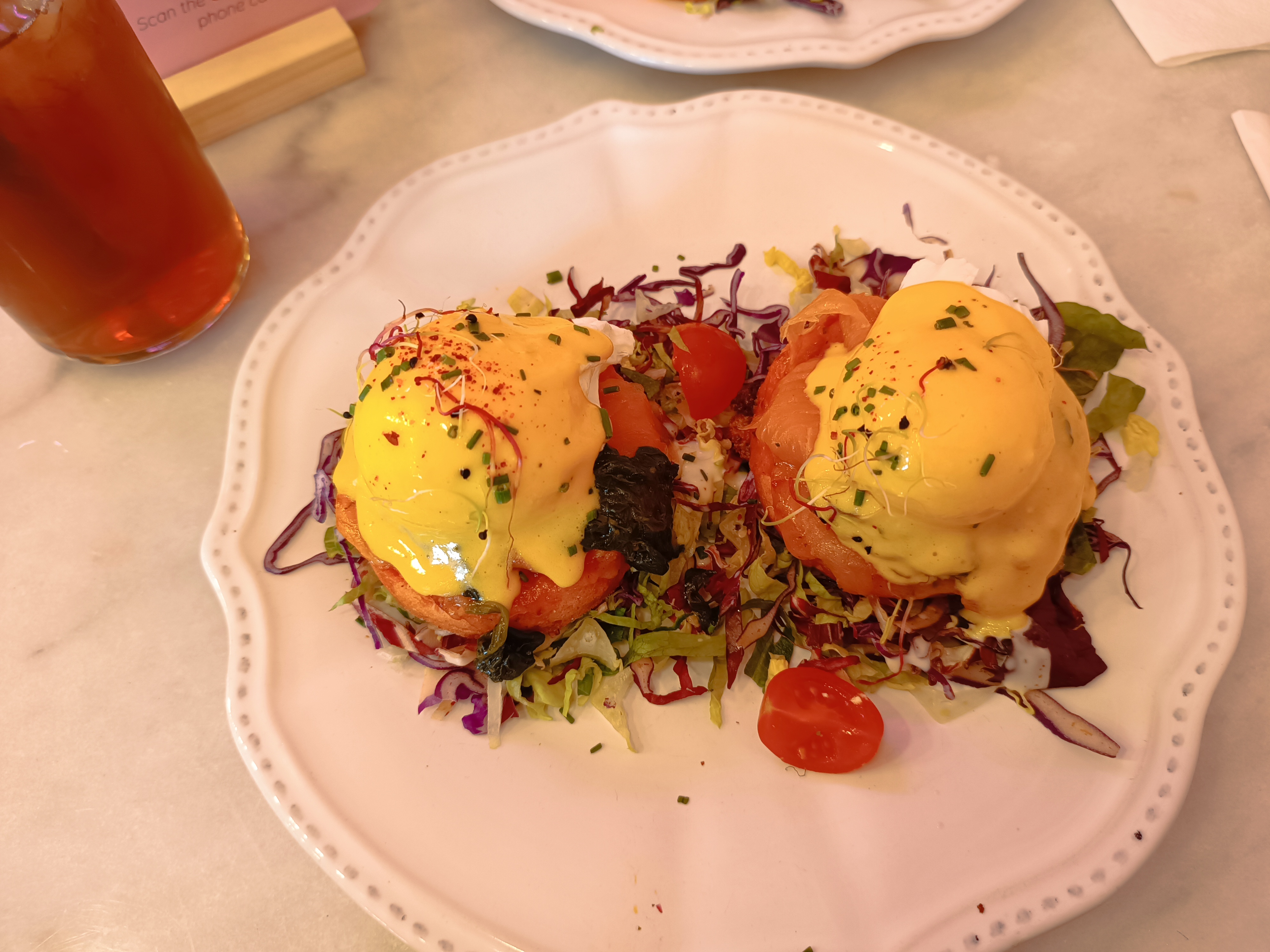 Étant une adepte de brunchs d'ici ou d'ailleurs j'ai voulu tester il y a quelques jours.. copie des salons de thé londoniens à la française.. ok.. lieu Instagrammable donc on valide, déco fleurie et girly. Cependant : attente interminable pour être servi (+ de 50mn pour les plats et 15mn pour les boissons) plat froid, pas bien cuit.. notamment les pancakes (attente de 30mn de plus) dont la pâte ressemblait à celle d'un gâteau..la mascarpone au-dessus aurait dû être retravaillée avec du sucre glace donc en bouche ce n'était que du fromage.. Plats bien présentés mais élevés pour ce que c'est (3-4€ de moins aurait été super) .. musique bruyante (on ne s'entendait pas parler -_- ) pas de choix de lait pour les latte (la serveuse ne savait pas que le lait de soja ou amande existait!) Beau cadre maiiiis dommage qu'il n'y ait pas assez de place à l'intérieur donc places limitées. Menu et tarifs à revoir.. pensez aux végétariens/vegan :)
