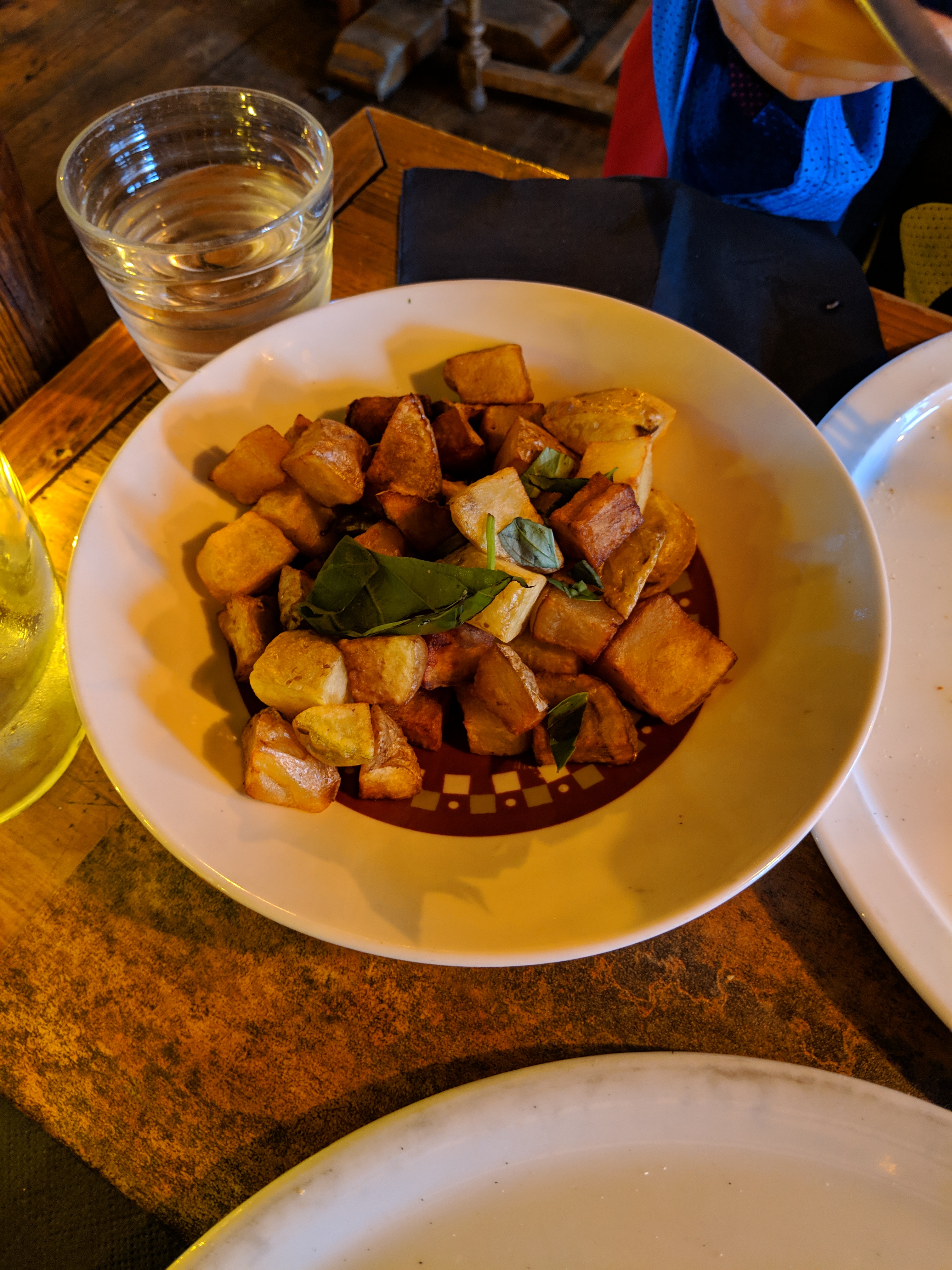 Abordable pour la région. Les pizzas peuvent être commandées sans fromage pour les végétaliens. Je recommande également fortement de commander un côté de pommes de terre. Il n'y en a pas explicitement sur le menu. Ils sont assaisonnés uniquement avec quelques feuilles de basilic et presque pas d’huile pour un délice chaud et croustillant ! De plus, il y a un deuxième étage, alors n'hésitez pas à demander s'il y a encore de la place car ce que vous voyez dans les fenêtres ne représente qu'environ la moitié du coin salon.