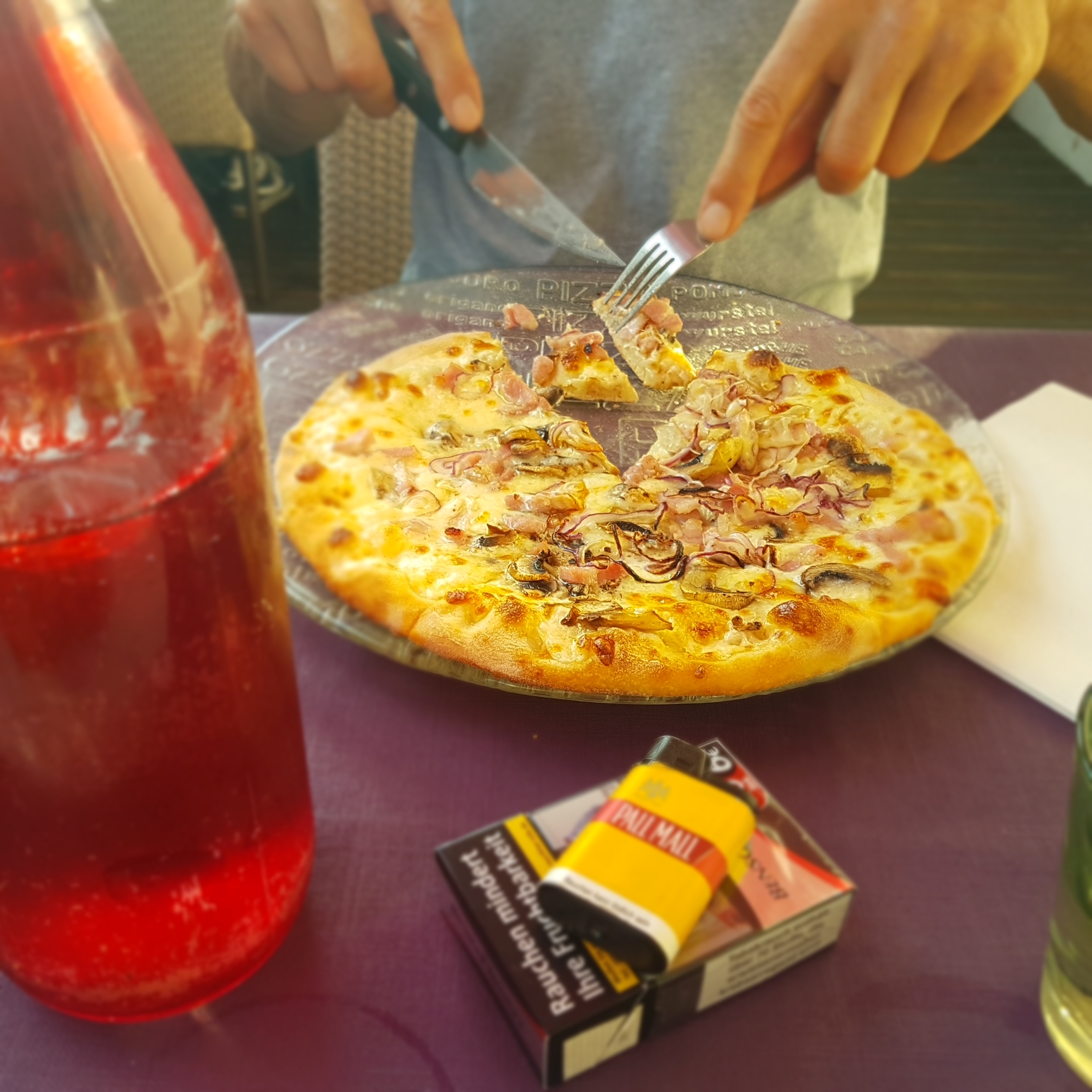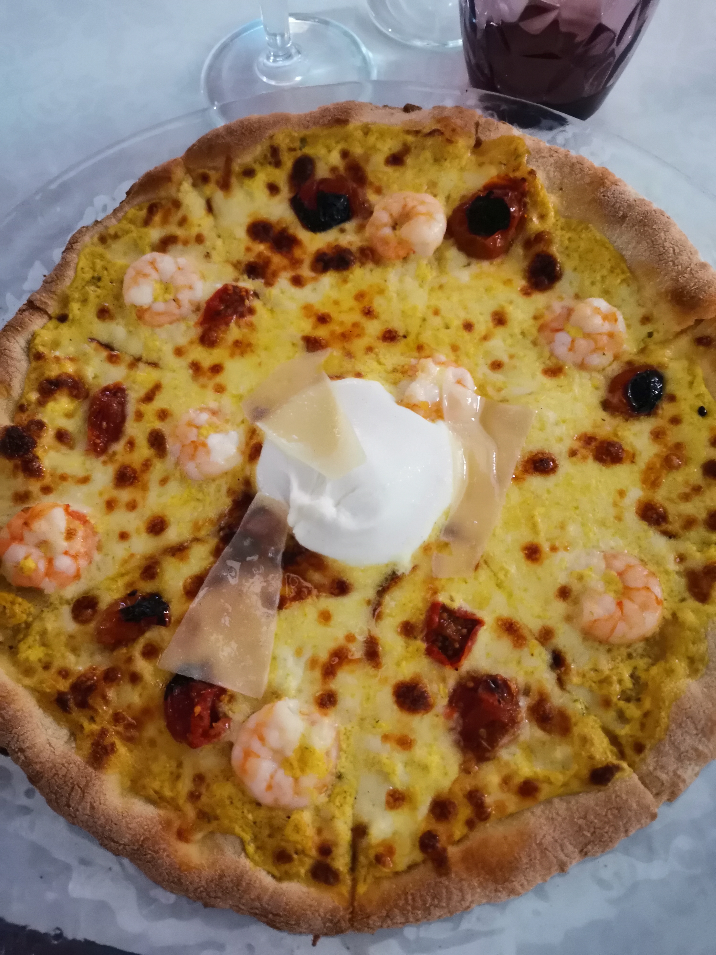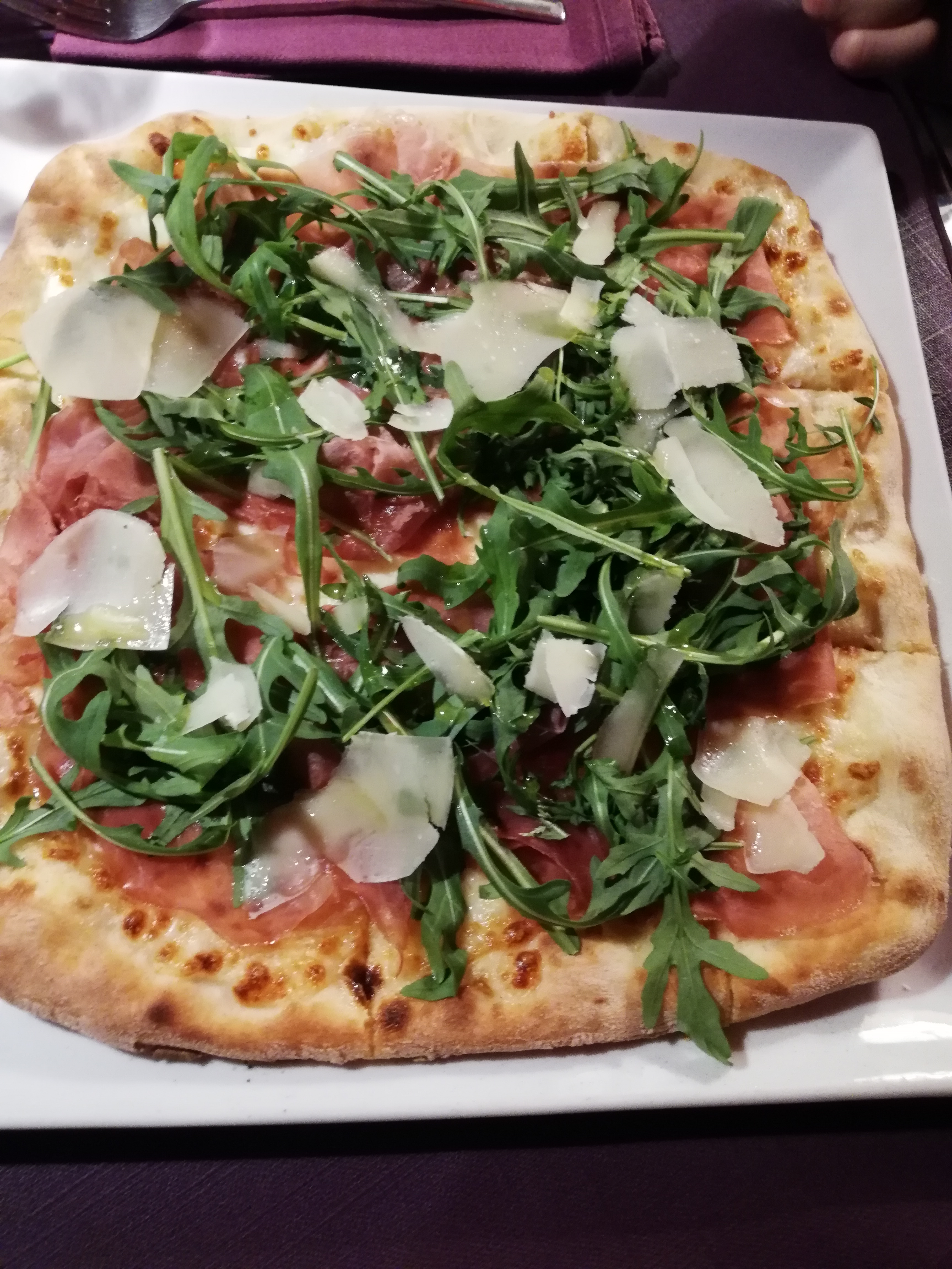 Pizza pas bien cuite, les ingrédients glisse sur la pâtes trop salé. Pizza précoupé en tranches car assiettes en verres transparente bombé non adapté donc difficile à couper. Prix excessif. Dommage.
