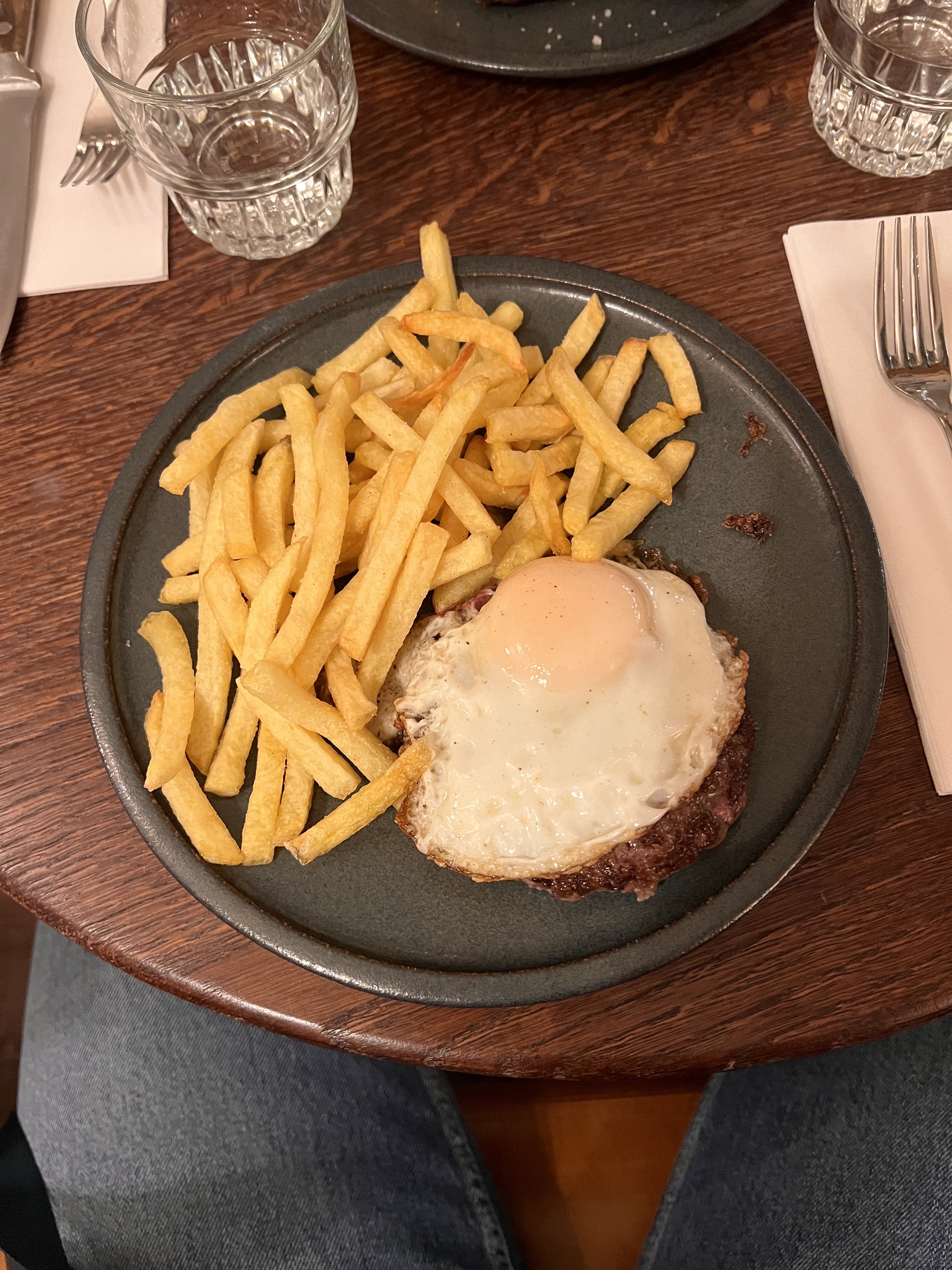 Très bon carpaccio de bœuf Les frites quoique noircies, sont succulentes Incontournable emplacement sur la charmante et trop fréquentée rue de l’Annonciation