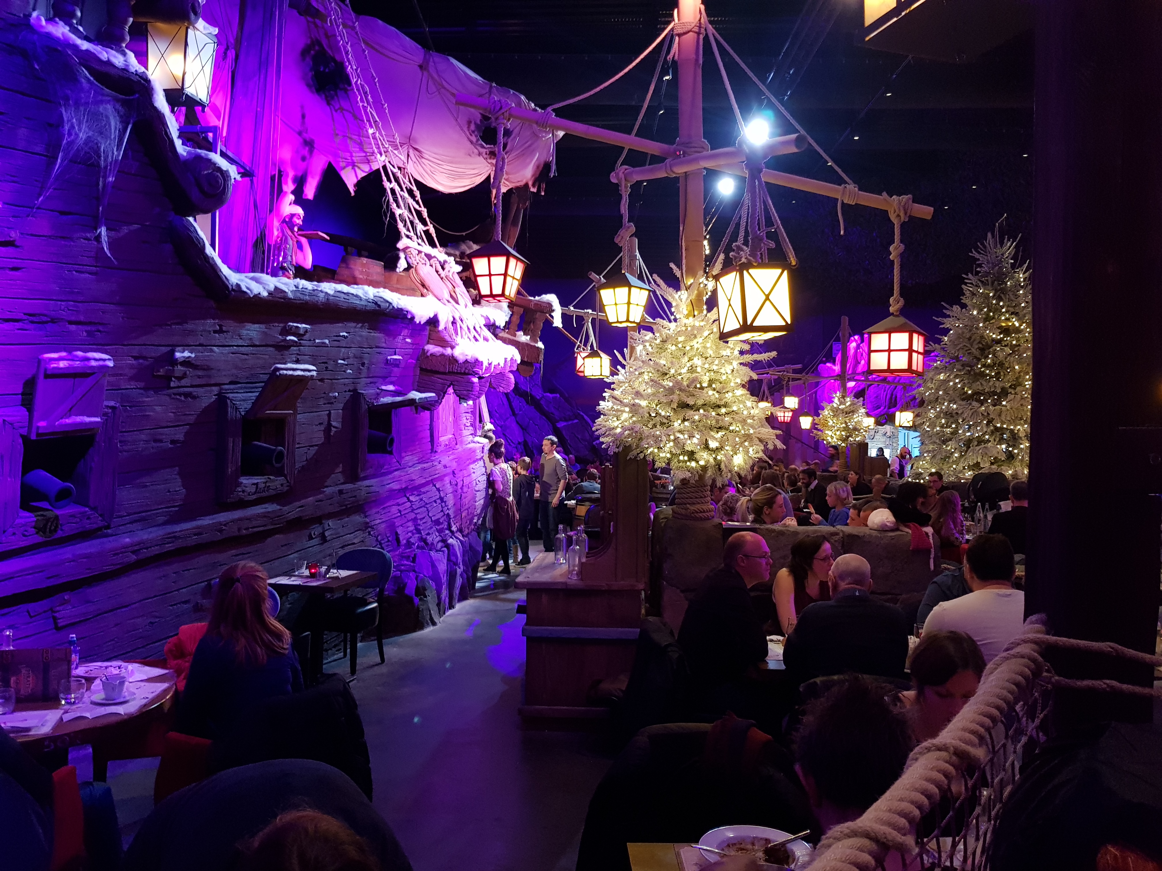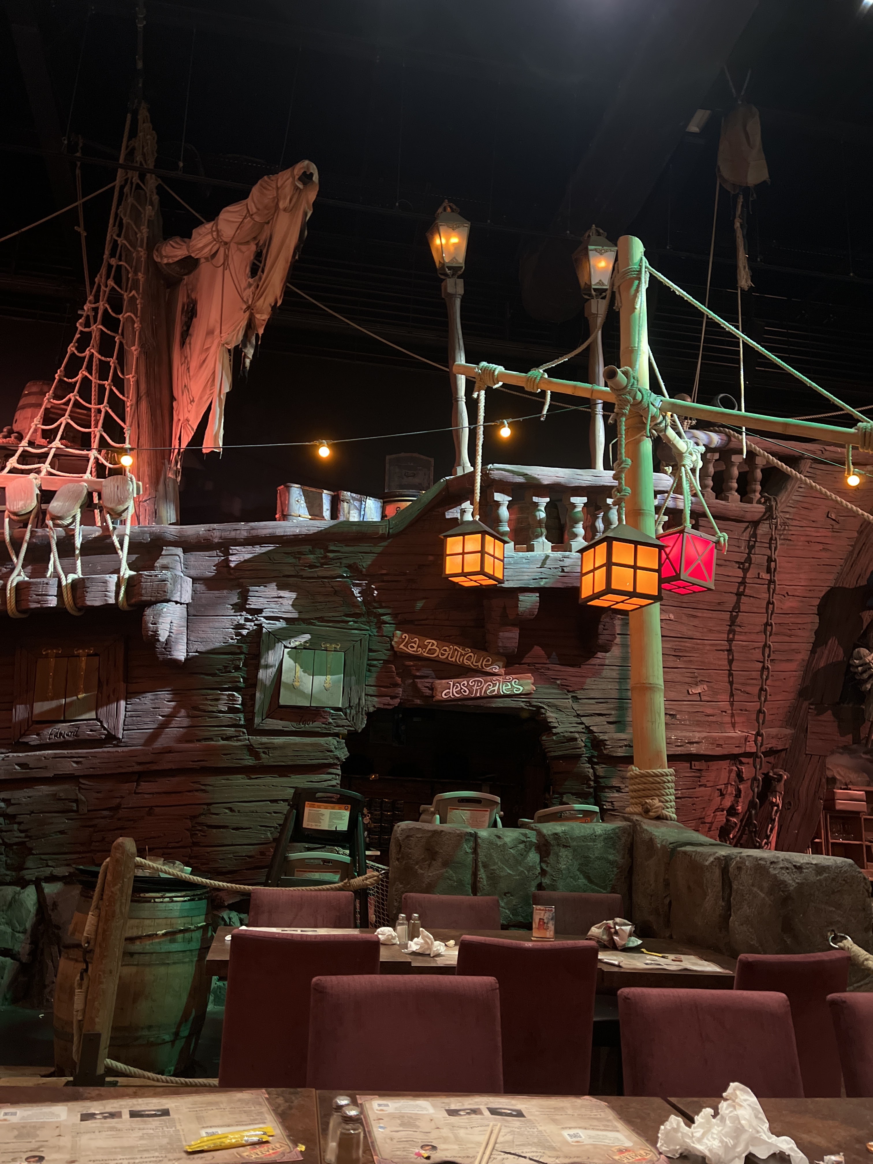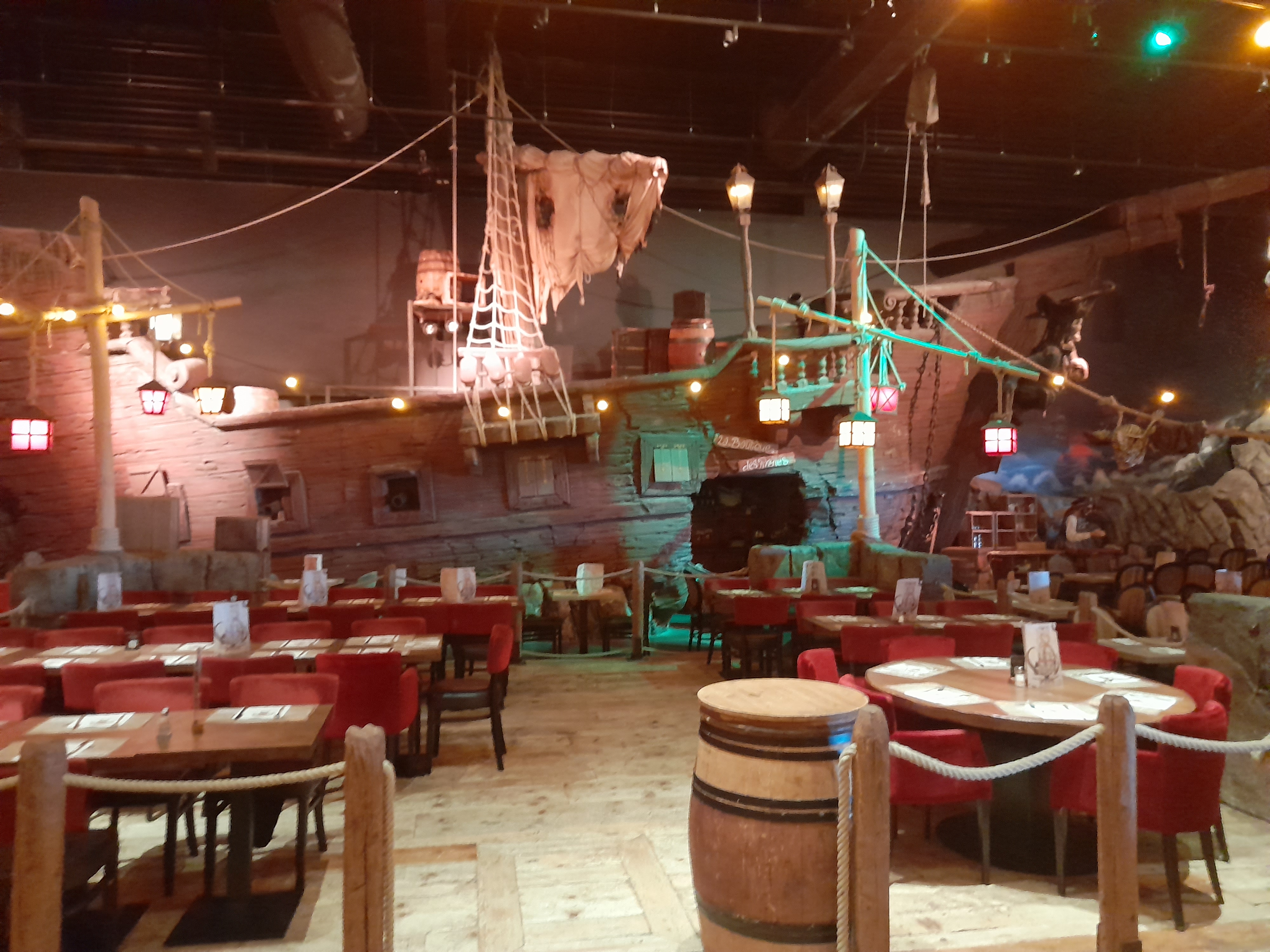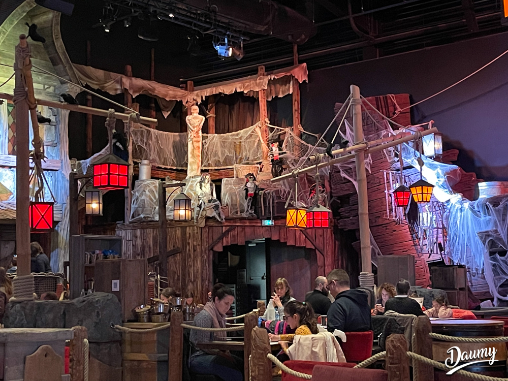 Un restaurant très immersif où l’on est embarqué dans la grande piraterie dès l’accueil. Le personnel joue très bien le jeu. Les serveurs sont souriants et accueillants. L’animation des cocktails boulets de canon est top. Le spectacle (qui doit durer à peu près 8min) est plutôt sympathique, les enfants fêtant leur anniversaire sont mis à contribution. Il y a un photographe qui est présent pour nous photographier dans le décor (12 euros la photo). La décoration des lieux est très belle. Le seul bémol concerne la qualité gustative du repas qui fut fade (type cantine scolaire). Ce n’était ni bon ni mauvais : juste correct, basique et nourrissant, sans plaisir gustatif particulier. Mais l’intérêt premier de ce restaurant reste l’ambiance avant tout.