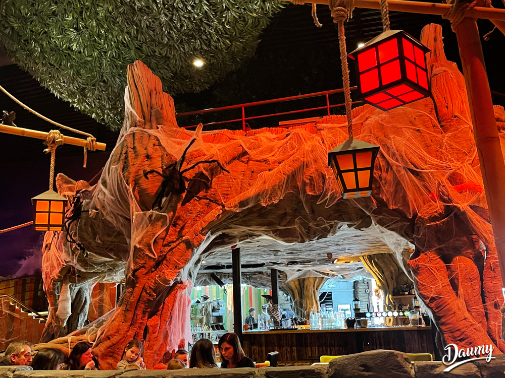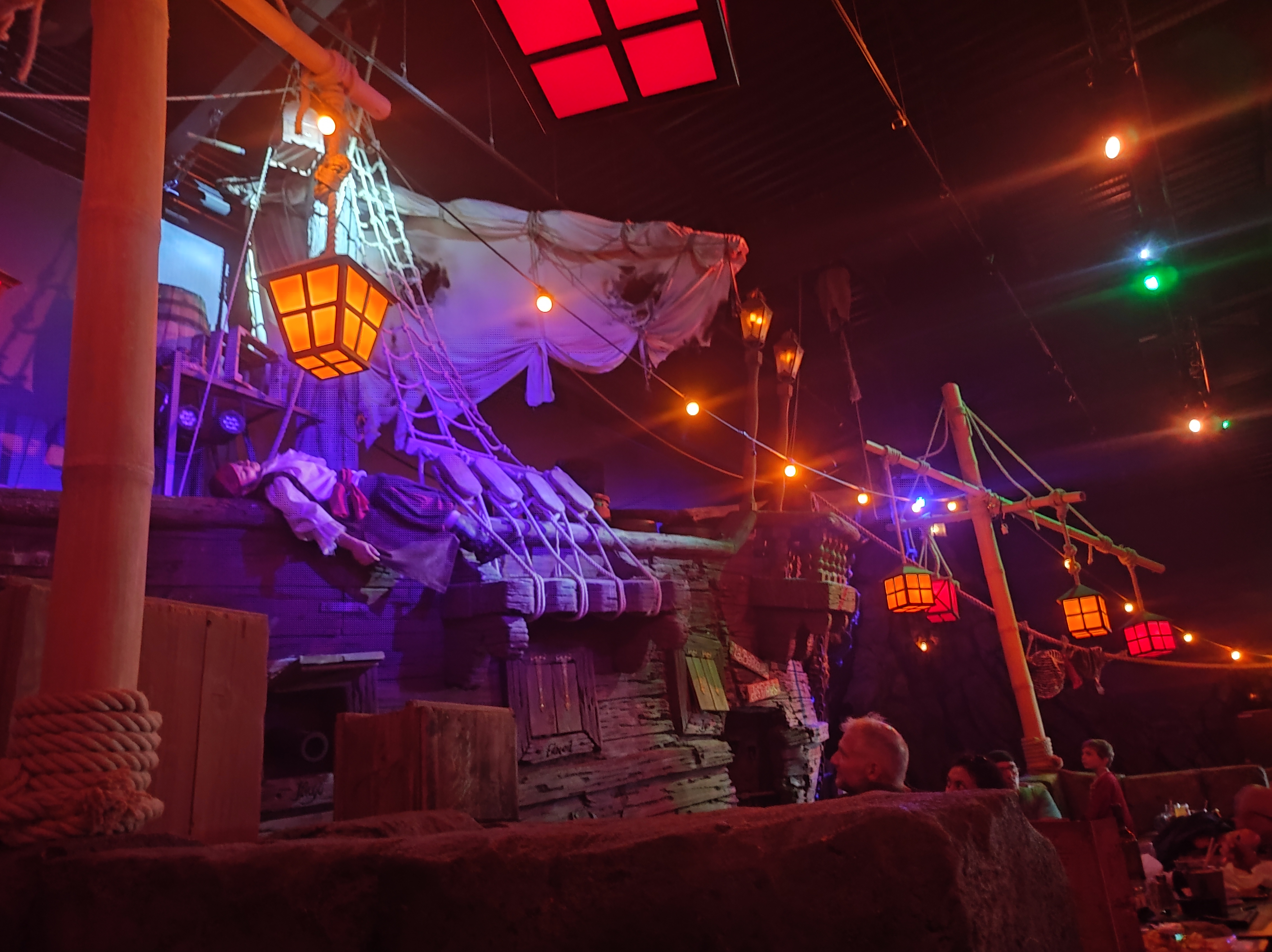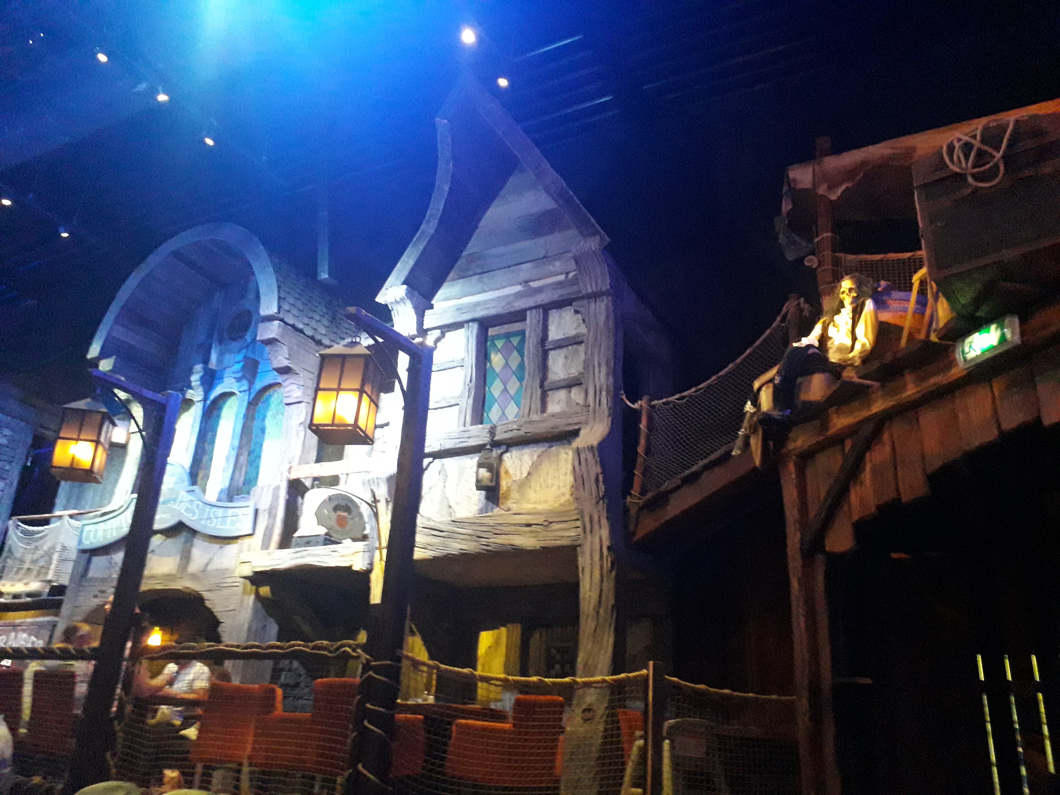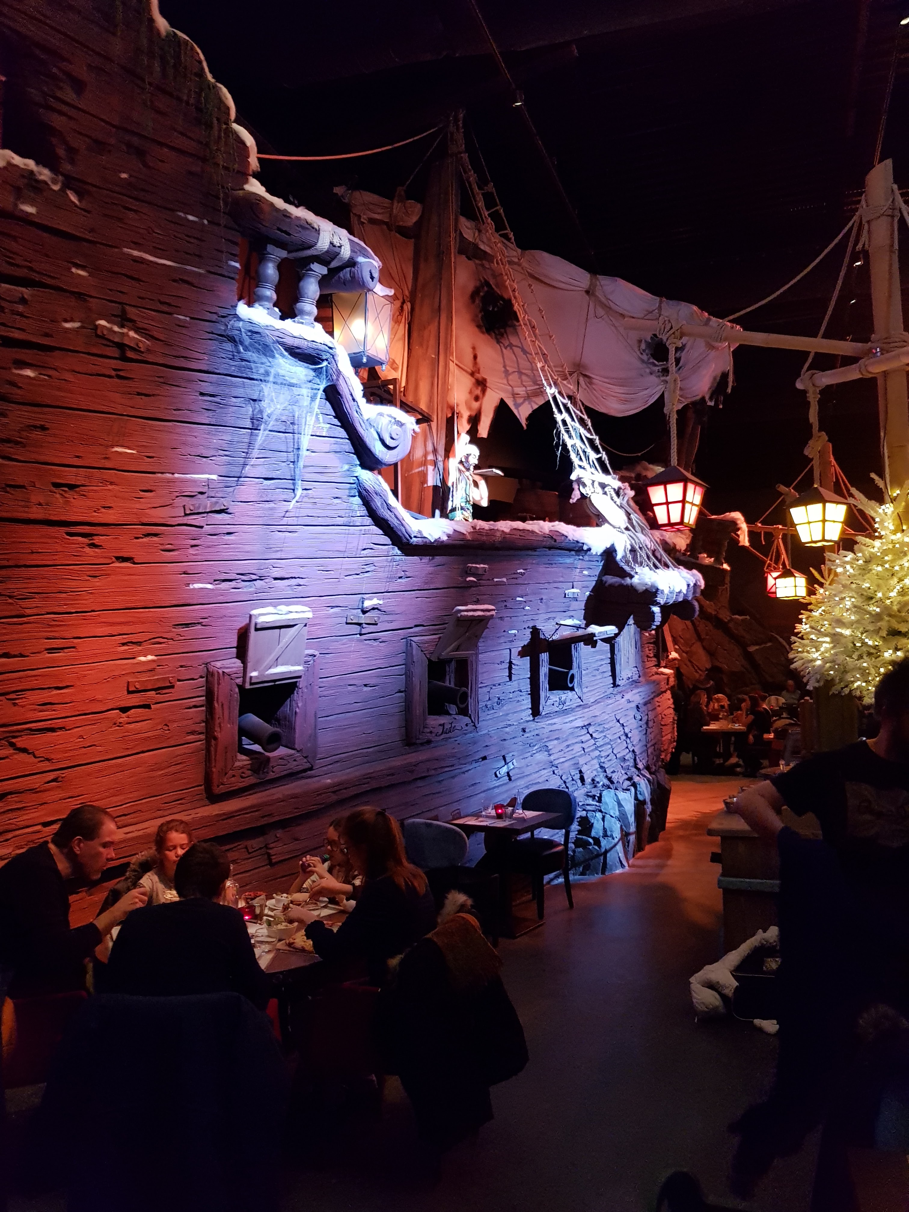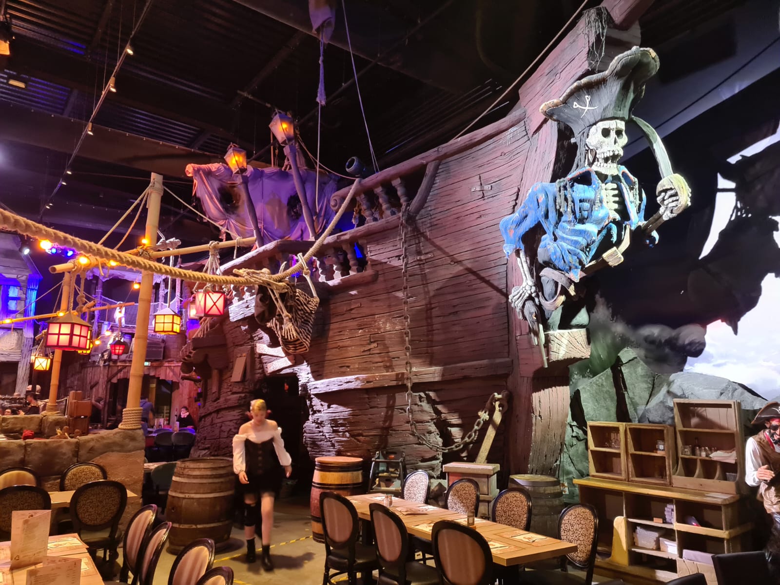 Un restaurant très immersif où l’on est embarqué dans la grande piraterie dès l’accueil. Le personnel joue très bien le jeu. Les serveurs sont souriants et accueillants. L’animation des cocktails boulets de canon est top. Le spectacle (qui doit durer à peu près 8min) est plutôt sympathique, les enfants fêtant leur anniversaire sont mis à contribution. Il y a un photographe qui est présent pour nous photographier dans le décor (12 euros la photo). La décoration des lieux est très belle. Le seul bémol concerne la qualité gustative du repas qui fut fade (type cantine scolaire). Ce n’était ni bon ni mauvais : juste correct, basique et nourrissant, sans plaisir gustatif particulier. Mais l’intérêt premier de ce restaurant reste l’ambiance avant tout.
