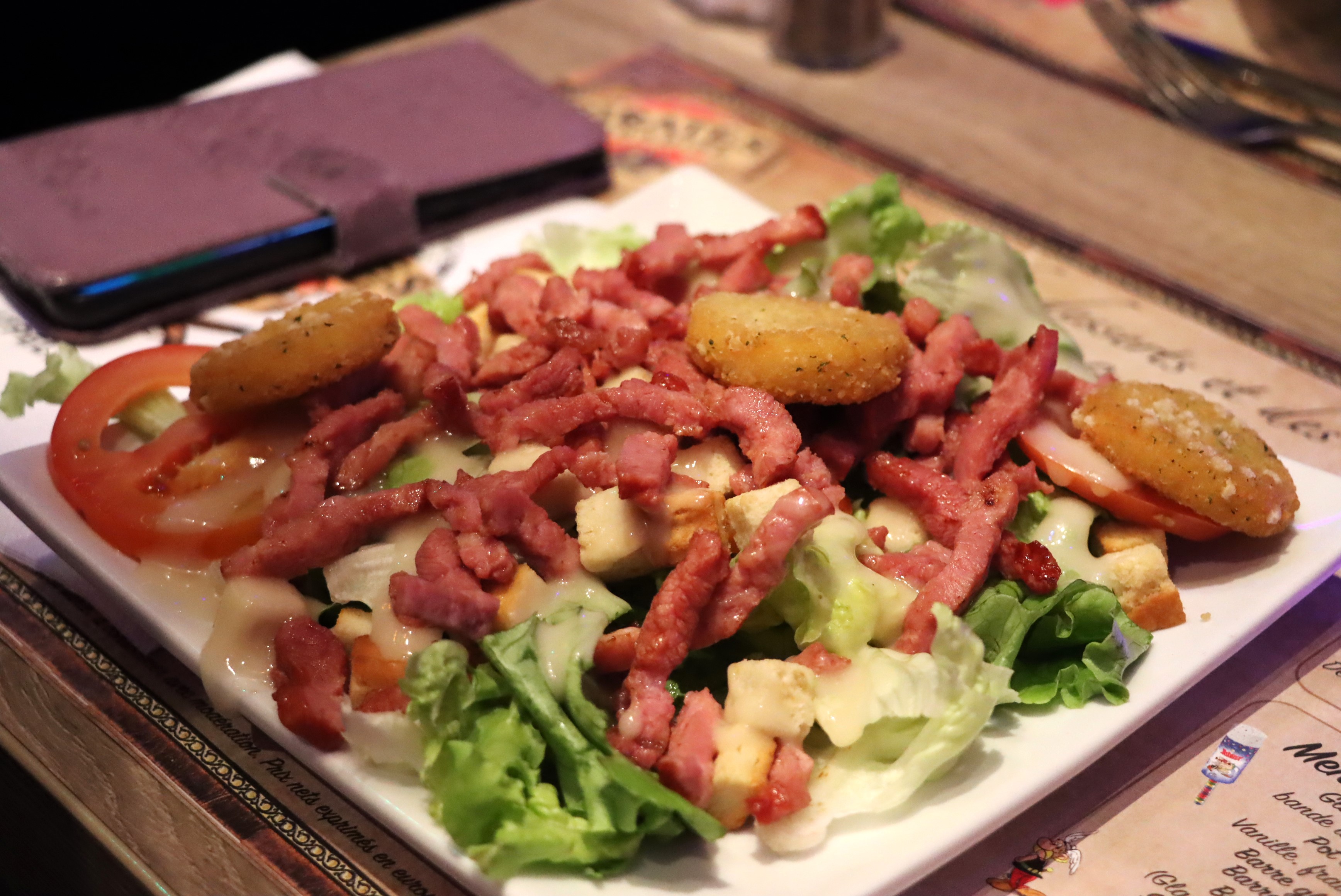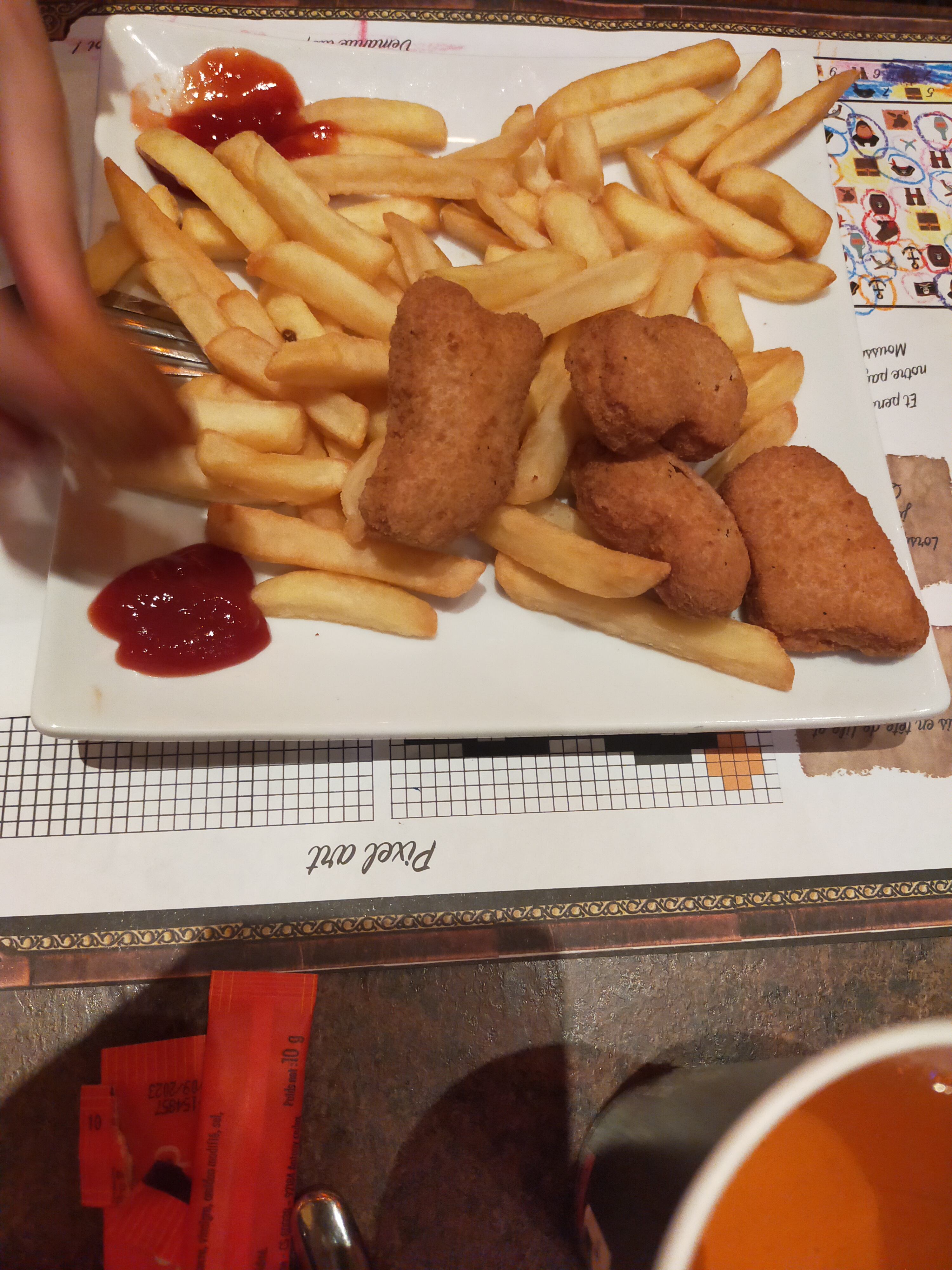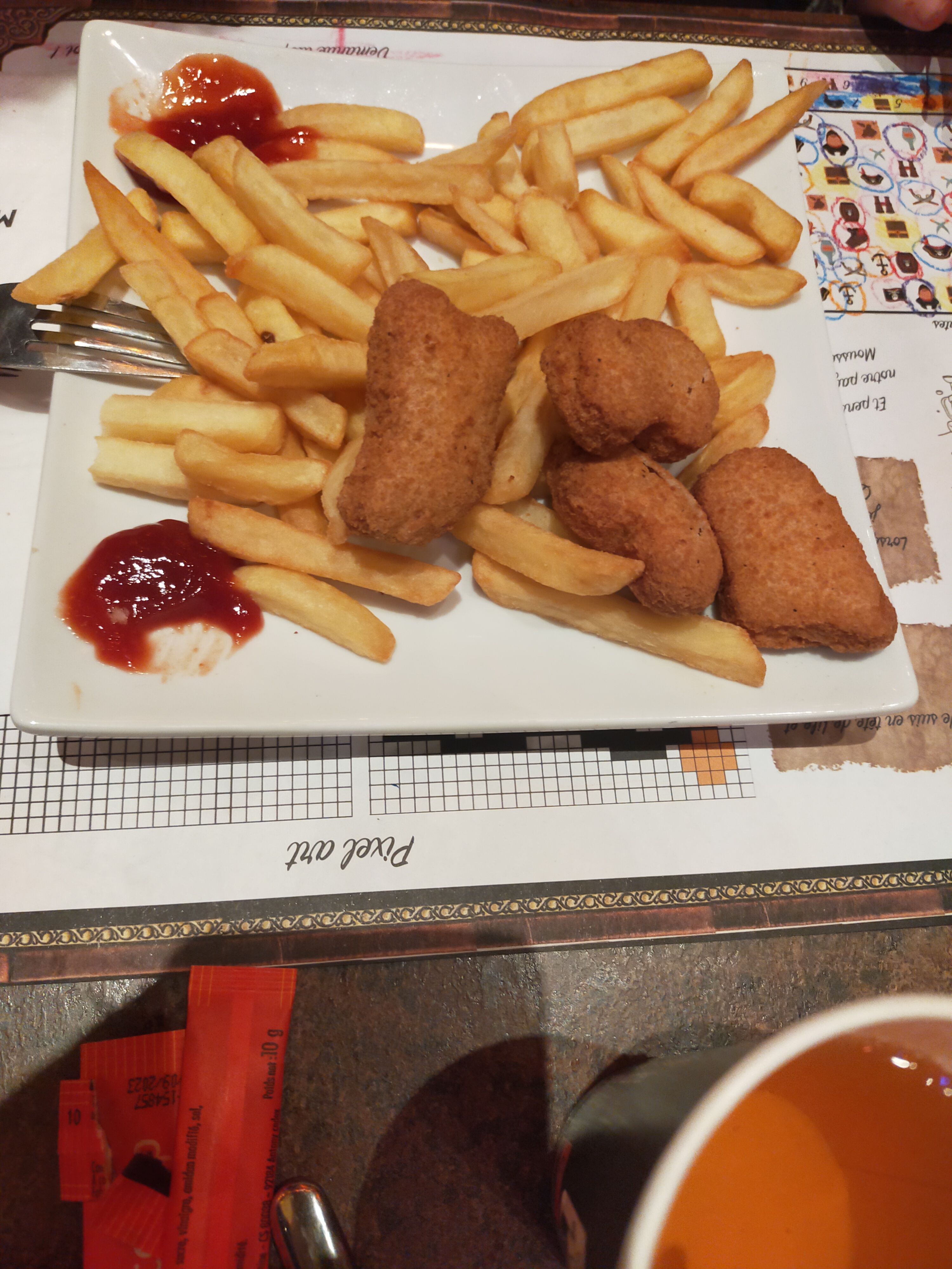 Restaurant niveau ambiance au top, c’est très immersif et nous avons vraiment apprécié, un bon moment pour retomber en enfance ! Niveau nourriture, j’aurais apprécié un peu plus de matière à manger… vraiment pas assez d’aiguillettes de poulet pour le prix… sinon le burger était bon, le co-magnon était au top et la salade bonne aussi. Cocktails et bières bonnes. Mais le vrai moins de la soirée était au moment de payer. Le pourboire qui s’affiche sur le TPE quand on insert la CB et qu’on se sent obligé de donner. Nous en laissons d’habitude, mais là le choix entre « 4, 5 (populaire) et 6 euros »… la serveuse n’a pas mérité 5€ mais on s’est senti un peu forcé car elle regardait ce qu’on choisissait en plus… Bon la prochaine fois, on sera moins pris au dépourvu et on donnera en liquide plutôt, ce sera mieux 🙂 donc conseil : prévoyez ça aussi ^^ Mais sinon très bonne soirée de passée.