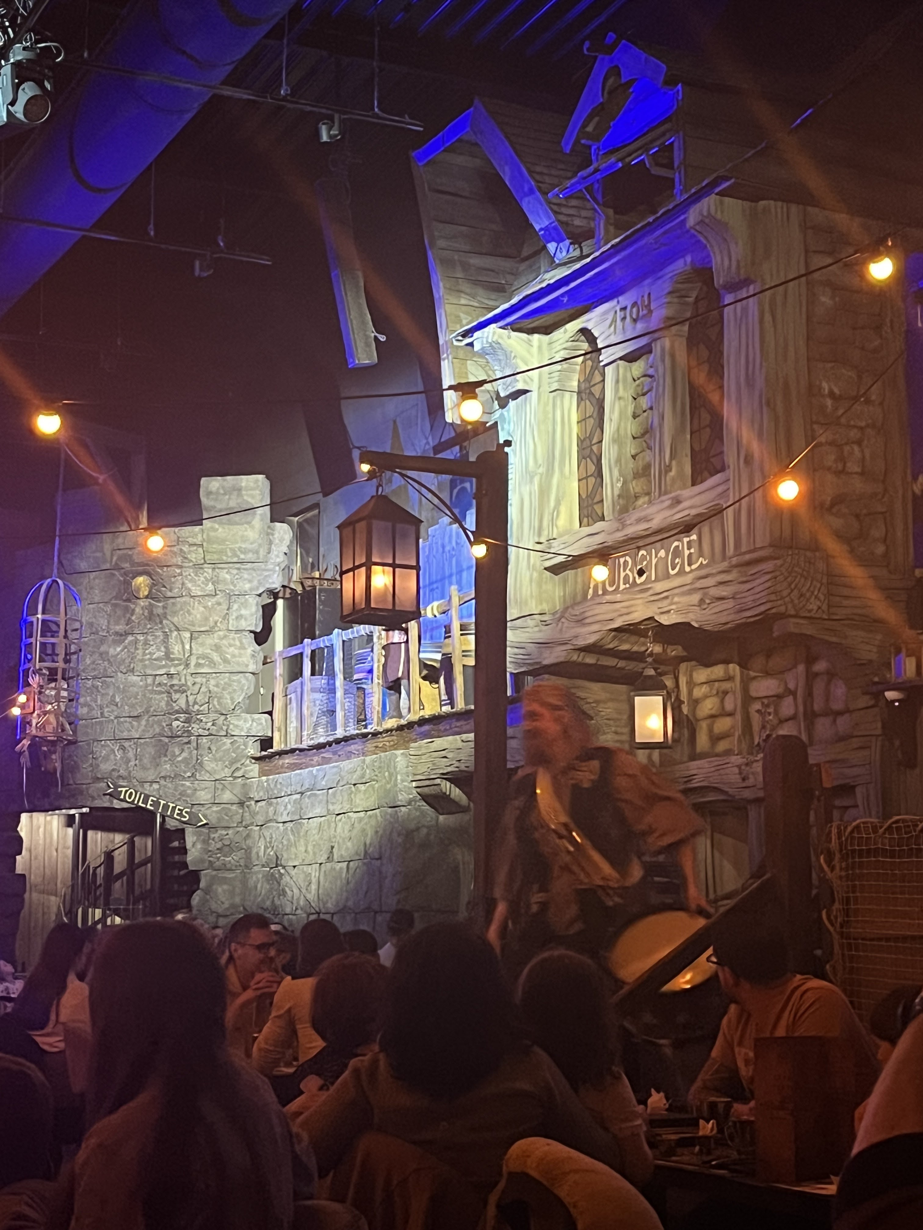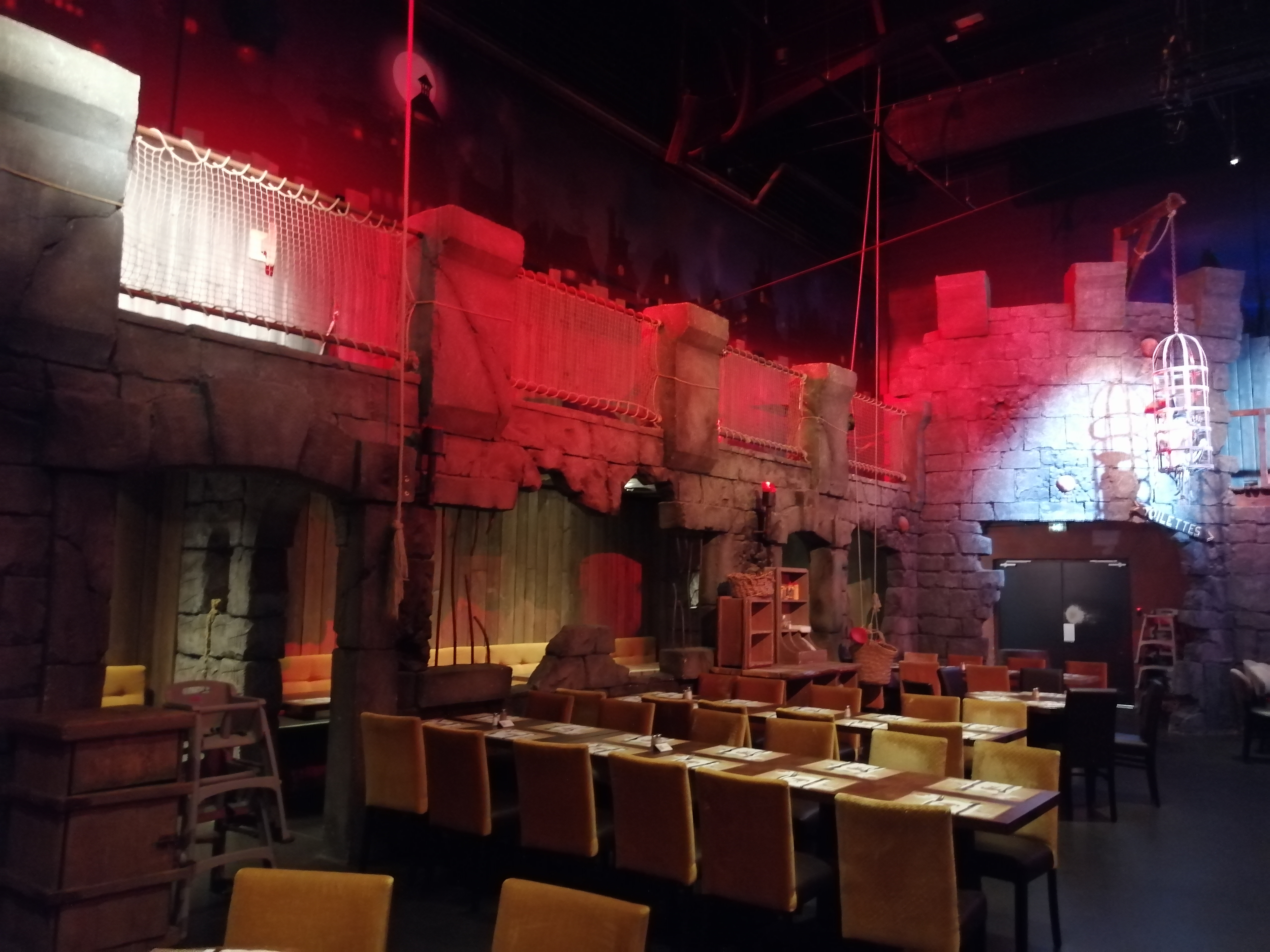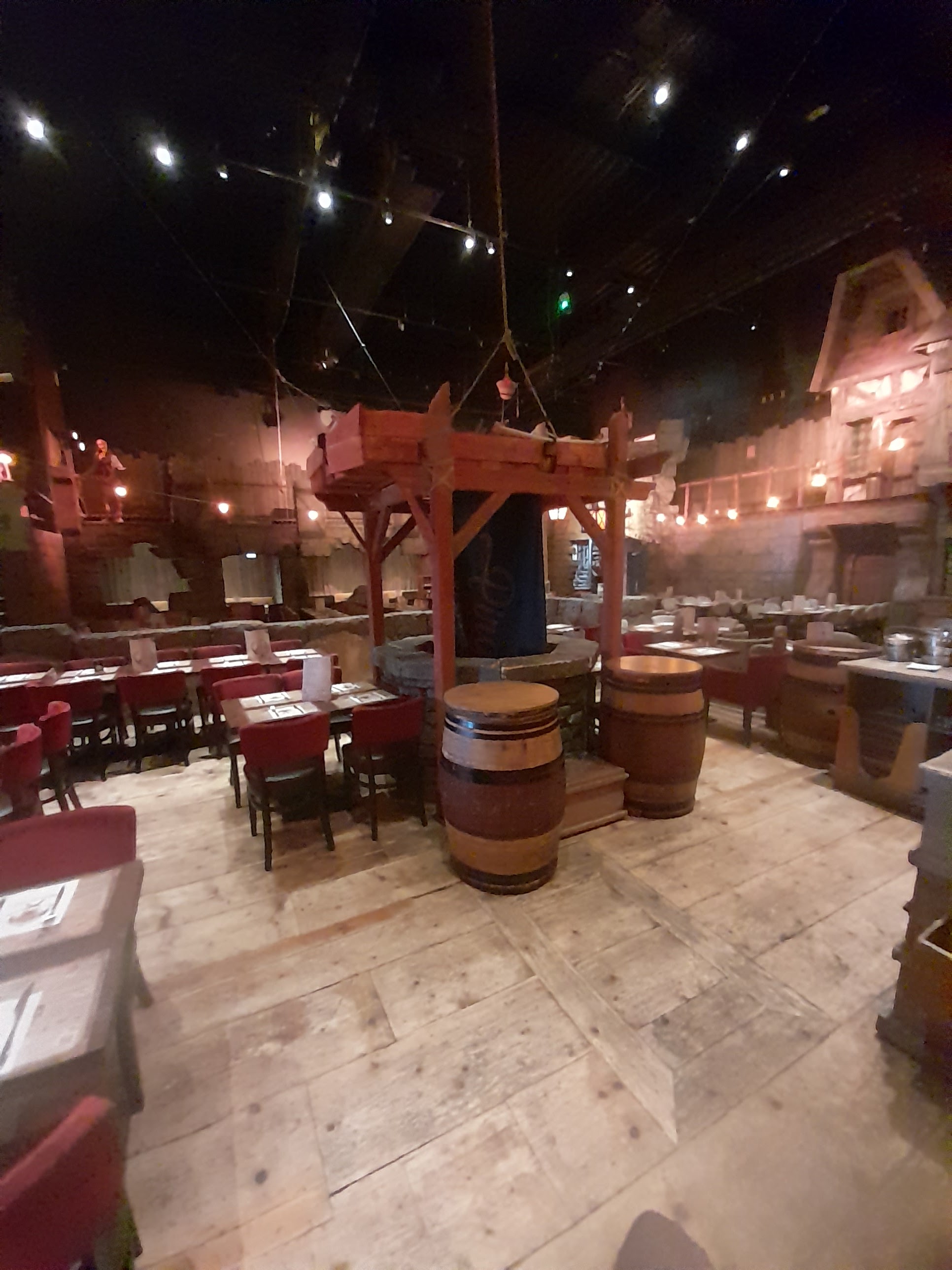 Restaurant à thème avec une belle ambiance et des décors très fournis. Le repas était plutôt bon dans être exceptionnel. Le prix est élevé mais c’est le côté thématique et le spectacle sont à prendre en compte dans la note. Justement le spectacle nous l’avons trouvé sympathique mais très court et pas vraiment de effets waouw. Il y a une très grande air se jeu apprécié pas les enfants. Tout est fait pour que les familles passent un bon moments mais également pour quelle y dépensent leur pièce d’or.