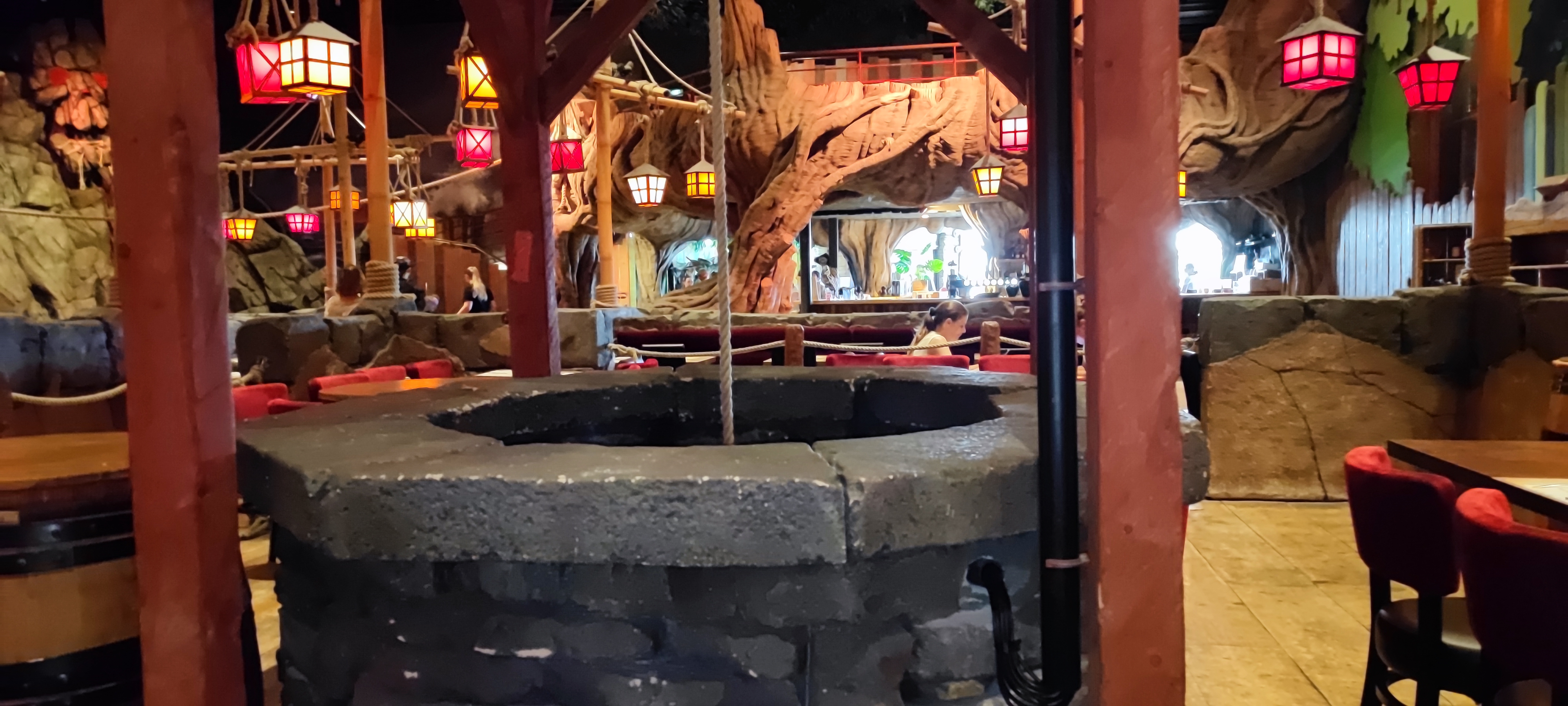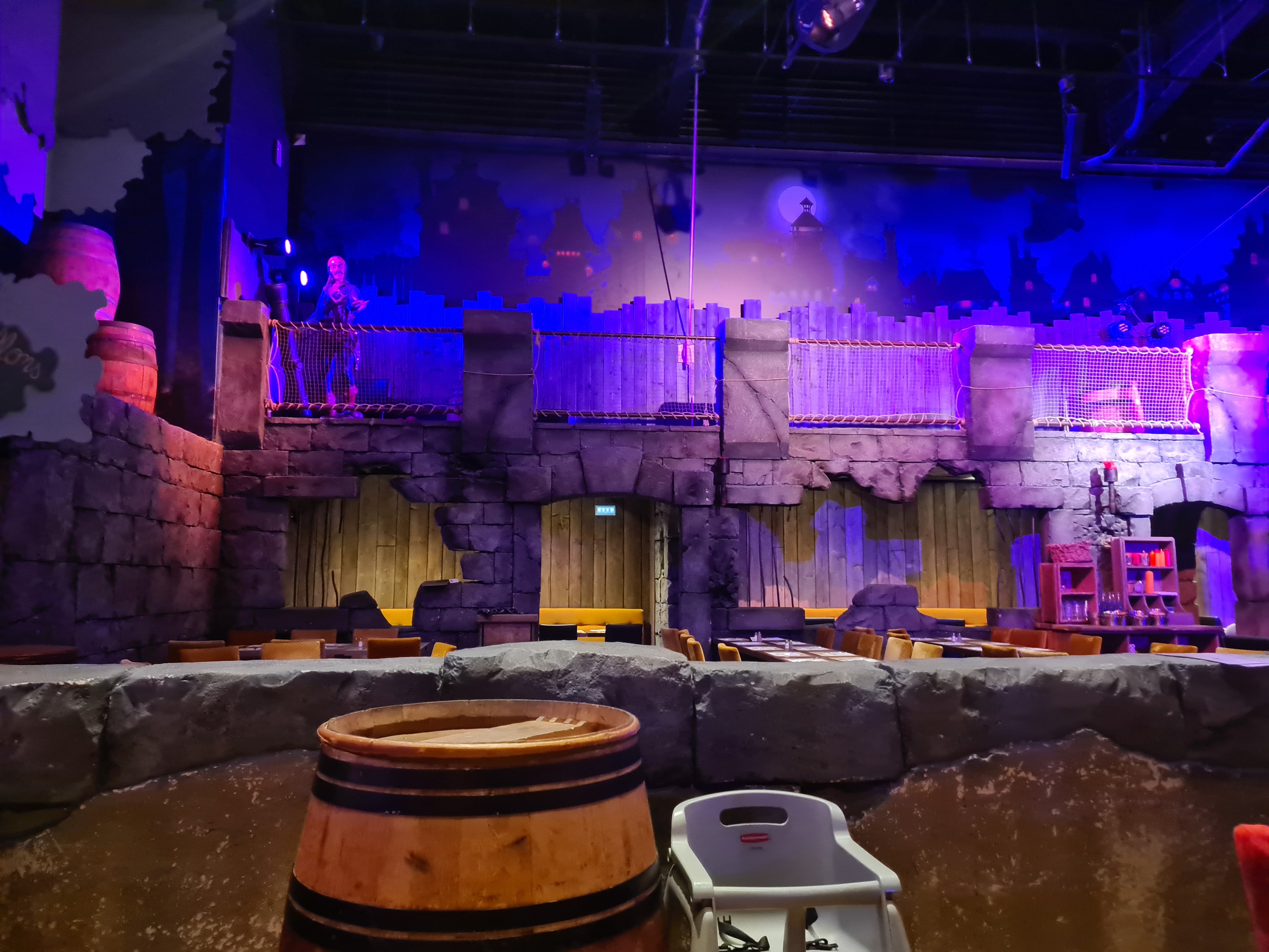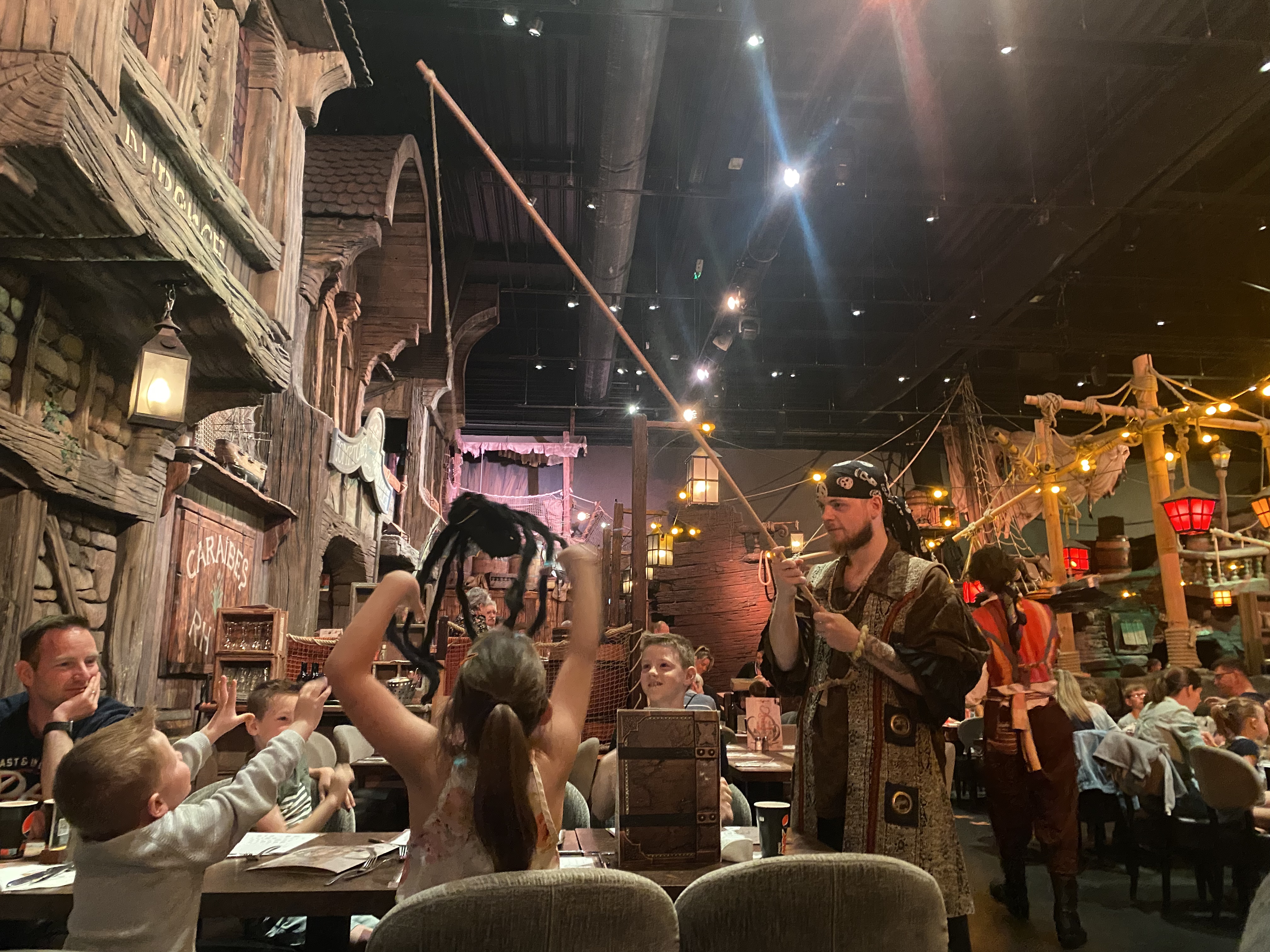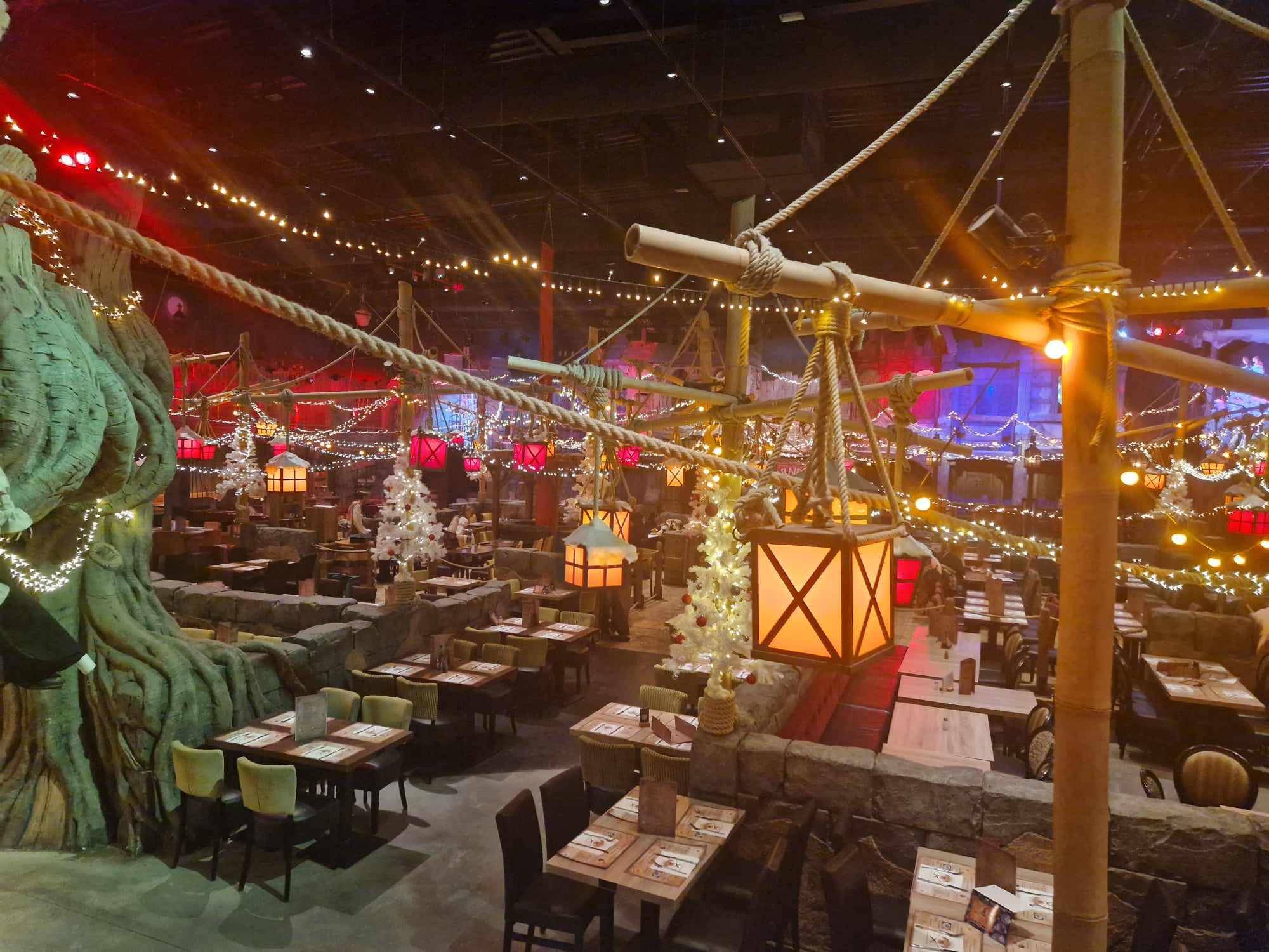 Restaurant à thème avec une belle ambiance et des décors très fournis. Le repas était plutôt bon dans être exceptionnel. Le prix est élevé mais c’est le côté thématique et le spectacle sont à prendre en compte dans la note. Justement le spectacle nous l’avons trouvé sympathique mais très court et pas vraiment de effets waouw. Il y a une très grande air se jeu apprécié pas les enfants. Tout est fait pour que les familles passent un bon moments mais également pour quelle y dépensent leur pièce d’or.