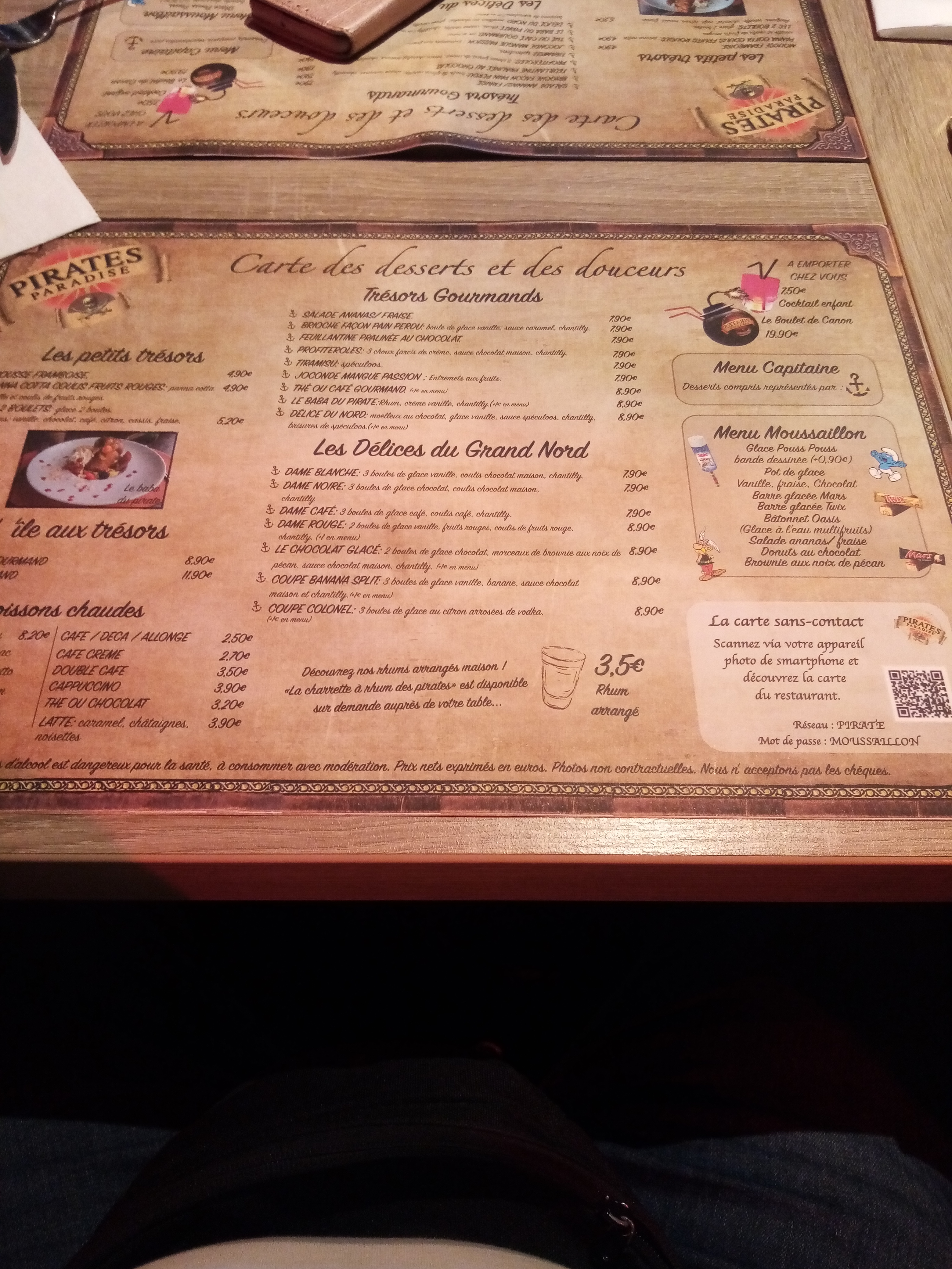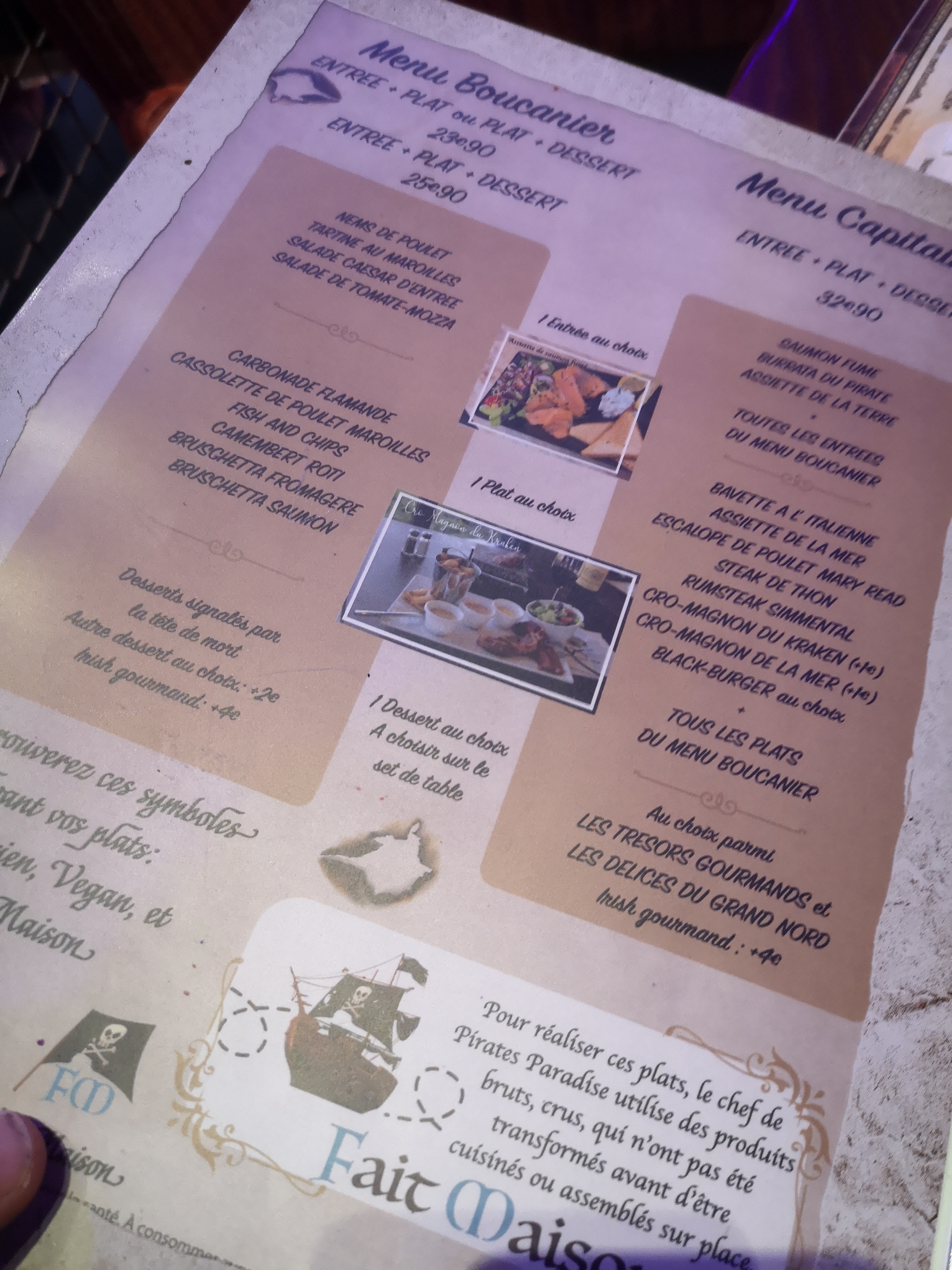 Lieu parfait pour les enfants ! Ambiance, serveurs et serveuses au top qui vous plongent dans leur univers. Petit spectacle simple mais qui ajoute un plus. Structure de jeux immense. Les parents se retrouvent dans une décoration magique et une immersion complète dans le monde des pirates ! Une très belle expérience à vivre ! Le menu avec le prix le plus élevé est à 29.90 hors boisson (entrée, plat et dessert) Les prix à la carte ne sont pas excessifs, et sont adaptés au repas, à la décoration et à l'ambiance.