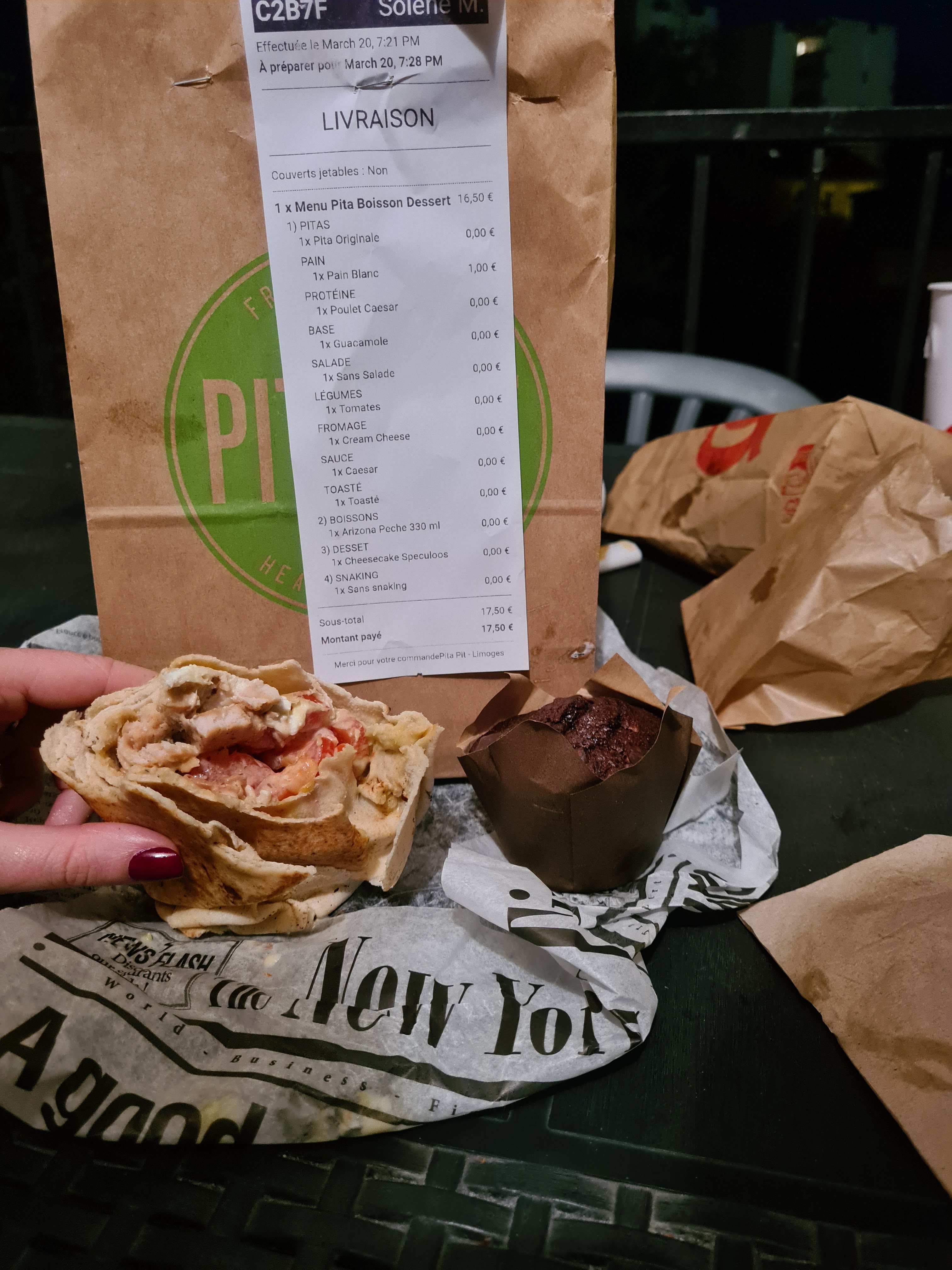 Commande pita pit sur uber eat on commande un cheesecake en dessert on a eu droit à un muffin Pita césar avec base guacamole mais je pense que le guacamole a du rester bloquer au Mexique