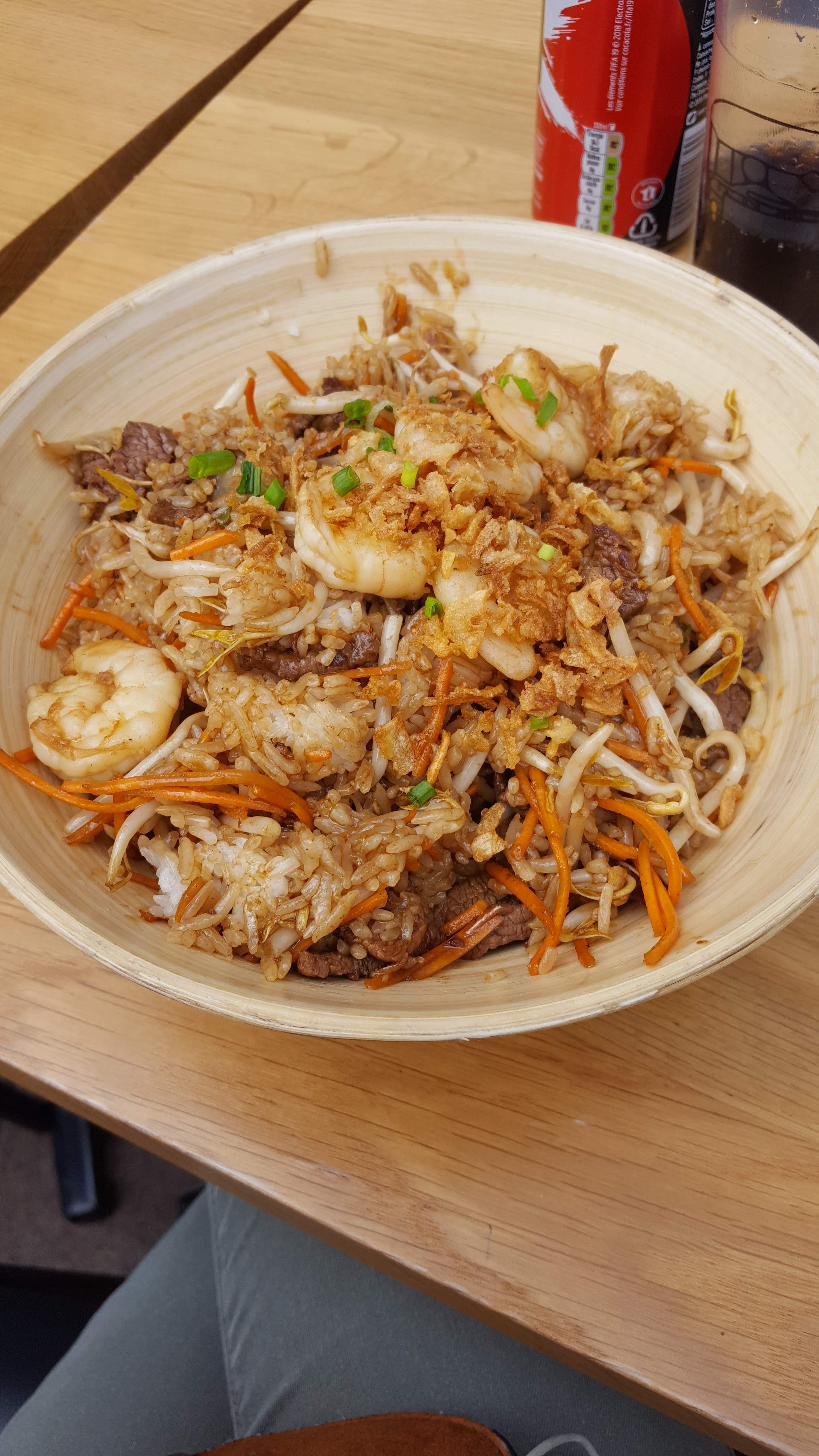 Découverte de ce restaurant pour la première fois. Service rapide et à table. Le plat était correct mais sans plus. Pour le même type de cuisine, on préfère le wok bar thaï qui est + copieux et d'un meilleur rapport qualité prix. On a mangé sur place et à l'intérieur car il pleuvait dehors. L'espace à l'étage est sympa mais manque de musique. On entend surtout le bruit de la clim. Celle ci ne couvre malheureusement pas toute la pièce et quand il fait 28 degrés dehors, on a vite assez chaud. Par ailleurs les tables n'étaient pas propres.