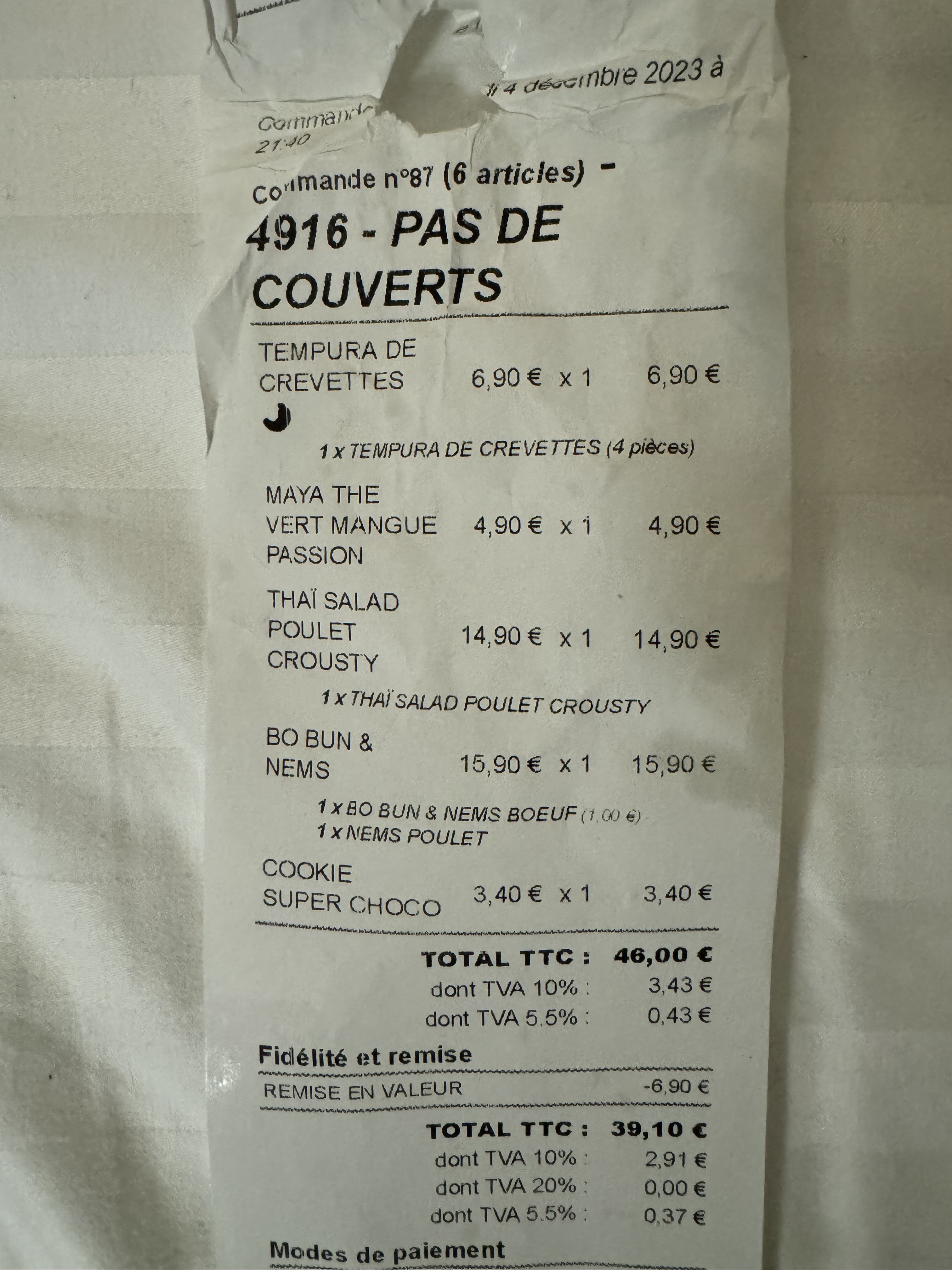 Ont oubliés les couverts sur une commande à emporter + oublient 2 boissons (à 2.90€ l’unité!) et je coupent pas le poulet, la prochaine fois j’irais manger des banzai noodles je serais mieux servi (Update) je viens de voir la réponse, j’ai modifié ma note car je me suis laissé emporté, Cdlt