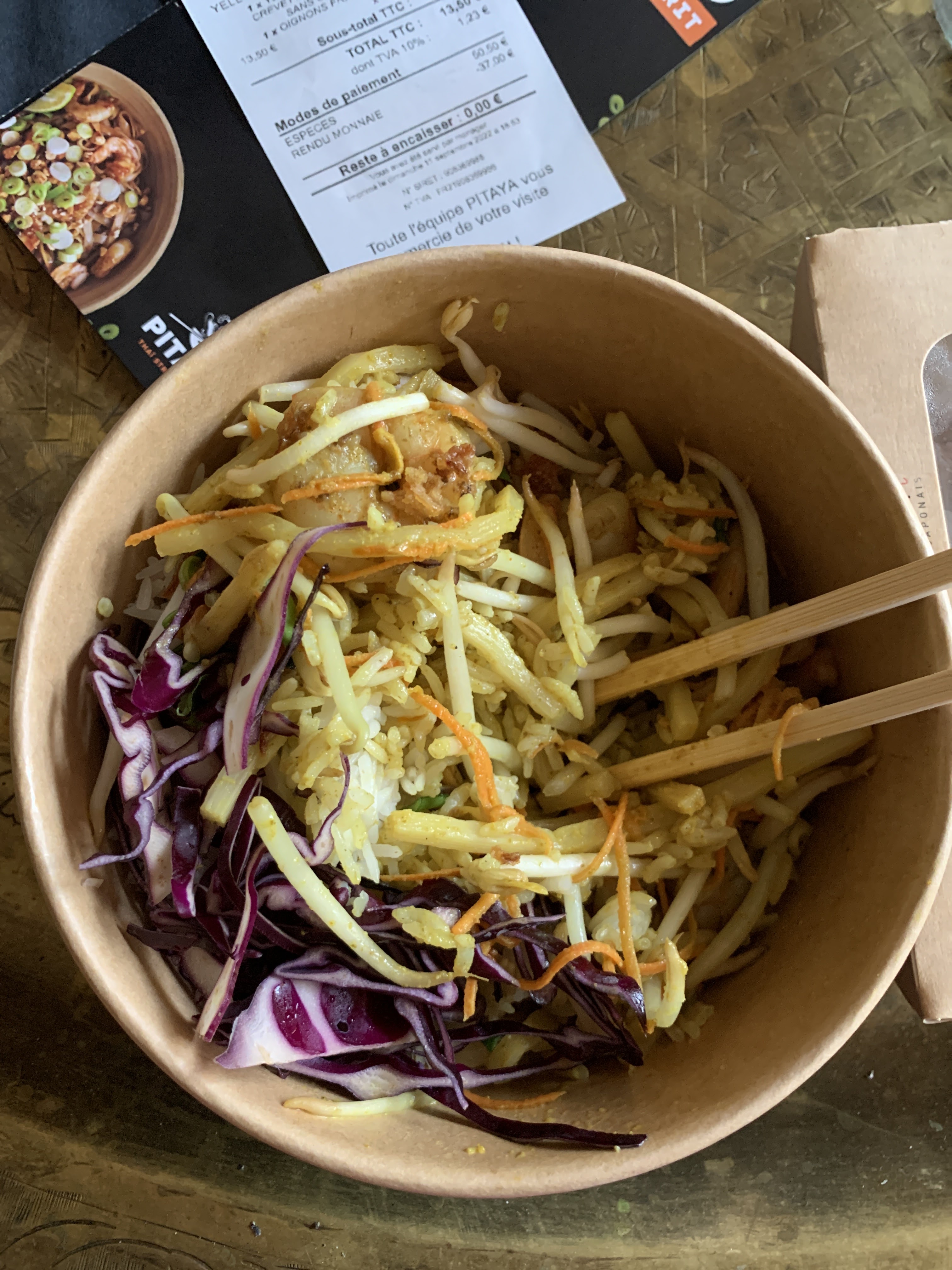 Médiocre! Je voulais tester ce nouveau resto à Créteil. J’ai demandé supplément oignons frits, je le cherche encore. Chou rouge défraîchis Les crevettes fades (avec supplément). Sauce curry jaune amère. Bref, je ne recommande pas du tout.