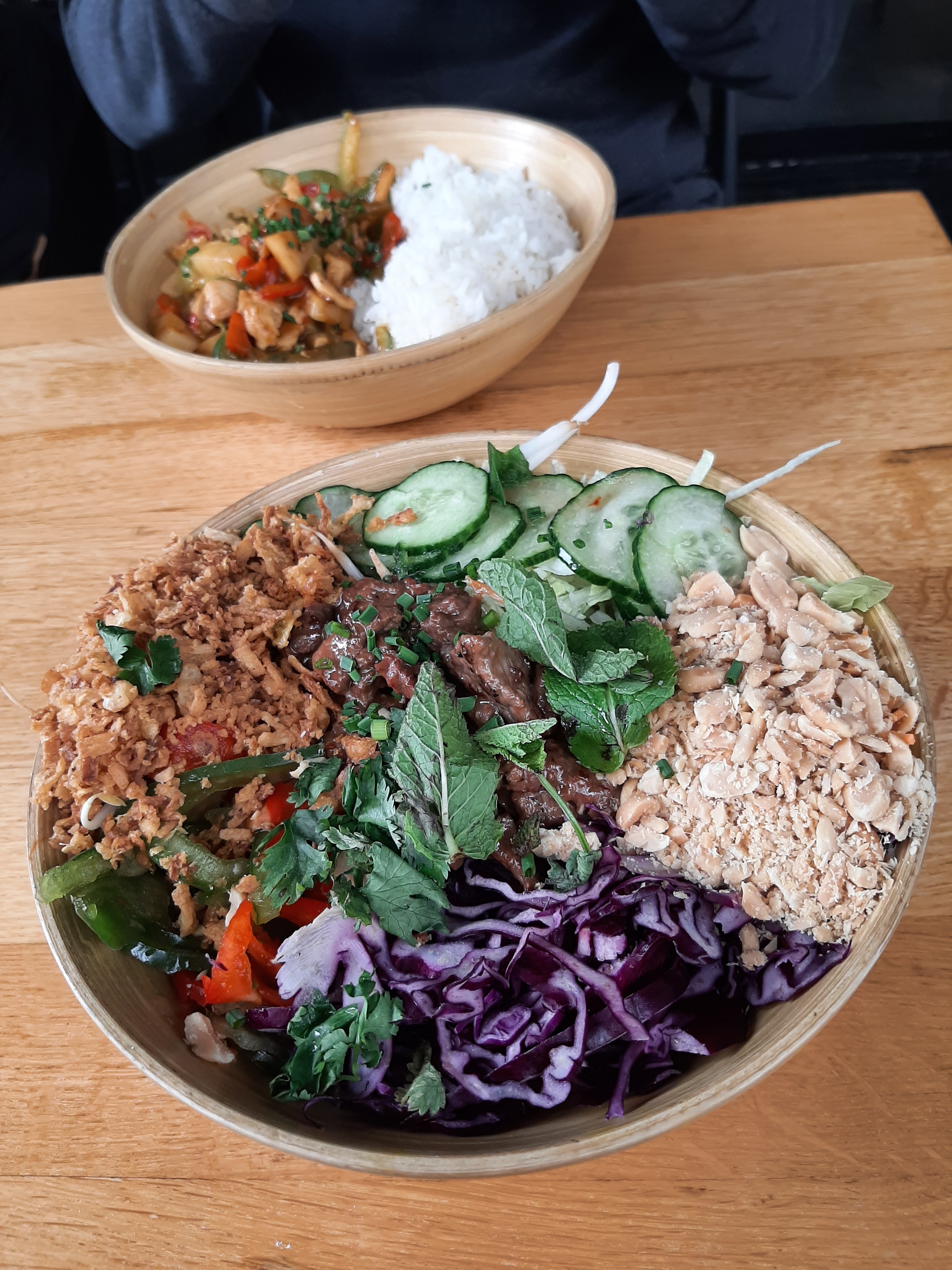 Personnel sympa, ingrédients frais et de qualité... Mais où est donc la sauce au curry ?! J'aurais dû me fier à la photo du menu, qui reflète en fait bien la réalité : un bol de riz (qui prend les 2/3 de la place) avec légumes + protéines. L'arôme du curry est très vague, alors qu'en Thaïlande, un curry, c'est d'abord une sauce généreuse agrémentée d'autres ingrédients ! Il faut clairement appeler ça un wok, comme les autres plats, et pas un curry.
