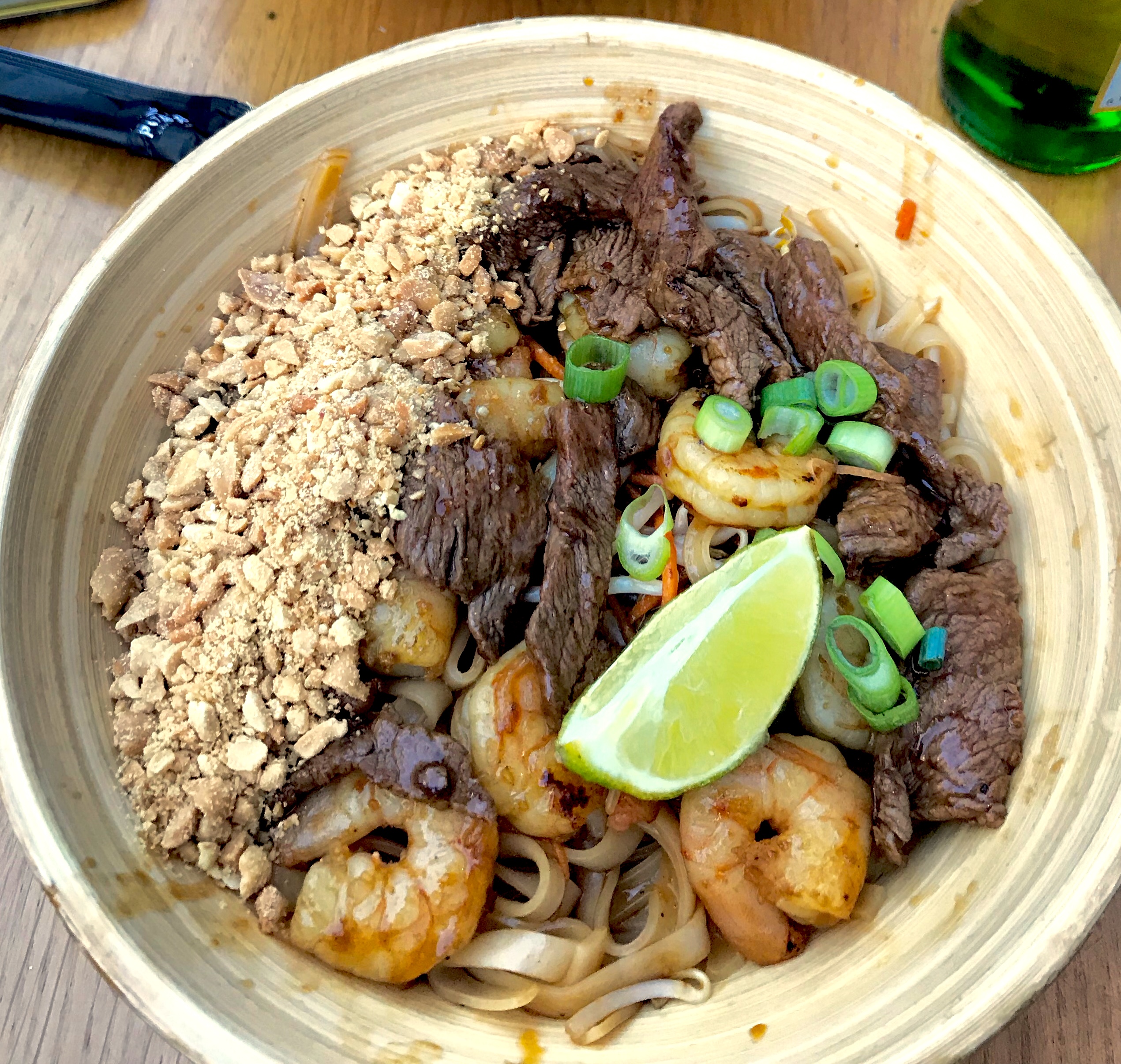 Plats de bonne qualité pour ma part il s'agissait du pad thaï. En revanche un service médiocre il ne faut pas s'attendre à avoir les pieds sous la table ici, c'est à vous d'aller demander la carte, d'aller passer votre commande au bar mais surtout à vous de faire votre doggybag bref en gros le client doit se débrouiller seul et ne peux pas compter sur les serveurs. Pour de nouveaux clients rien n'est expliqué vous pouvez attendre très longtemps avant de comprendre que vous devez tout faire. Il pourrait s'agir d'un concept original mais cela devrait être clairement expliqué au client lorsqu'il s'installe sur une table. Toutefois les saveurs de mon plat mon fait voyager. Mais je vous conseil de prendre à emporter à cause du service, qui est à revoir.