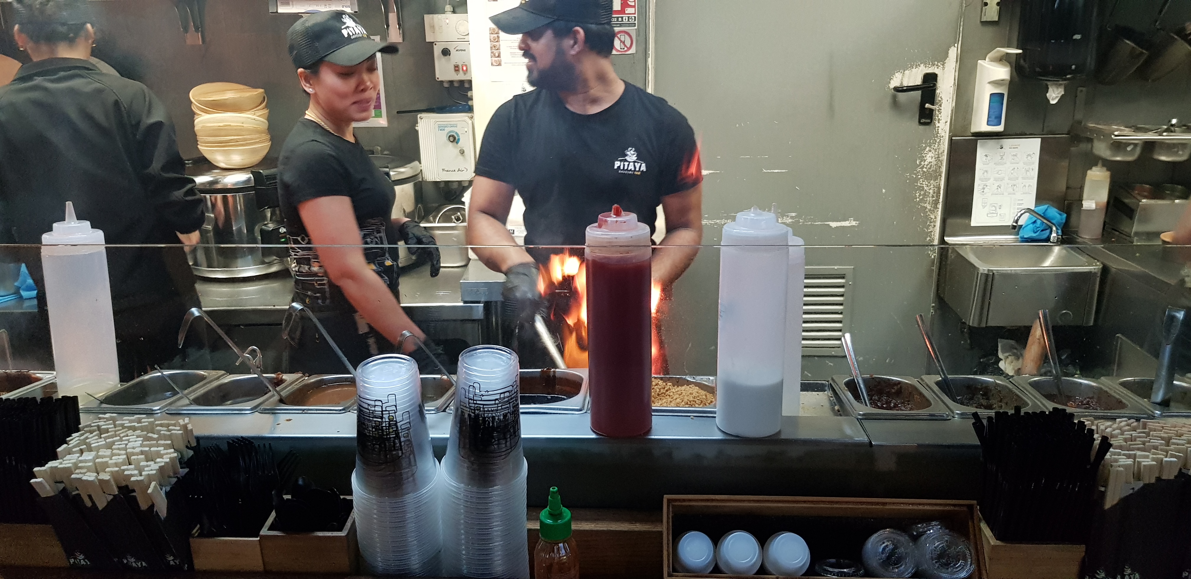 Agréablement surpris ;Accueuil chaleureux ; restaurant bien entretenu qui nous fais voyager en Asie . Concernant le service nous avons eux le droit à un prenneur de commande qui a su nous conseiller et nous orienter vers ce que nous voulions . Délai d'attente très raisonnable vu la queue ( moins de 10 minutes ) La préparation a été faite sous nos yeux AVC une visibilité sur les cuisiniers Merci a L'équipe Pitaya