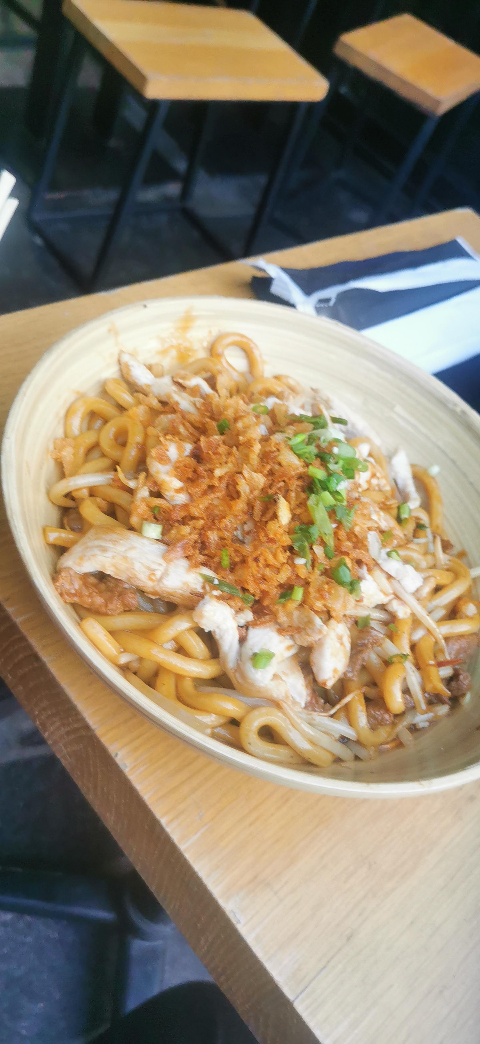 Super déçue ce soir . Nua kao hyper salé et viande dure comme de la semelle , impossible de terminer . Table et banc collant . Le personnel est sympathique mais malheureusement ça ne suffit pas.