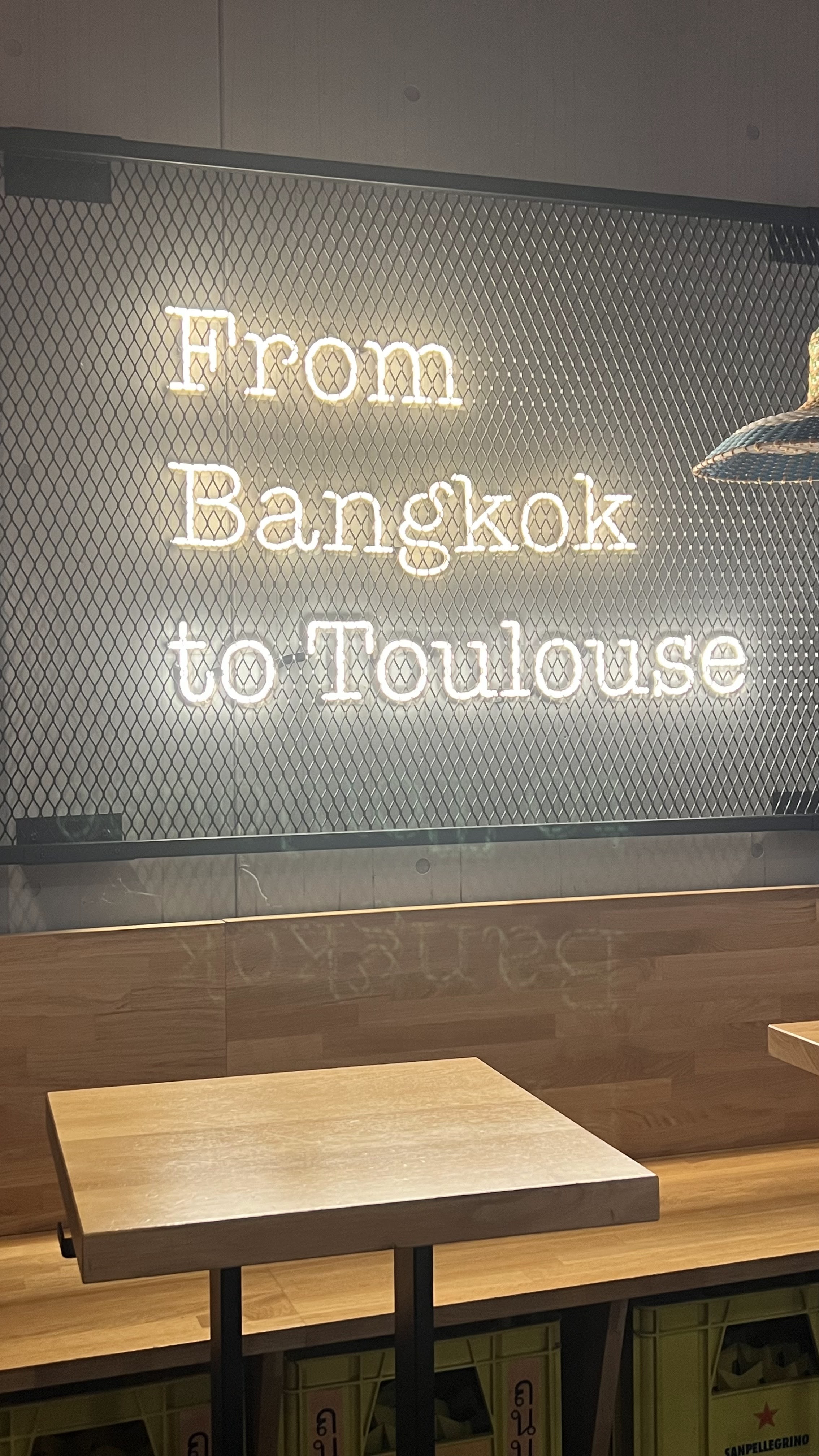 Personnel sympathique, carte fournie mais ça s'arrête là. Rien a signaler sur l'ambiance, j'ai mangé chez moi. Pour moi ce type de restauration n'a de thaï que le nom. Mettre du soja, des cacahuètes et des pousses de haricots ne suffit pas a faire un plat thaï... Si les prix n'étaient pas exorbitants pour ce qui est servi (peu de protéine, quasiment que des pâtes/riz, avec n'importe quel plat aux alentours de 13€ en moyenne) j'aurai mis une meilleure note mais la sincèrement je pense que cette enseigne profite d'avoir pignon sur rue et d'utiliser la mention street food thaï, rien de plus. Perso j'ai pris un bobun, j'avais 2 petits nems coupés en deux dedans. Plus que décevant. Les goûts ne sont pas mauvais en soi, mais il n'y a ni la profondeur, ni les saveurs des herbes que l'on est en droit d'attendre en mangeant thaï. Je ne renouvellerai pas l'expérience. Pour les amateurs de thaï, passez votre chemin, un restau sur la place de l'église de Blagnac fait mieux pour un prix similaire. Pour ceux qui ont la dalle, ça devrait vous convenir. Pour ceux qui sont pressés de manger, prenez un bestof Big Mac au MacDo un peu plus haut sur l'avenue, vous vous en tirerez pour moins cher.