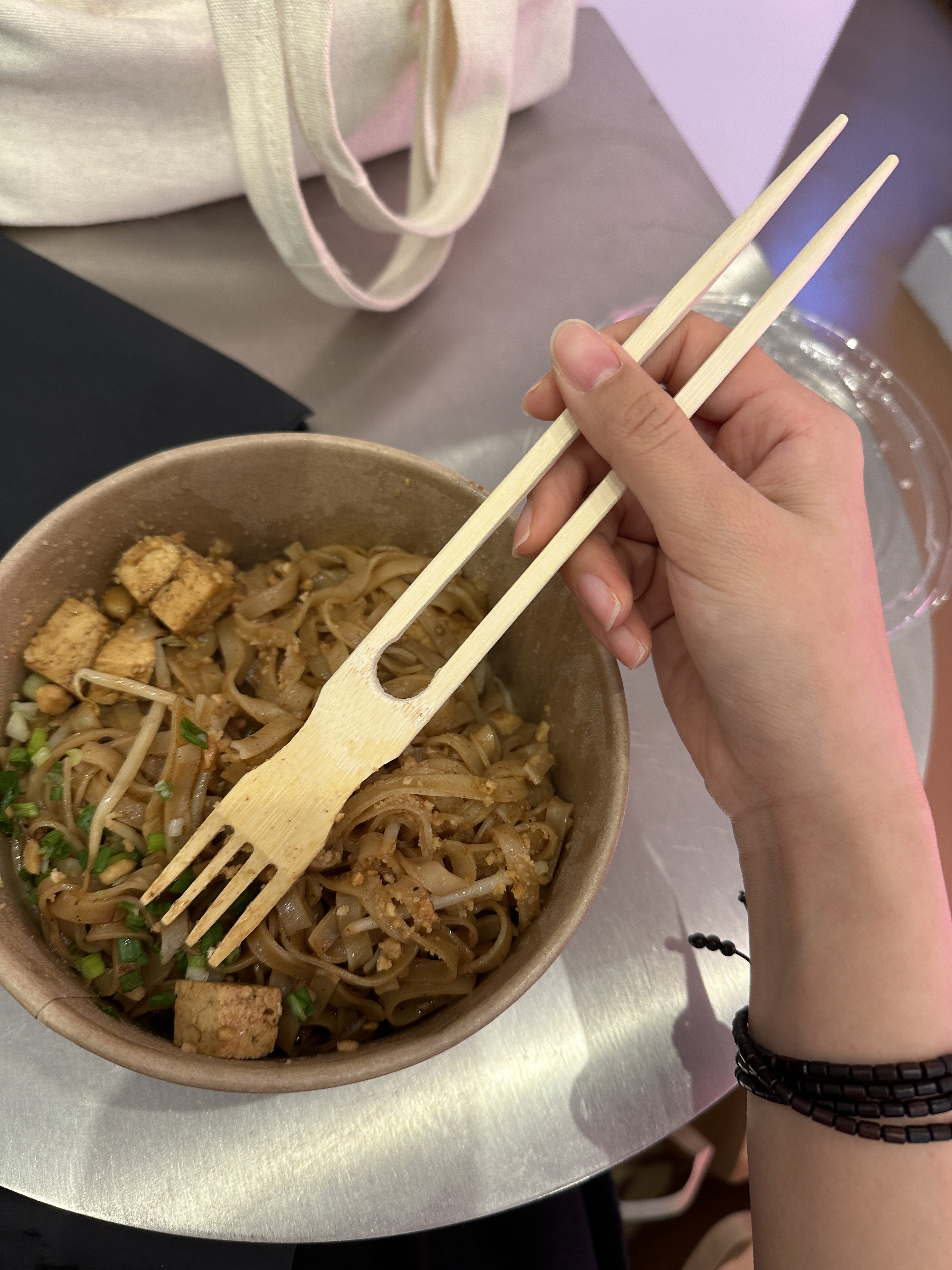 À ÉVITER 🥲🥲 Pad Thai Tofu, pris en début de service vers 11h15. Quelques morceaux de tofu, TRÈS PEU de pousse de soja et le reste c’est QUE des pâtes. Des pâtes pour 13 euros c’est extrêmement cher… Très déçu car il y a pas beaucoup de goût et à la fin les pâtes étaient sec et sans goût. J’avais mangé des très bons pad thai ailleurs et il y avait beaucoup plus de légumes et c’était plus savoureux…