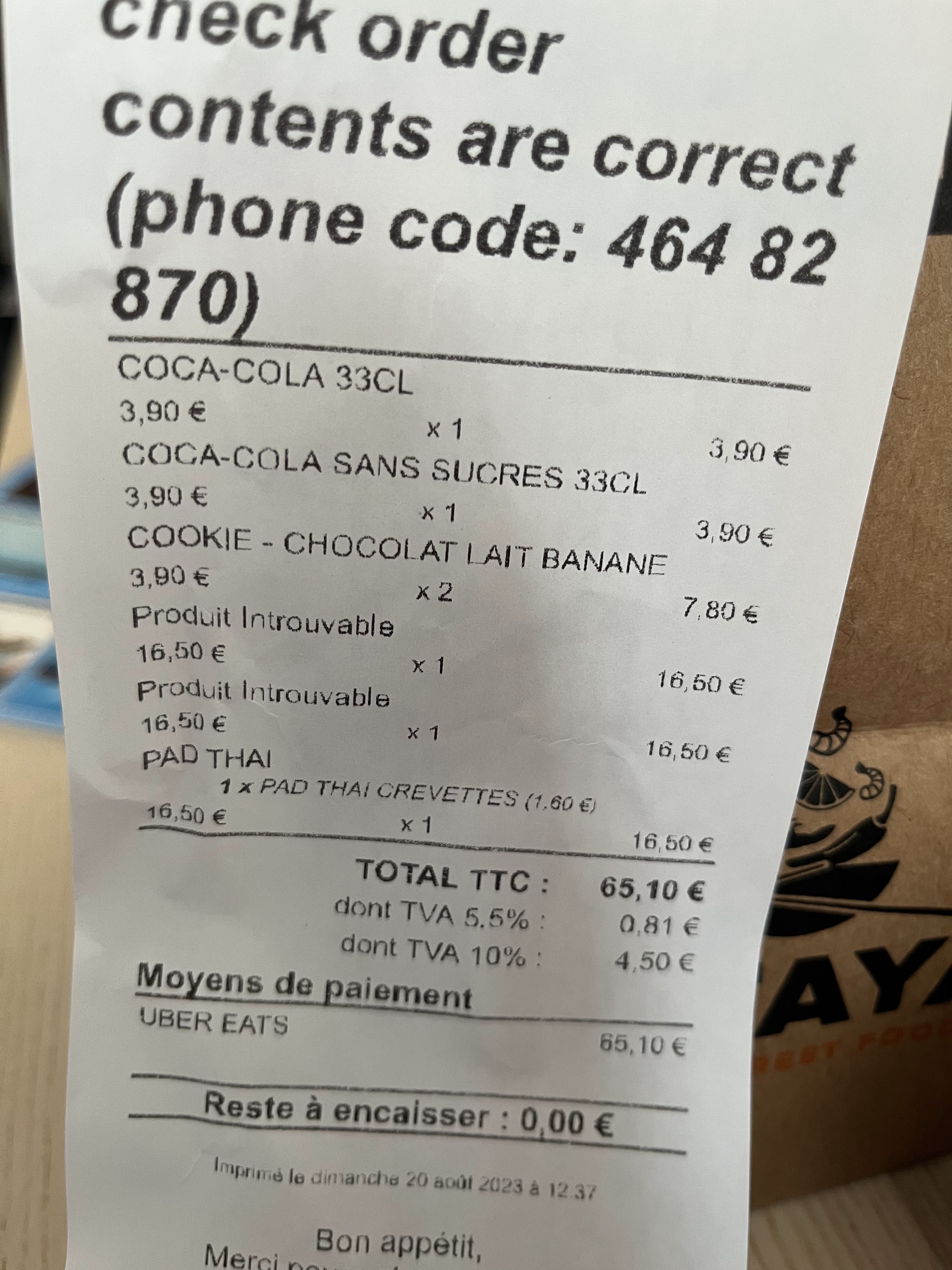 A FUIR J ai commandé 7 articles a emporter que j ai payé CF TICKET DE CAISSE sur les 7 articles il n y en avait qu un dans le sac, manquait 2 coca 2 cookies et 2 plats type Kao pad Les 2 plats ont été validés sur le site et payés CF TICKET DE CAISSE ET FACTURE.Sur le ticket de caisse ils ont été noté produits introuvables mais ont bien été facturés 16,50 chacun!!! Pour bien faire le seul plat dans le sac qui était un Thai pad ressemblait plus a un gratin de nouilles qu a un plat Thai CF PHOTO Au total j ai payé 61,50E pour un plat de pâtes trop cuites avec 2 articles en rupture de stock facturés (vérifiez vous même)et 4 oubliés mais facturés quand même avec la déception des personnes qui attendaient leur plat