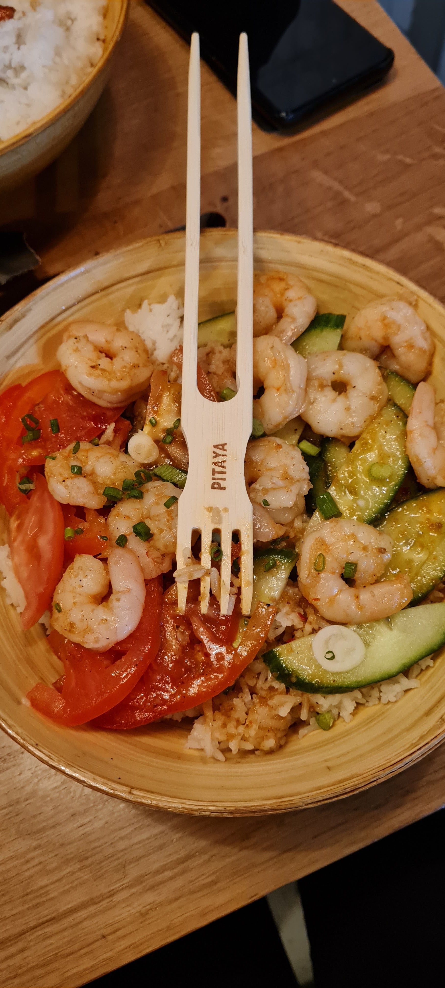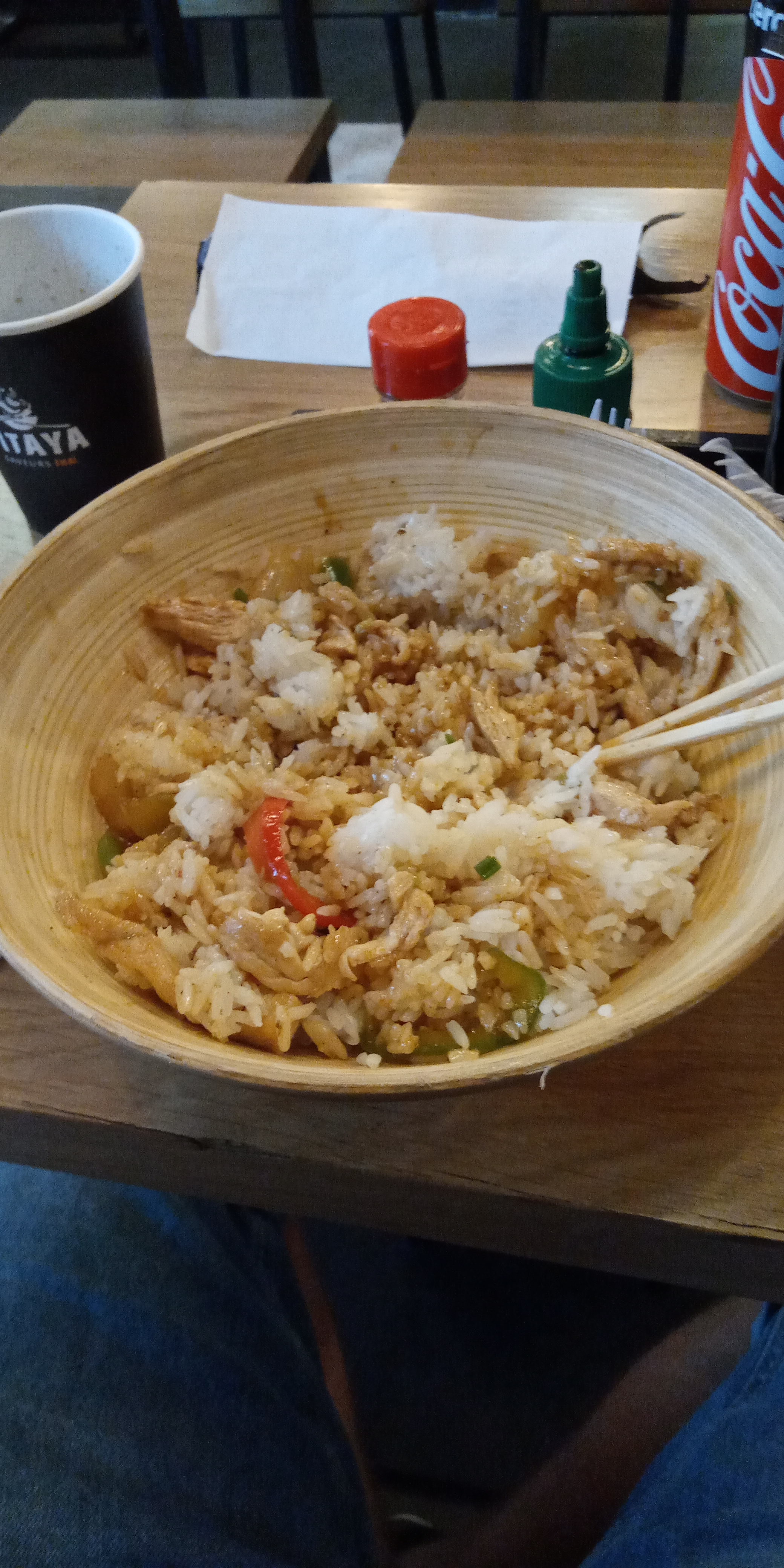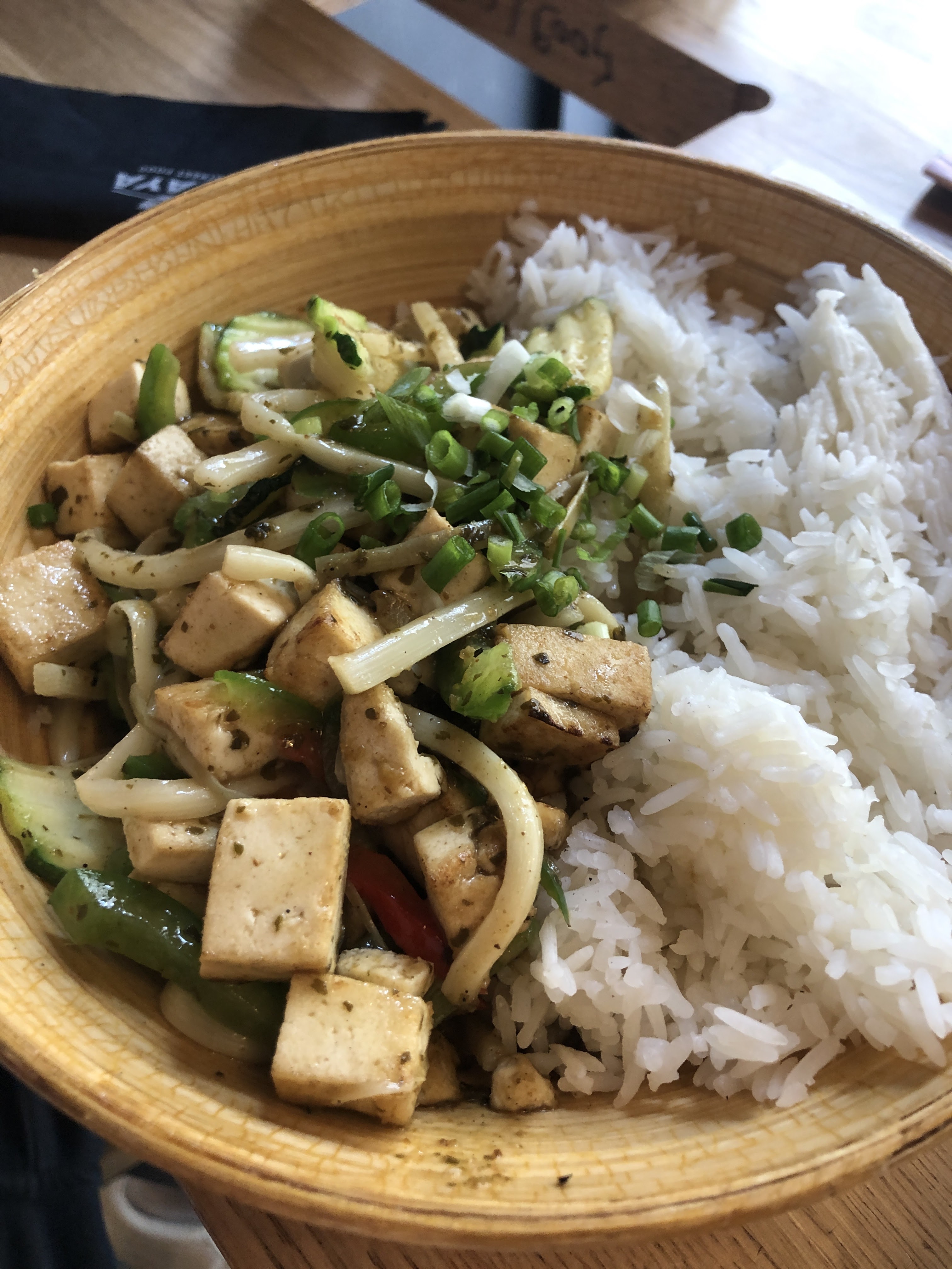 Repas sur place à 2, servies plutôt rapidement, bowl copieuses et très bonnes manquerait juste coriandre ou autre pour avoir un goût Thaï
