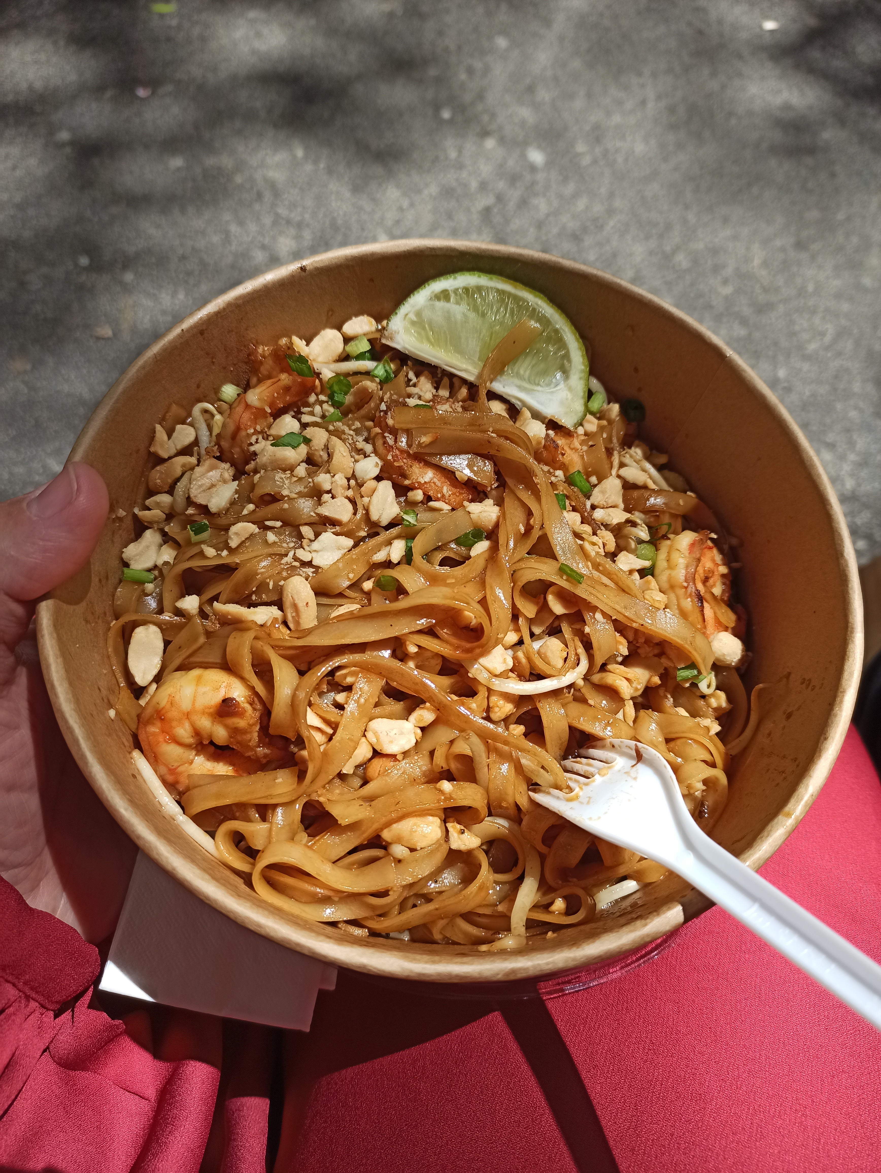 Quand j'ai vu la file devant le resto, je me suis dis que ça ne devait être que bon. Et j'ai bien fait de m'y arrêter ! Malgré la file, l'accueil est sympathique et la prise de commande est assez rapide. En revanche l'attente pour le plat est un peu longue, mais vu le monde et la cuisson au wok, on patiente tranquillement. On peut manger sur des tables mises à disposition ou alors se poser à l'ombre dans le square à 2 pas. J'ai commandé un Pad Thaï aux crevettes dé-li-cieux ! Le goût y était, un régal ! Le plat est bien copieux. Je reviendrai à coup sûr à ma prochaine escapade en ville pour essayer les autres plats.