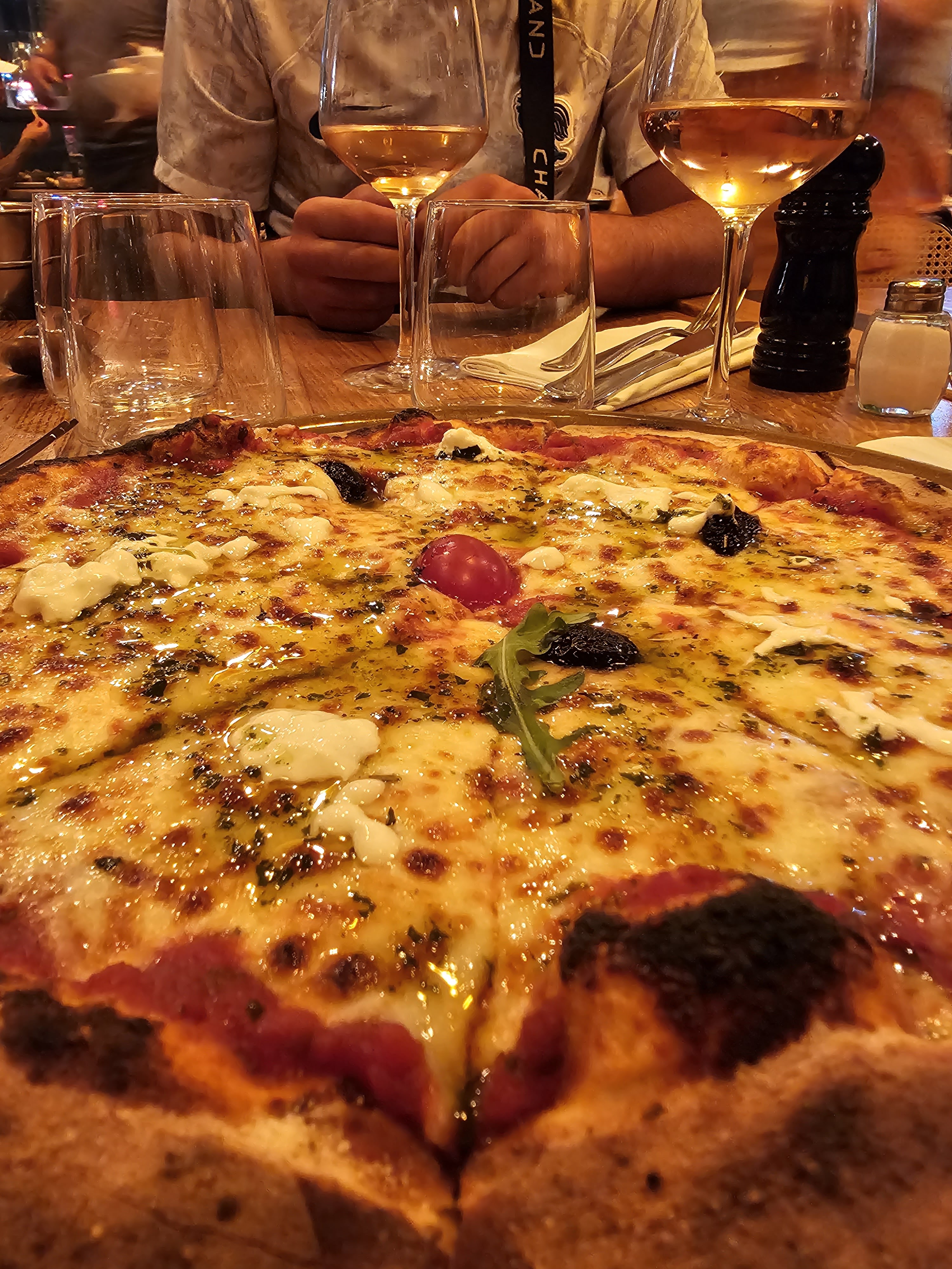 6 sur une table ronde à l'étage, avec réservation (c'était rempli), bon accueil et satisfait du service. Mais... Nos pizzas étaient brûlées et nous avons connu de meilleures pâtes à pizza (mais chacun ses goûts). 18€ la pizza en moyenne c'est assez cher quand on connaît le coût de fabrication... 50€ 2 pizzas + 2 apéro... Malheureusement je ne reviendrai pas à ce prix là.