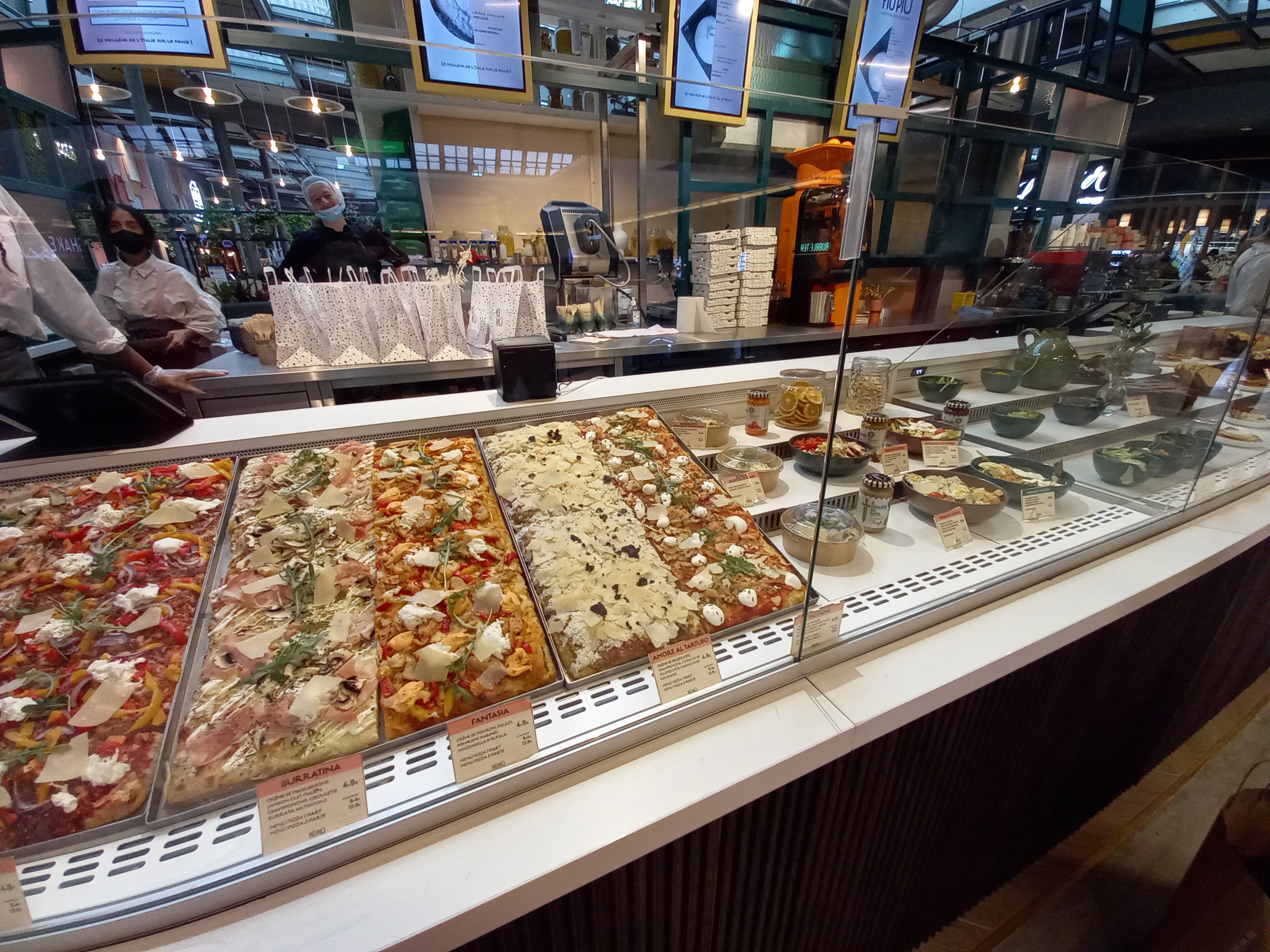 Super expérience !! Passez par hasard devant, attiré par les facteurs d'ambiance du restaurant, et la disposition qui met en valeur les plat proposé ! Multiple choix, pizza (varié) salade grande/petite, dessert, boisson chaude/froide. Le personnel très agréable, souriant, aimable, qui donne l'envie de revenir ! Mais le plus important : la nourriture !! Elle est vraiment au niveau du restaurant, a bonne température ! Service rapide ( 2-5 min). Donc je vous conseille d'y aller pour un bon p'tit repas ! Vous ne serez pas déçu !