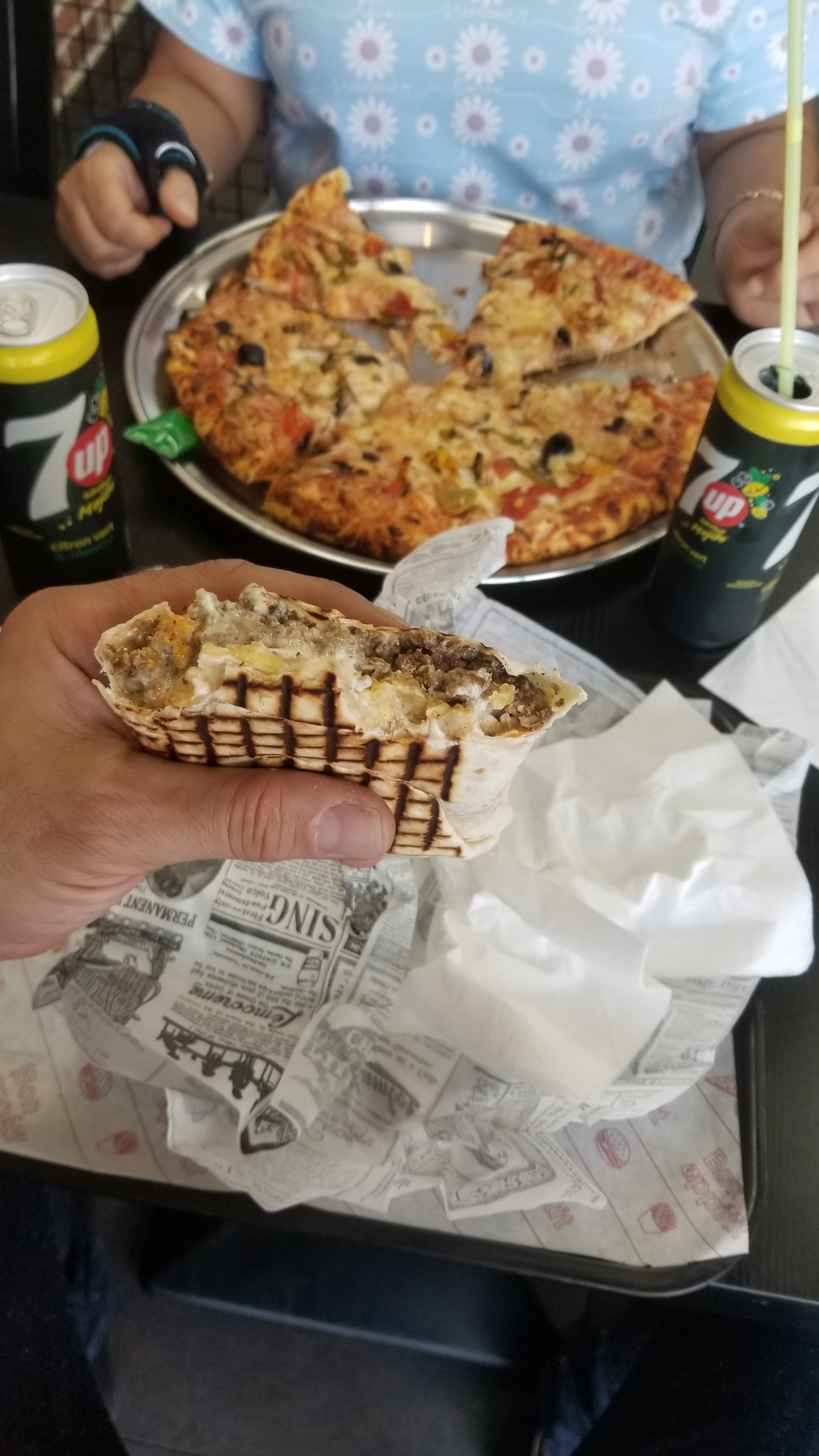 Établissement assez grand pour venir en famille , chaleureux et accueillant 👍 suite à ma commande du jour honnêtement rien a dire Masha Allah tout est bon de la pizza au tacos . Il y a certe du monde mais sa vaut vraiment le coup d'attendre.