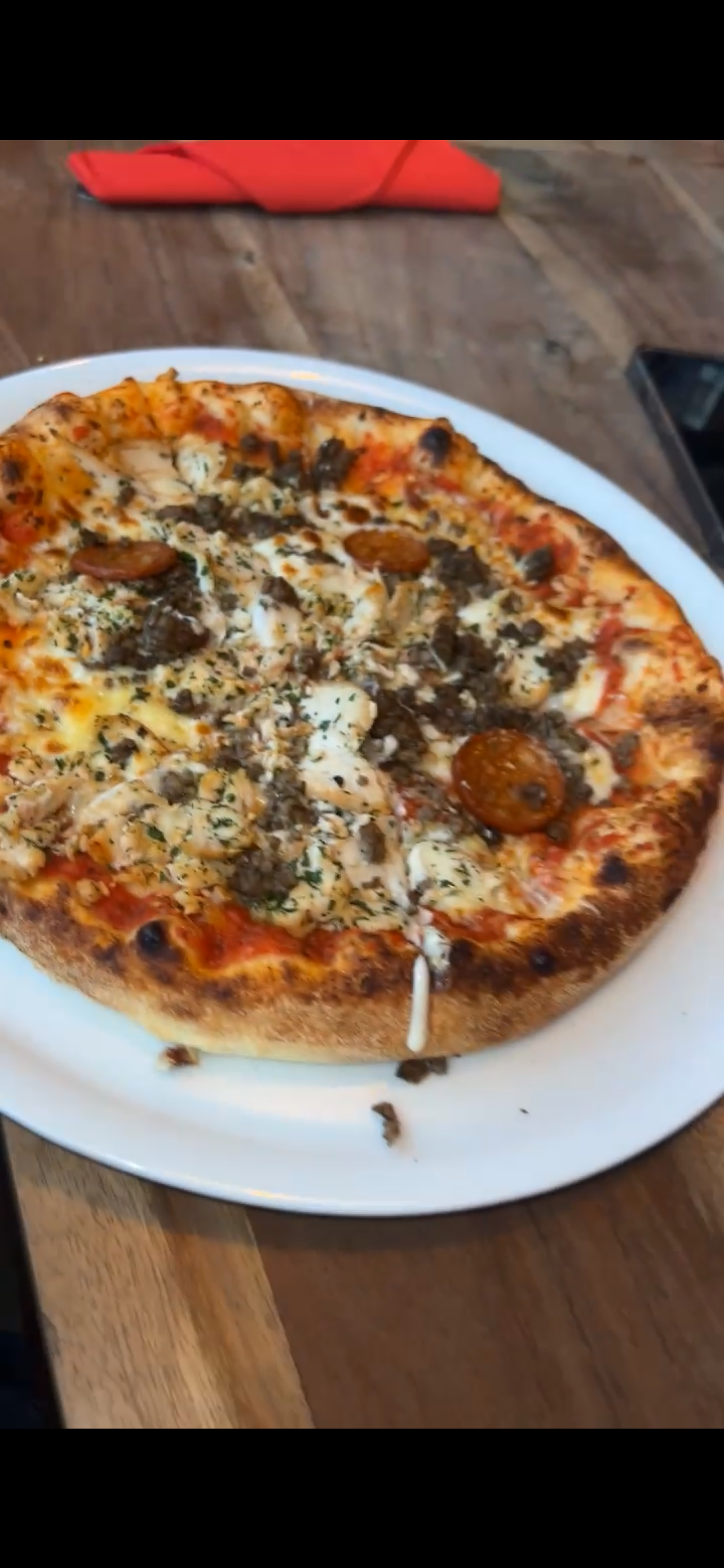 Excellentes pizza au feu de bois. Gros morceaux de poulet et pâte bien moelleuse, un régal.