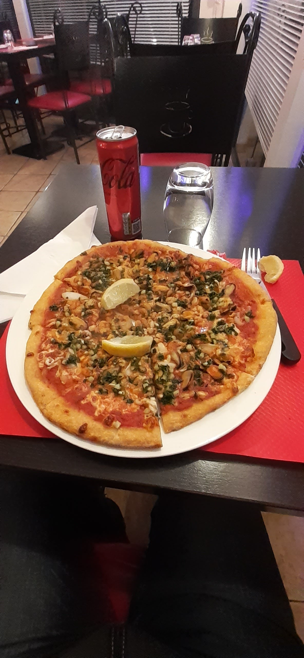 Pizza a emporter ou a consommer sur place. Je me suis régalée avec une Fruits de mer, pâte très fine et bien croustillante