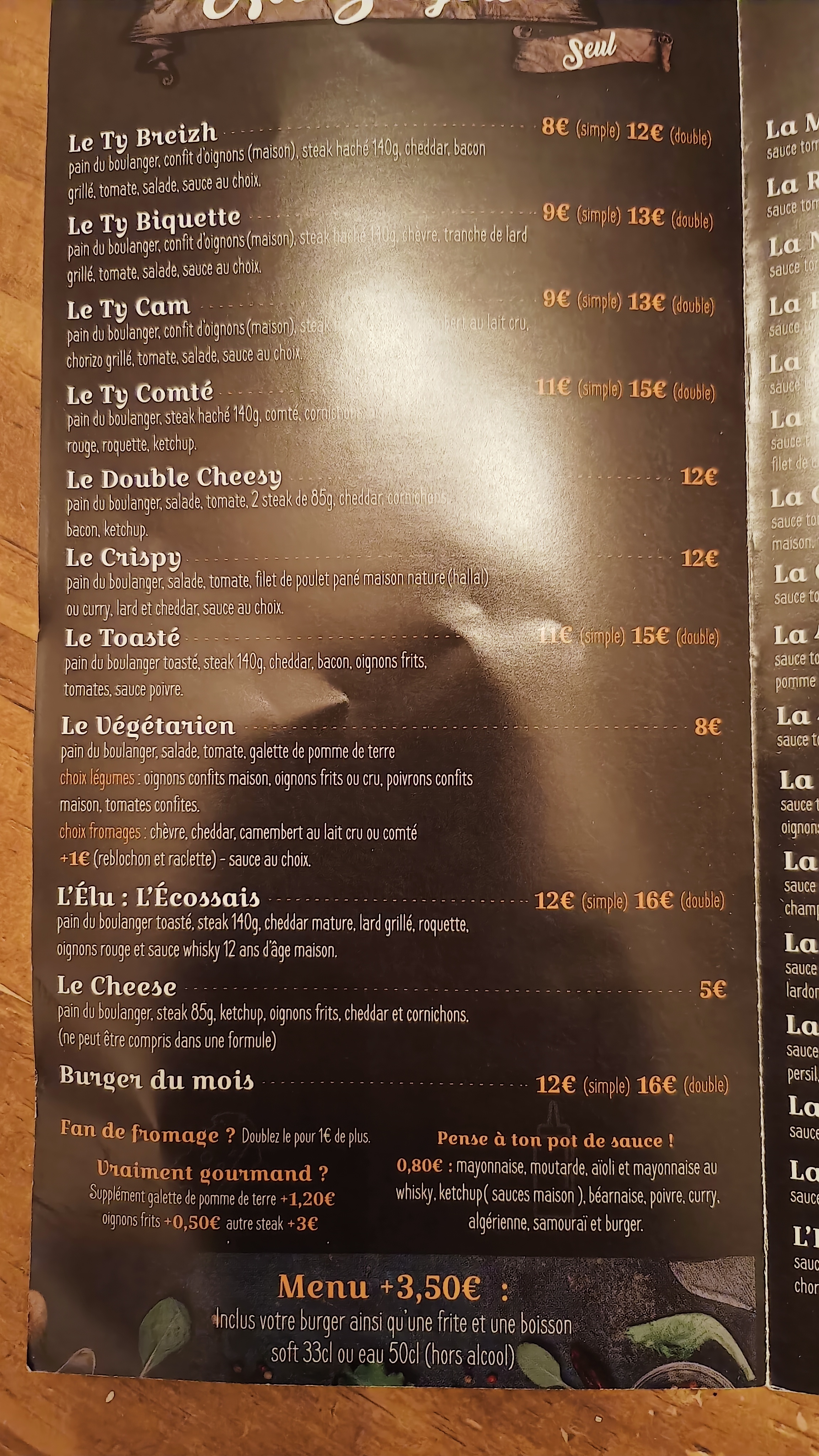 Je ne m en lasse pas. Les burgers sont élaborés avec de bons produits. Les pizzas sont excellentes. La carte est variée et l accueil est fort sympathique.