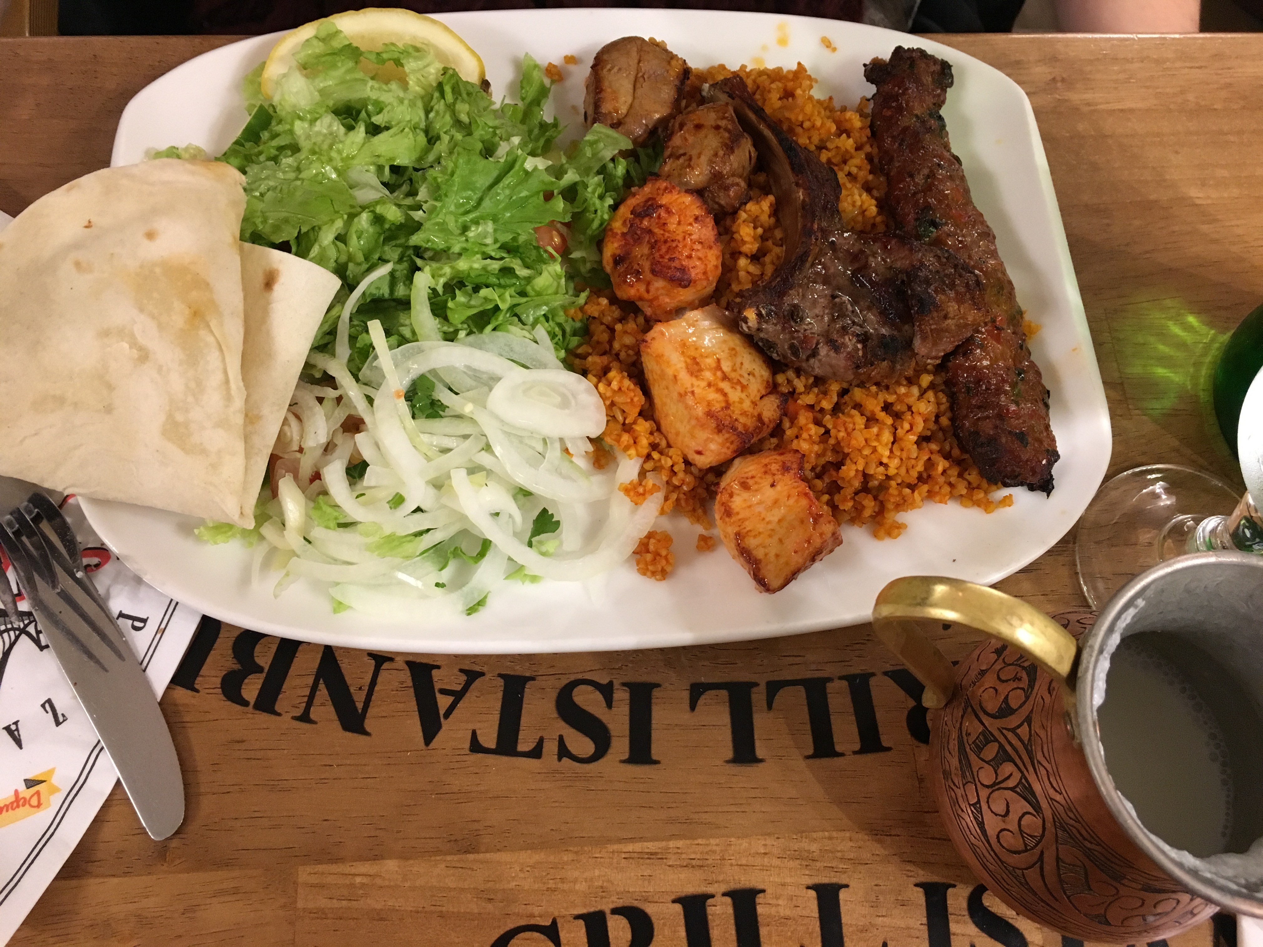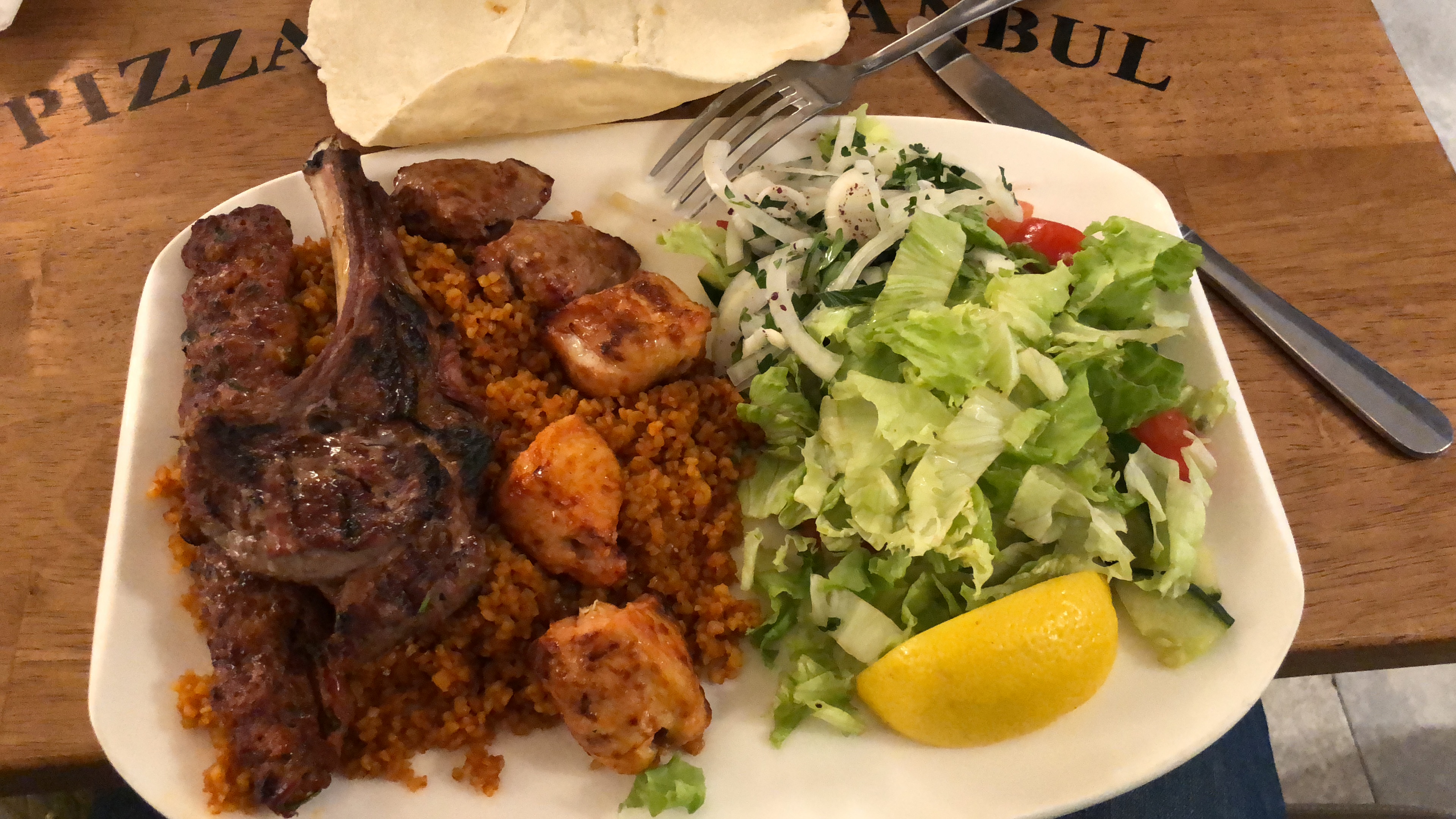 Beau restaurant dans un quartier animé. J'ai choisi ce restaurant pour ses nombreux avis positifs mais pour ma part je ne mettrais pas 5 étoiles. Le serveur, qui nous servait, était très aimable. Les autres serveurs un peu moins. Nous avons pris un plat de grillades mixtes : agneau, poulet et viande hachée. Et un pide au poulet. Les viandes grillées étaient savoureuses, le boulghour aussi. Par contre très déçue qu'il n'y ait pas de frites avec le boulghour et la salade comme j'ai l'habitude d'en avoir dans d'autres restaurants turcs (j'en ai testé énormément) où on a droit aussi à des portions bien plus généreuses pour le prix payé. Rapport (non pas qualité /prix) mais quantité/ prix assez médiocre. 18 € le plat tout de même. La salade est pauvre et pas travaillée. Sèche sans sauce. Soit disant qu'il y avait de l'huile d'olive mais je ne l'ai pas senti. J'ai pressé le citron pour donner du goût. Sinon le pide au poulet bien assaisonné mais qui n'avait pas de fromage. On a finit par un bon dessert avec un thé.