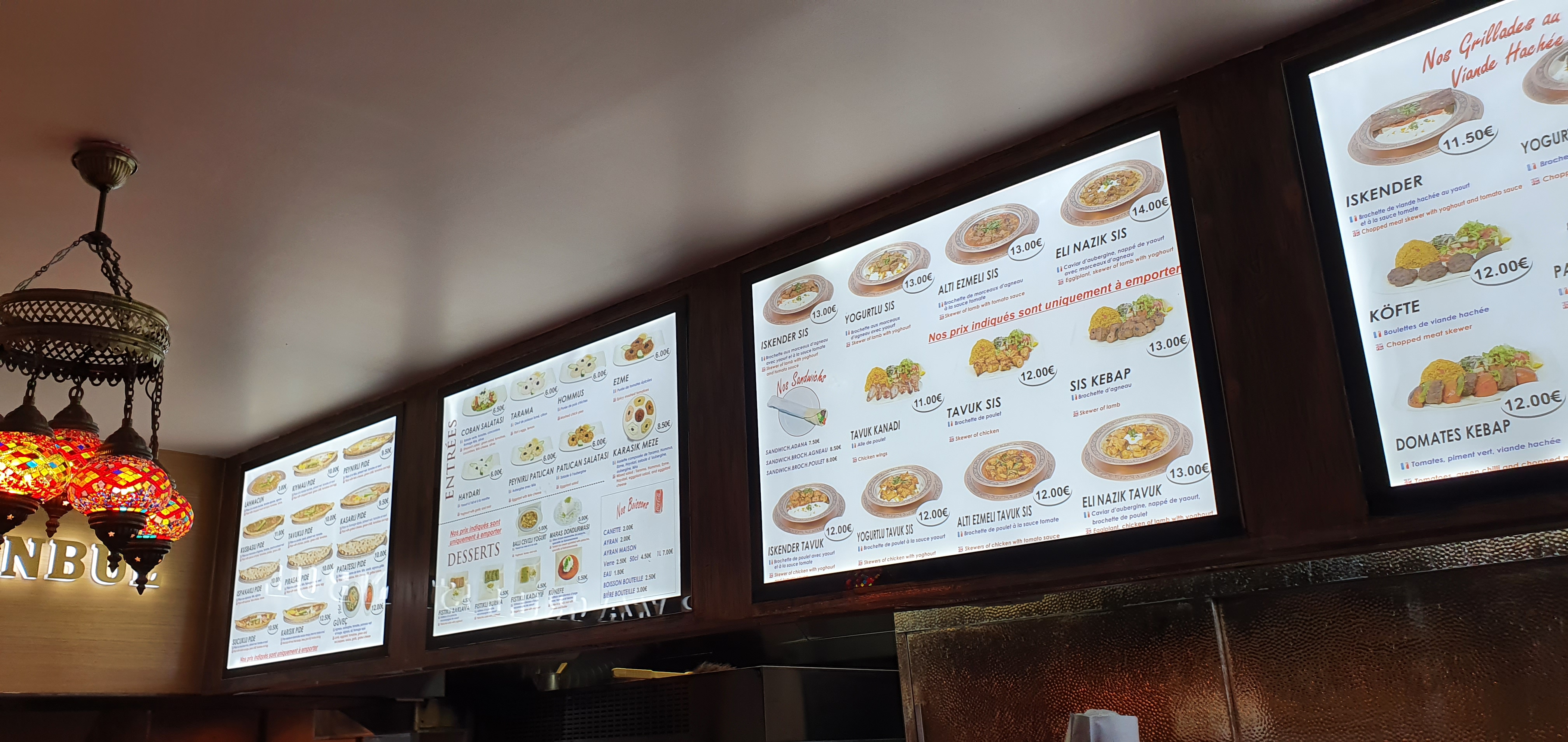 Malgré les autres avis positifs, je dirai le contraire. J’ai voulu juste un dessert et un thé. Des le début ils étaient d’accord sauf que je devrais payer autres prix plus élevés que les prix affichés. J’étais d’accord et je me suis installé à une table, mais surprise, la serveuse me dit que ce que j’ai commandé ne peut pas être servi sur place et j’ai été obligé de quitter le restaurant. C’est honteux je trouve pour un restaurant turc.