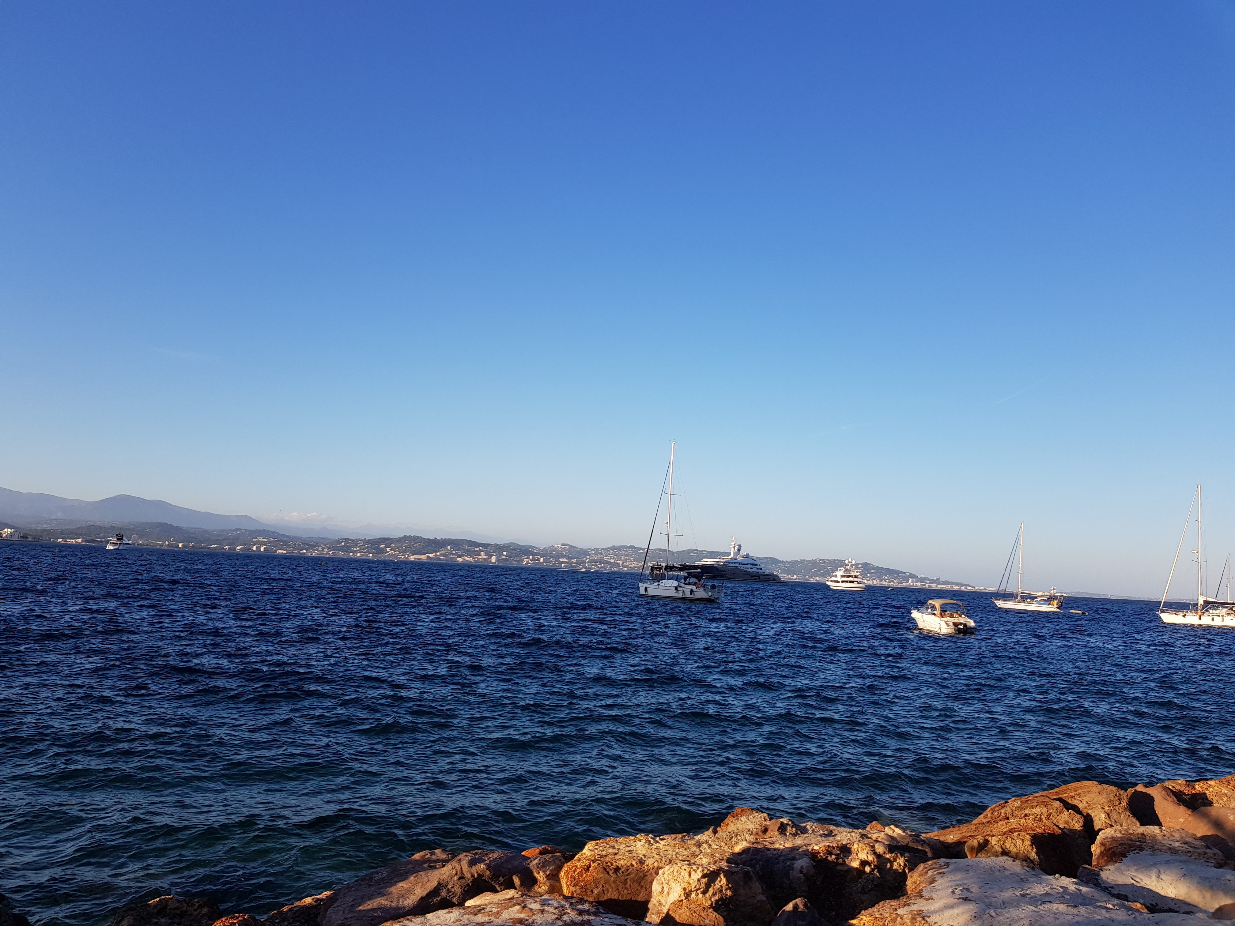 Restaurant en bord de mer, pas de voitures, belle vue sur la baie de Cannes. Magique....pizza à pâte fine, poisson, poulpe,carpaccio pas de bœuf frais mais de viande salée et fumée. Menu enfant à 15€. Bo rapport qualité prix et surtout l'environnement.