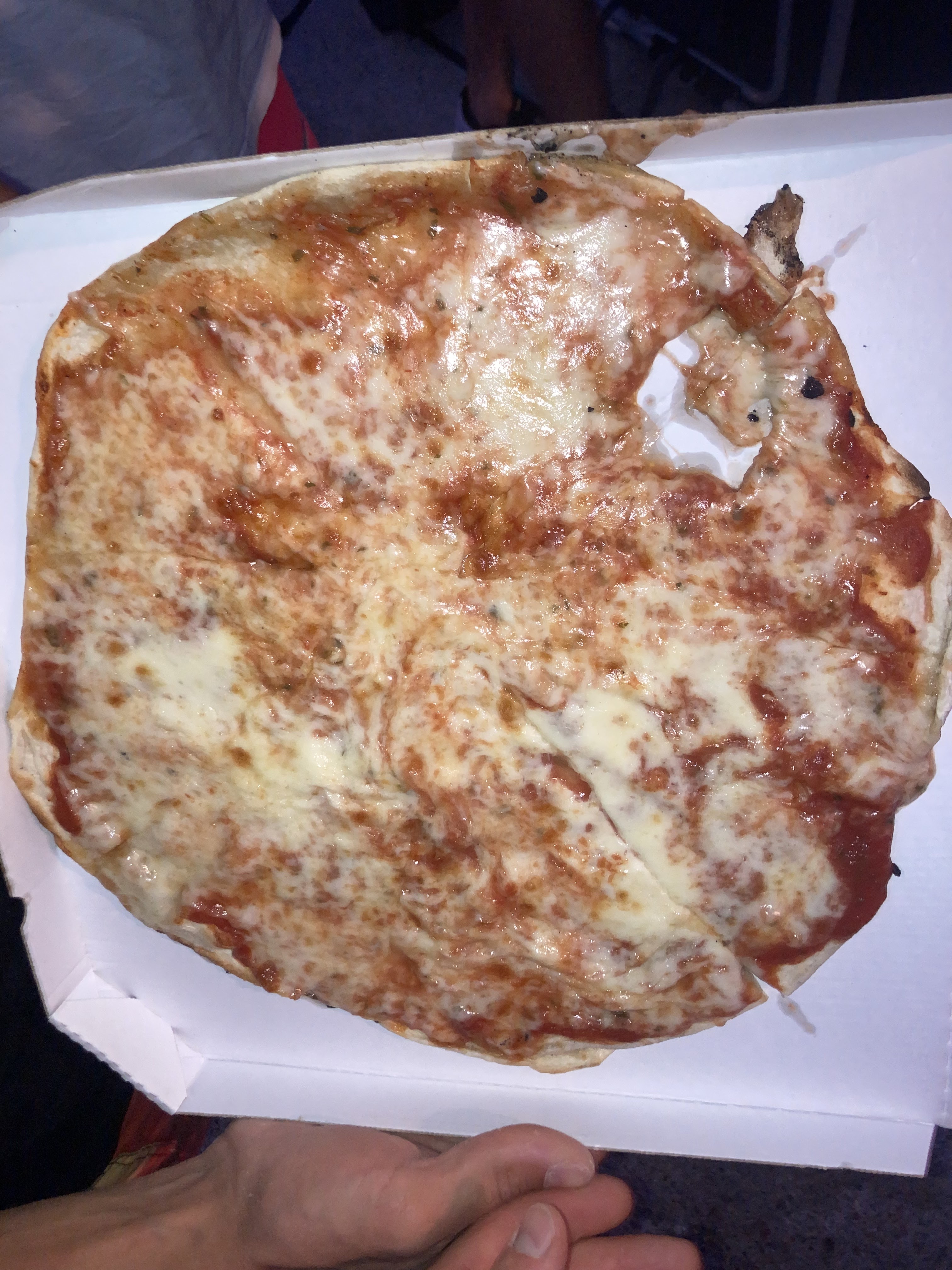 Personnel désagréable à notre arrivée, il ne fallait pas aller trop vite et nous avons eu droit à la fameuse excuse « je ne peux pas aller plus vite surtout en plein service » ou encore « ce n’est pas mcdo ici… ». Concernant la nourriture proposé : je n’ai jamais vu des pizzas si dépourvu de goût. Nous avons commandé 6 « marguerites » annoncées à 10€ avec comme description « tomate, fromage ». Je m’attendais bien à avoir les pizzas les moins chers et donc les plus simples. Toutes les autres pizzas sont à 16€ et donc plus élaborées. Je ne préfère d’ailleurs pas imaginer la tête de ces dernières. Au vu de notre budget nous nous sommes donc tournés sur les pizzas à 10€. La pâte est très fine et a priori décongelée. Elle ressemble à un genre de galette de blé légèrement croustillante sans goût. Quand à la garniture, je ne préfère pas donner de description mais pas besoin d’avoir fait top chef pour suspecter de bons et tendres aliments décongelés là encore sans goût. Dans deux d’entre elles d’ailleurs un trou y figurait (cf. Photo). Pour faire court et simple, si vous avez envie de passez un bon moment gustatif et convivial, évitez ce commerce. Je ne suis pas du genre à faire ce style d’avis mais j’aurais aimer en lire un avant d’aller dans ce restaurant/pizzeria.