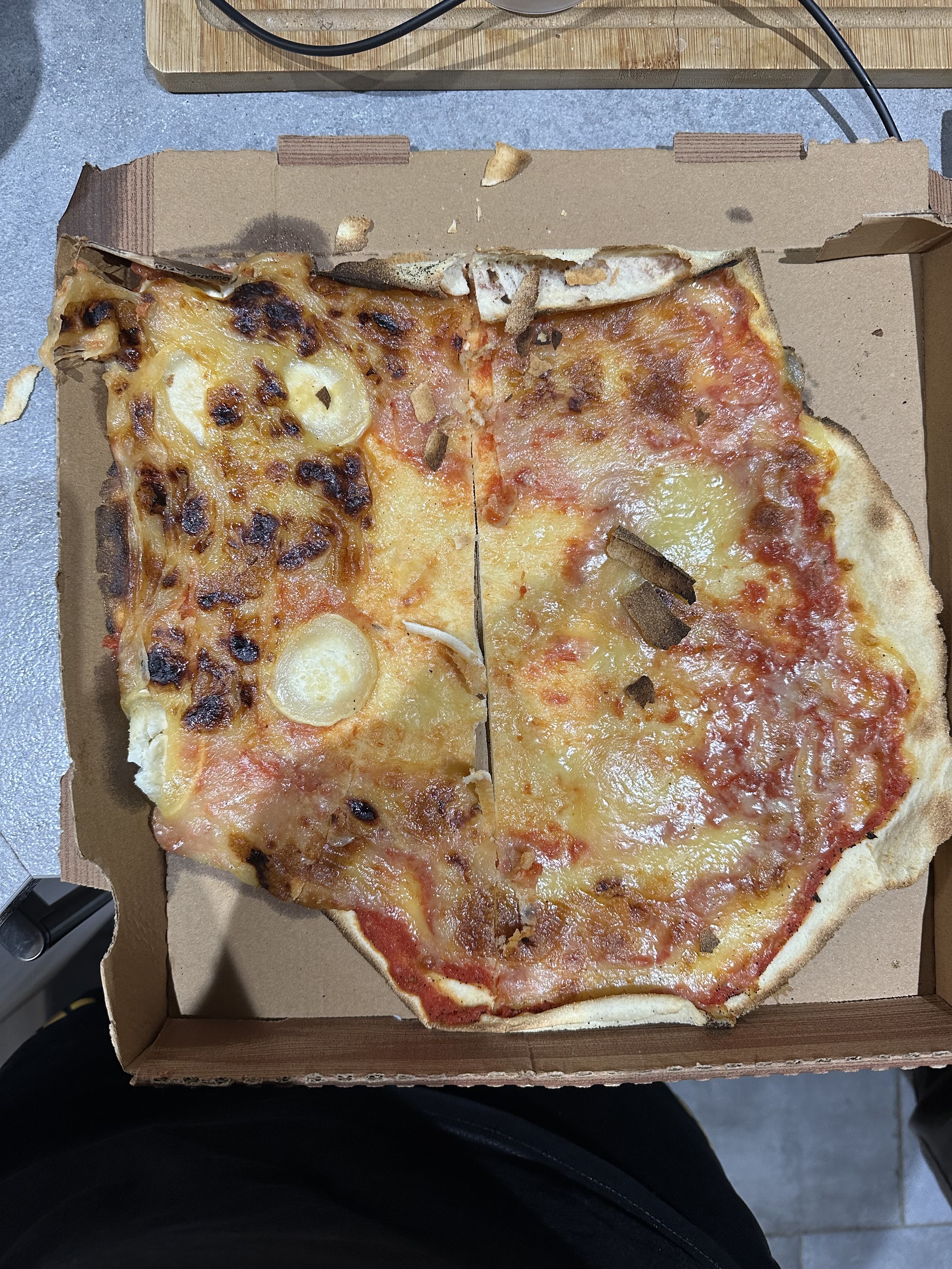 Je sais pas si le conducteur a été trop vite dans le virage ou si il vote à gauche mais la photo parle par elle même pizza chèvre miel
