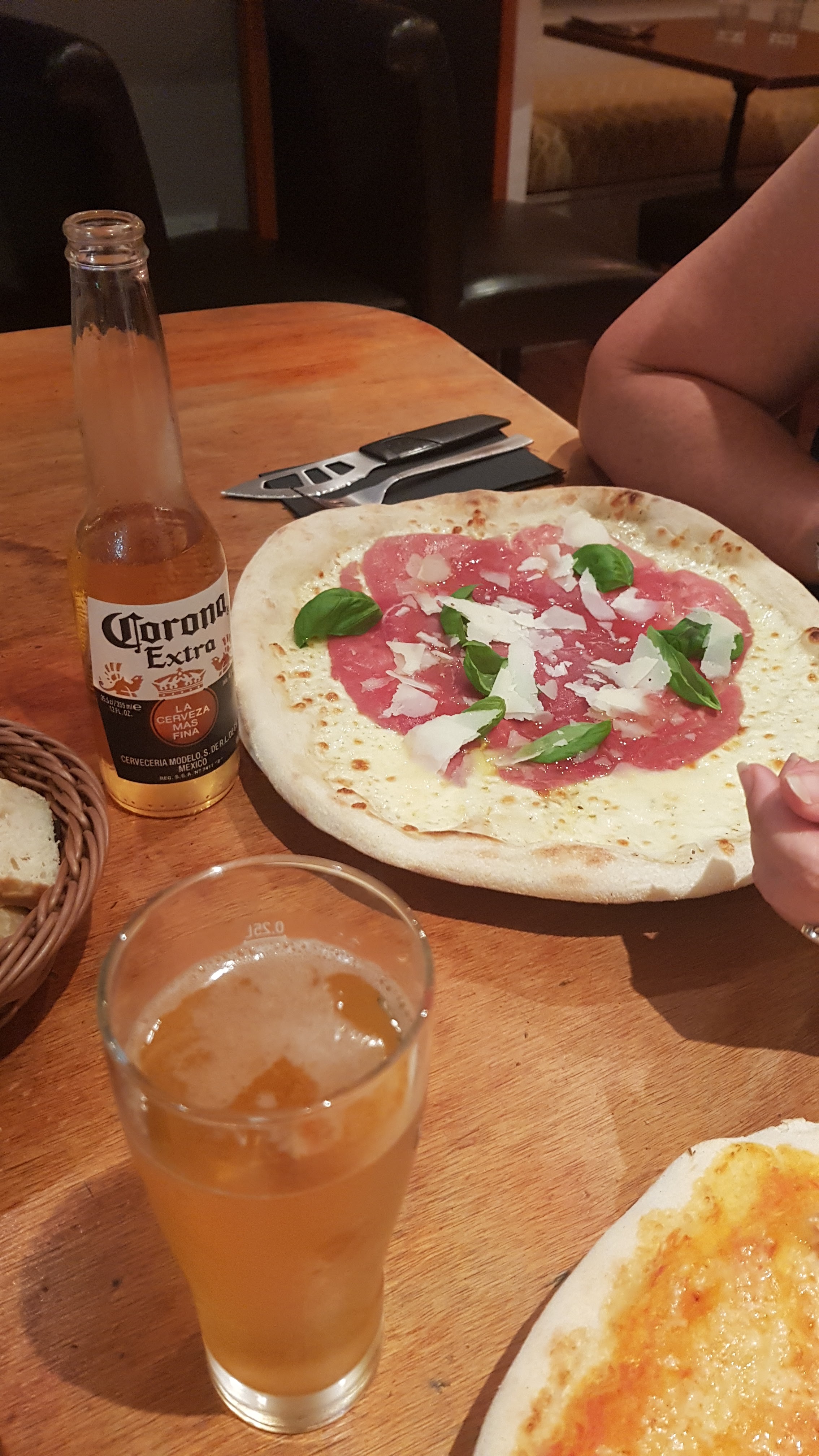Super pizza fraîche. Base fine et croustillante savoureuse. Environ 12 €, grande bière 5,50 €