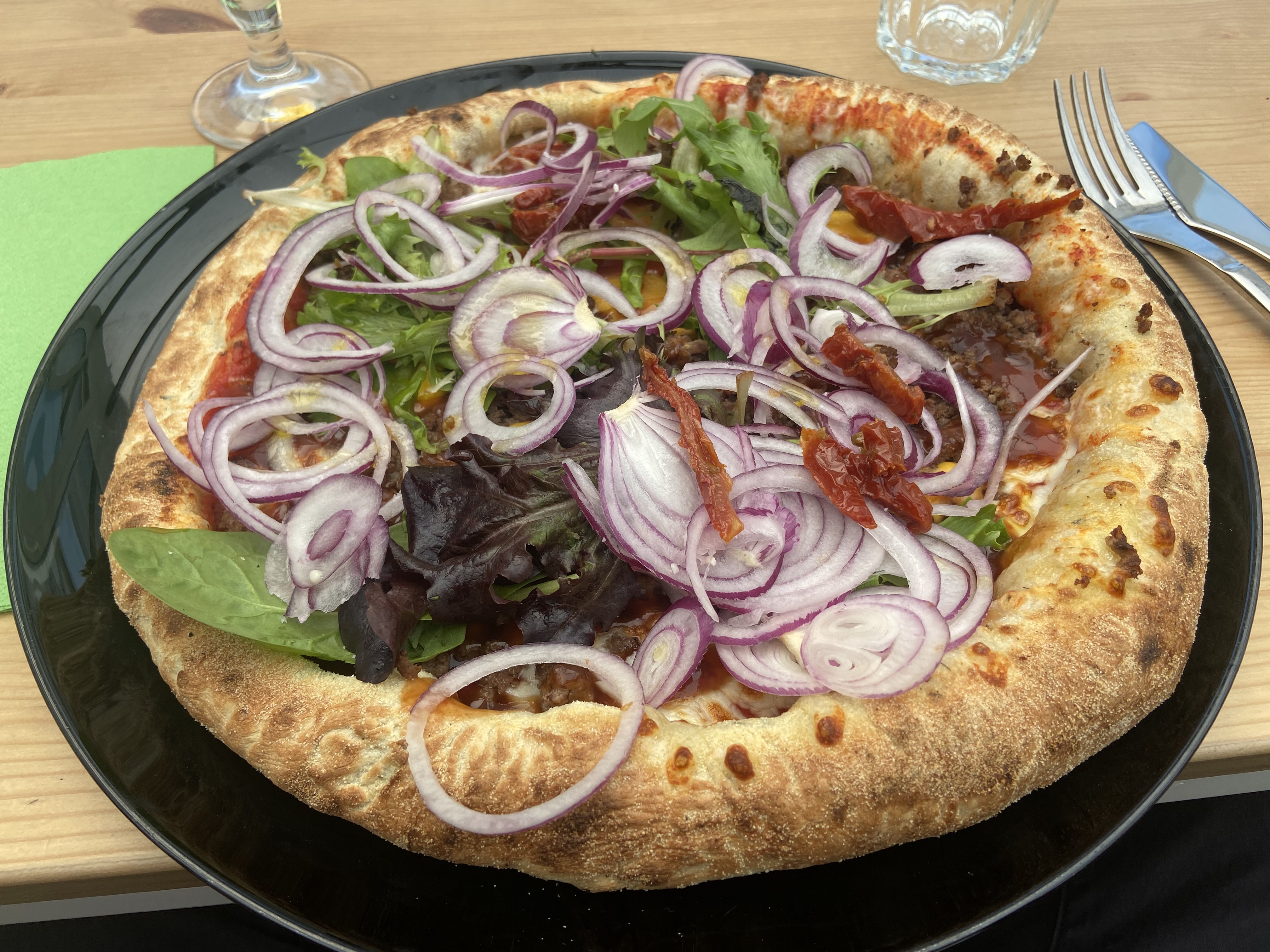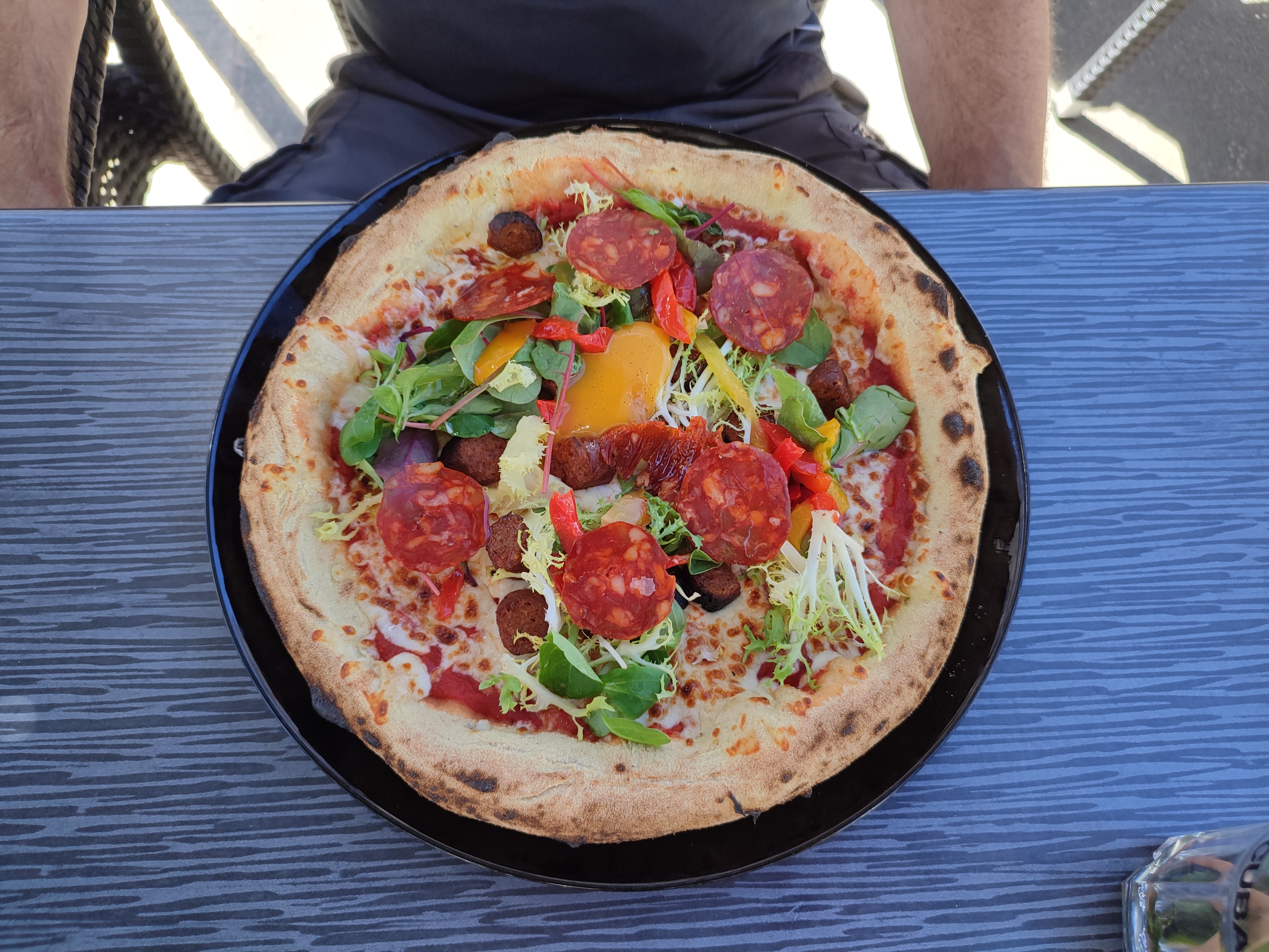 La pizza était bonne manque peut-être un peu de cuisson pour la tenue de la pâte car impossible de la tenir en main. Bien garnie. Peut-être un peu cher mais c'est le bord de mer.