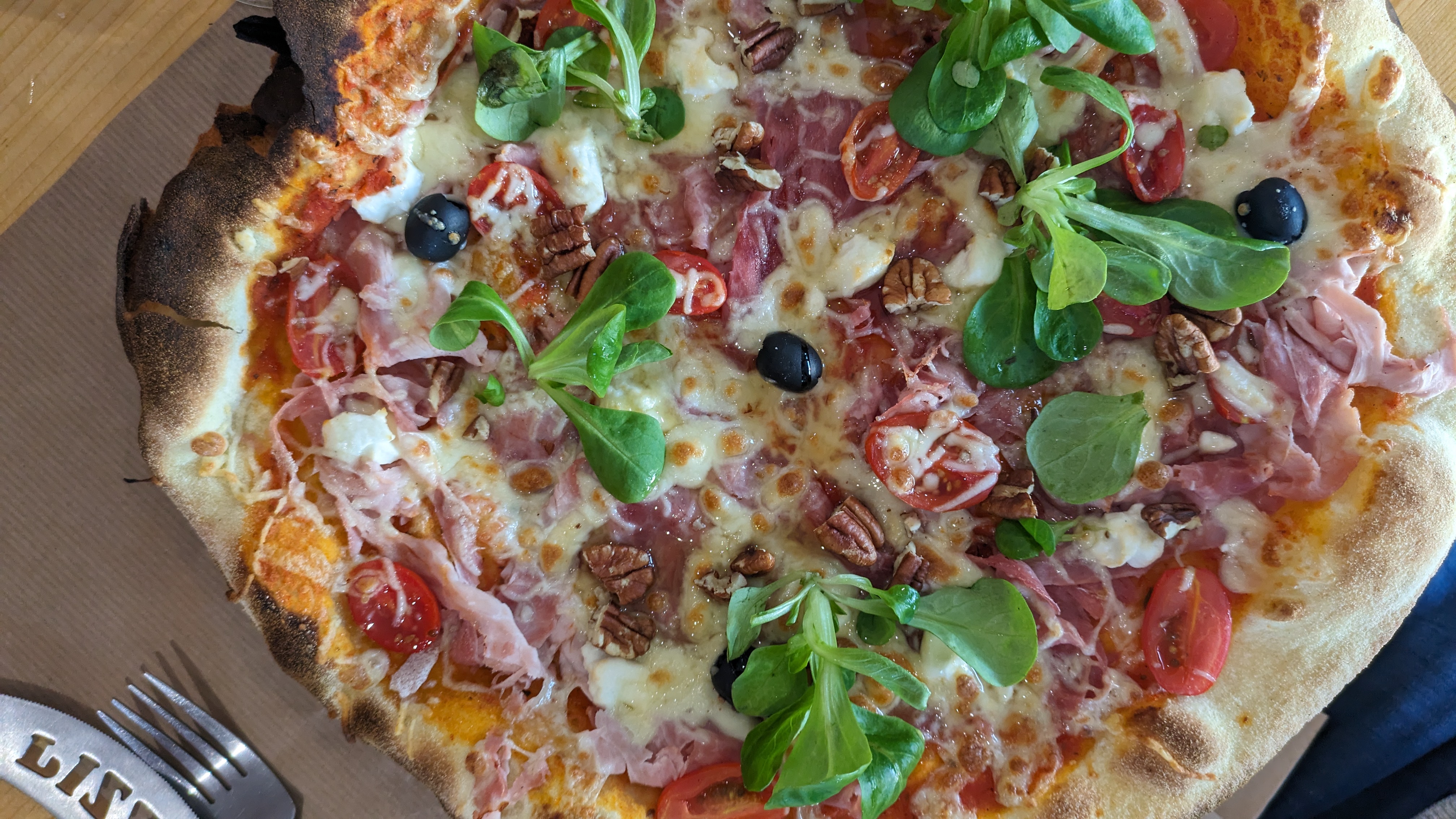Pizza pâte fine et garniture généreuse cuite au feu de bois excellente