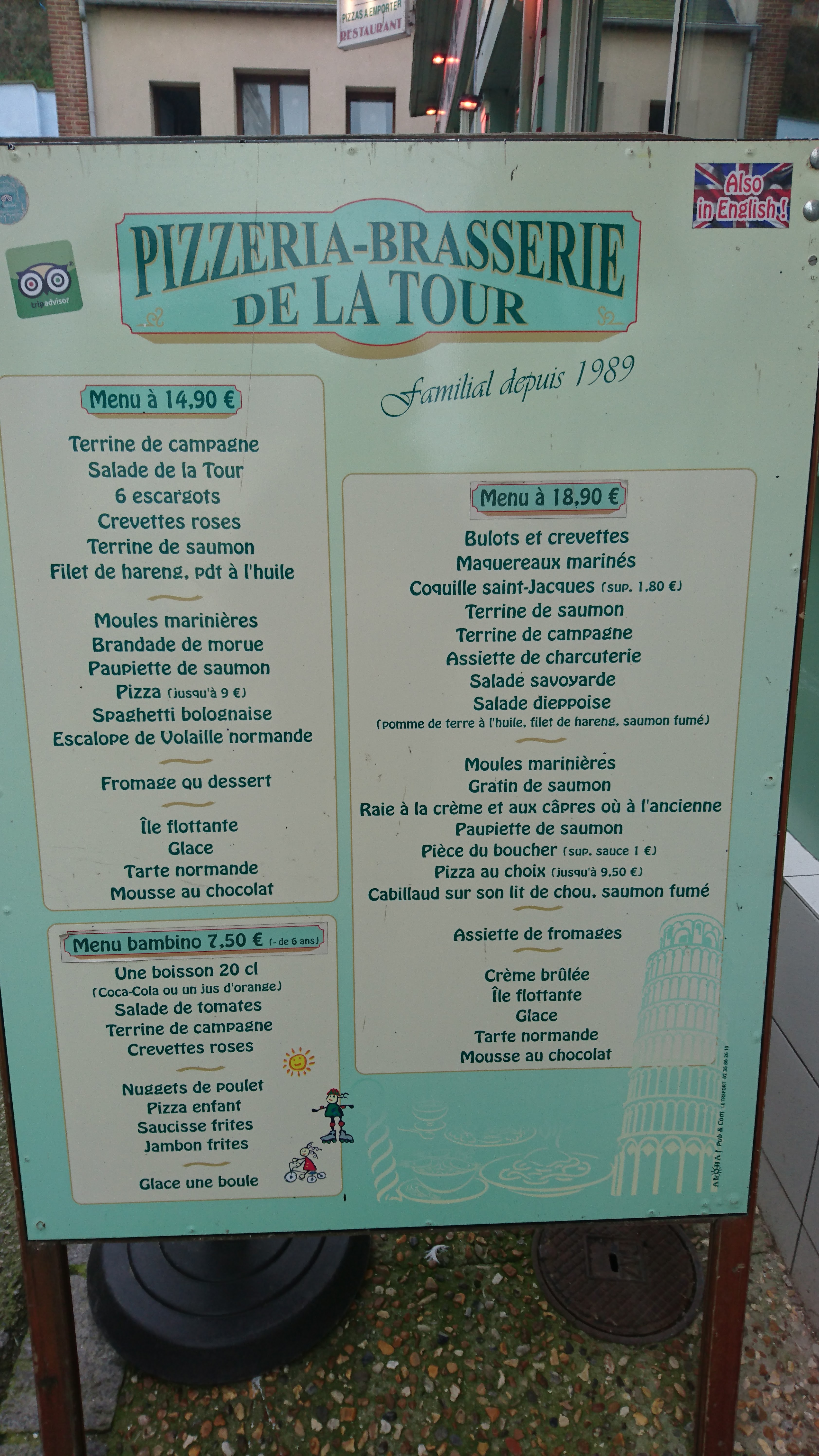 Toujours un arrêt à la pizzeria de la tour quand je passe au treport franchement une bonne adresse que je vous conseille avec des tarifs et un service pour toute les bourses