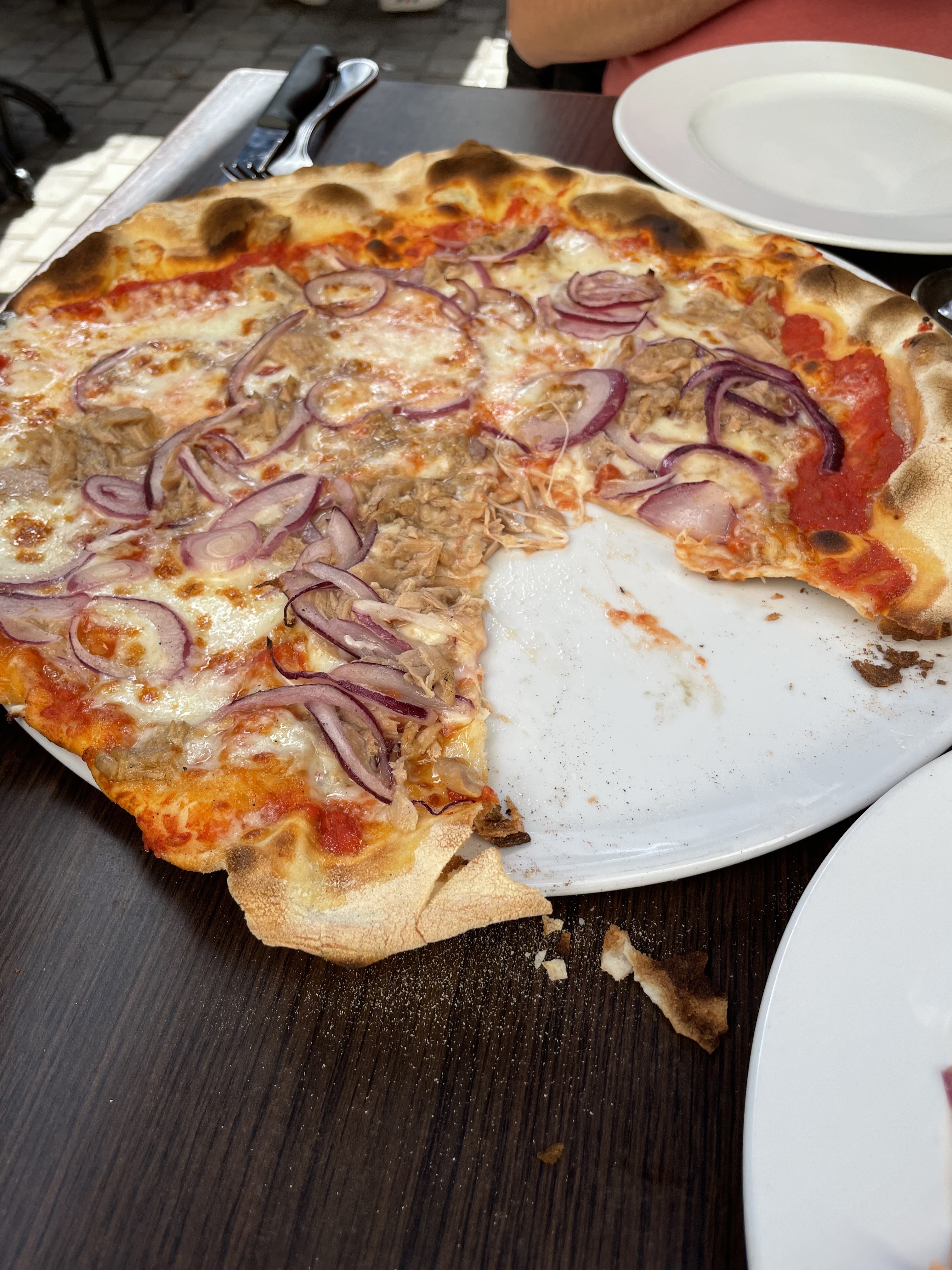 Jolie terrasse au soleil, pizza à pâte super fine, très grande :-). Merci!
