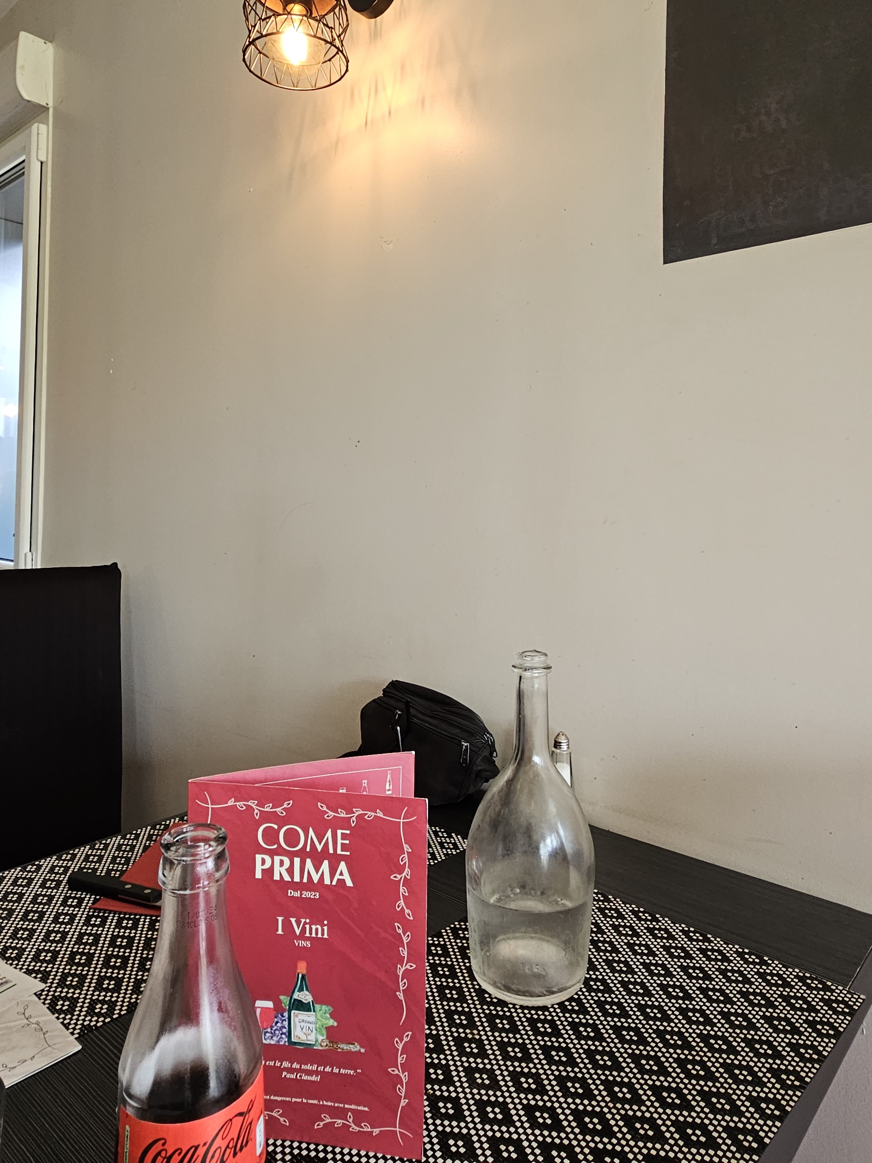 Sur le chemin du retour vers l'Allemagne, pause déjeuner spontanée à la Pizzeria Come Prima. Les sympathiques dames nous ont montré une belle table et ont pris nos commandes. Suite à un malentendu, le service des entrées et des plats principaux a pris beaucoup de temps. Après l'entrée, rien n'est venu pendant 30 minutes. Pendant ce temps, nous regardions les invités qui nous suivaient commander, manger et payer. Lorsque les plats principaux sont arrivés, nous étions les derniers invités dans le restaurant, qui était auparavant presque plein. La nourriture était bonne et est recommandée. Malheureusement, le service était écrasant.