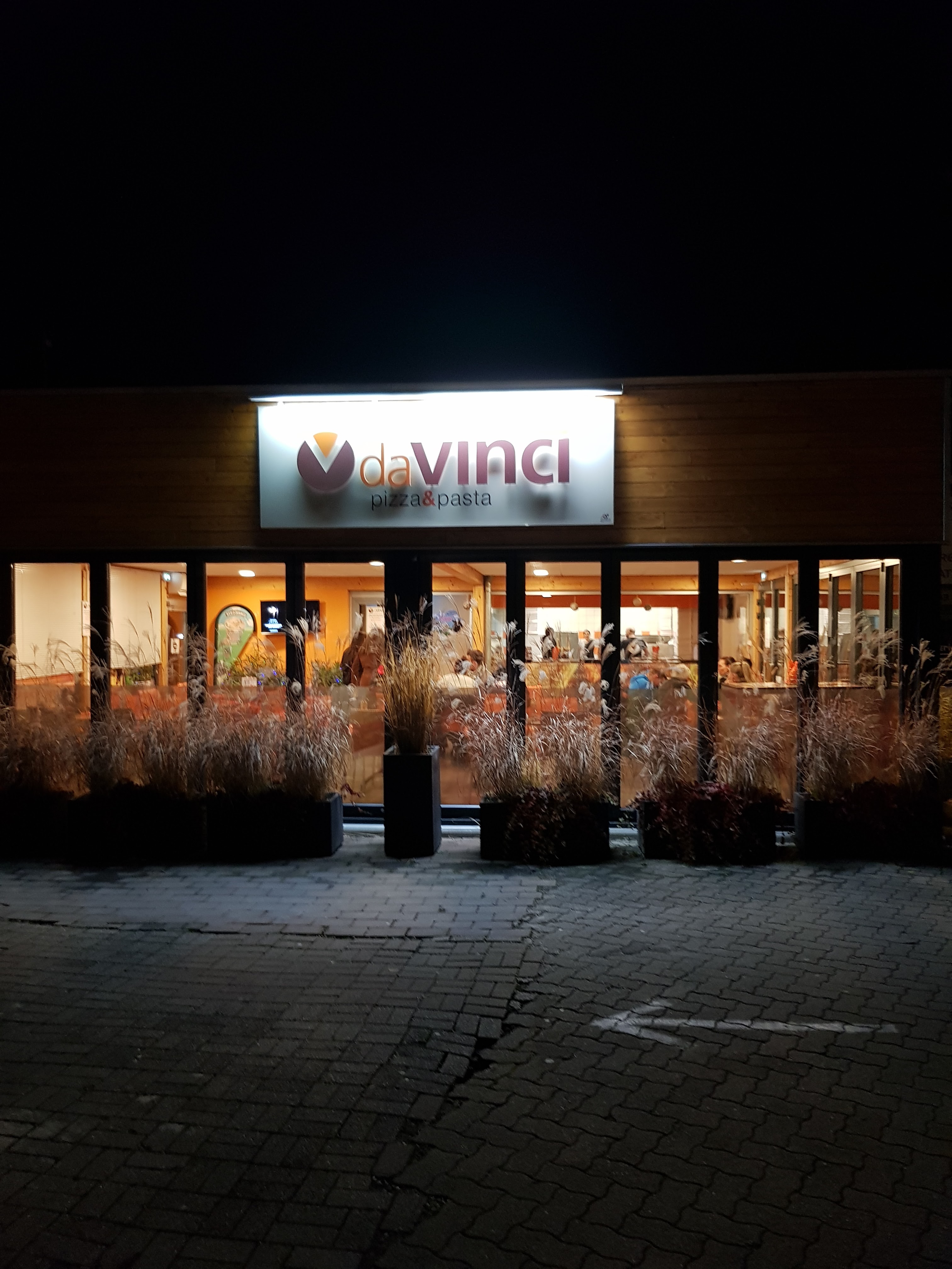 Nous nous sommes rendu dans cet établissement Pizzeria da Vinci vue de l 'extérieur depuis la route celle-ci fait bonne impression par luminosité de l 'endroit. Nous sommes rentrés et prenons la direction d' une table, de suite l 'employée vient demander ce que nous prenons comme boissons. Nous commandons et par la même occasion 2 Pizzas . Sommes dans la partie vérandas le moins que l 'on puisse dire c' est qu 'il manque un peu de chaleur au sens propre qu' au figuré la communication n' est pas chaleureuse,parcontre les pizzas sont délicieuses ,la convivialité n' est pas au rendez-vous. Le cadre interieur partie vérandas laisse penser que nous sommes dans une cantine scolaire .