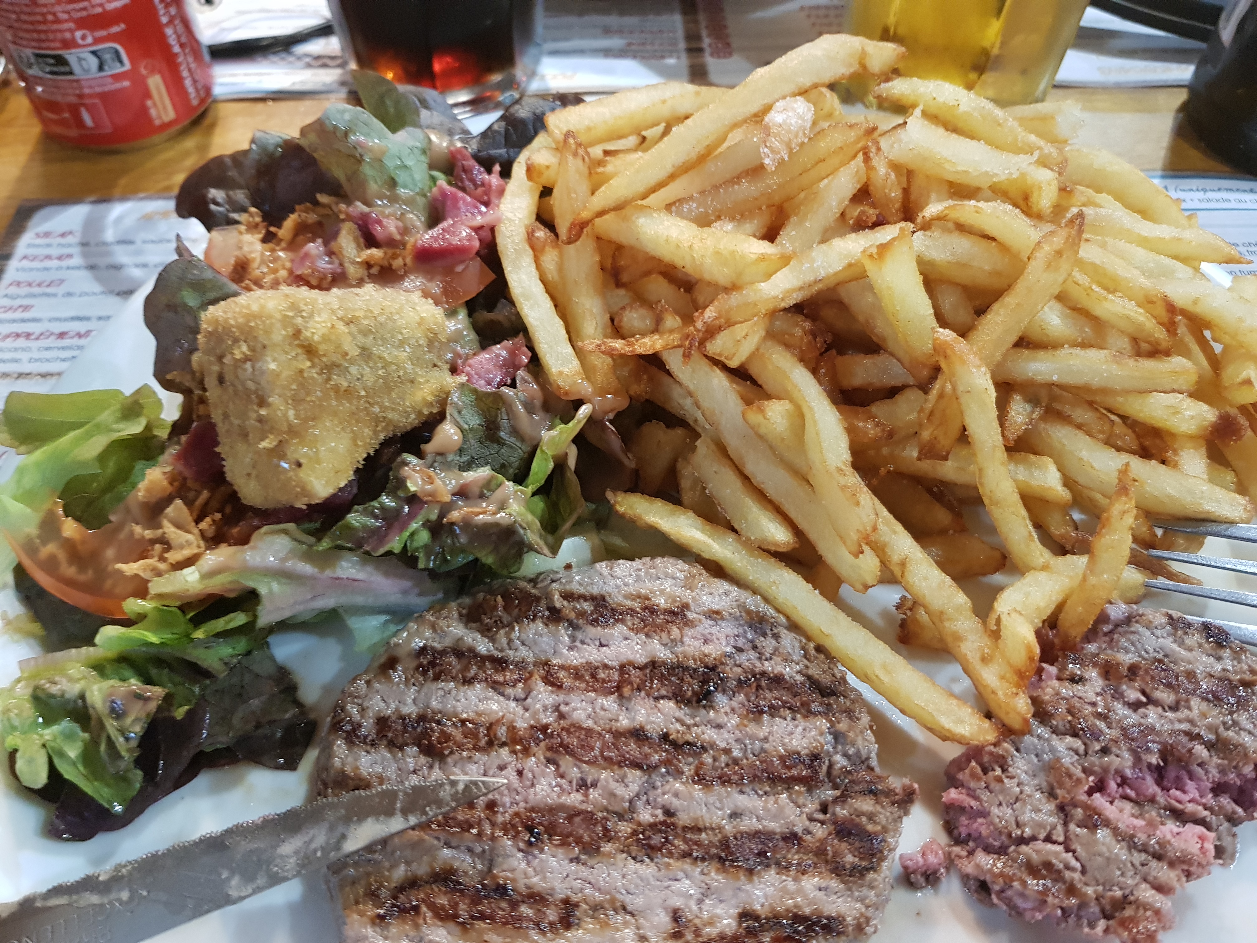 Cuisine simple à bon prix, plat copieux. Dommage que les steaks hachés soient si fin. Salade avec 2 gésiers! Personnel agréable Pas de parking