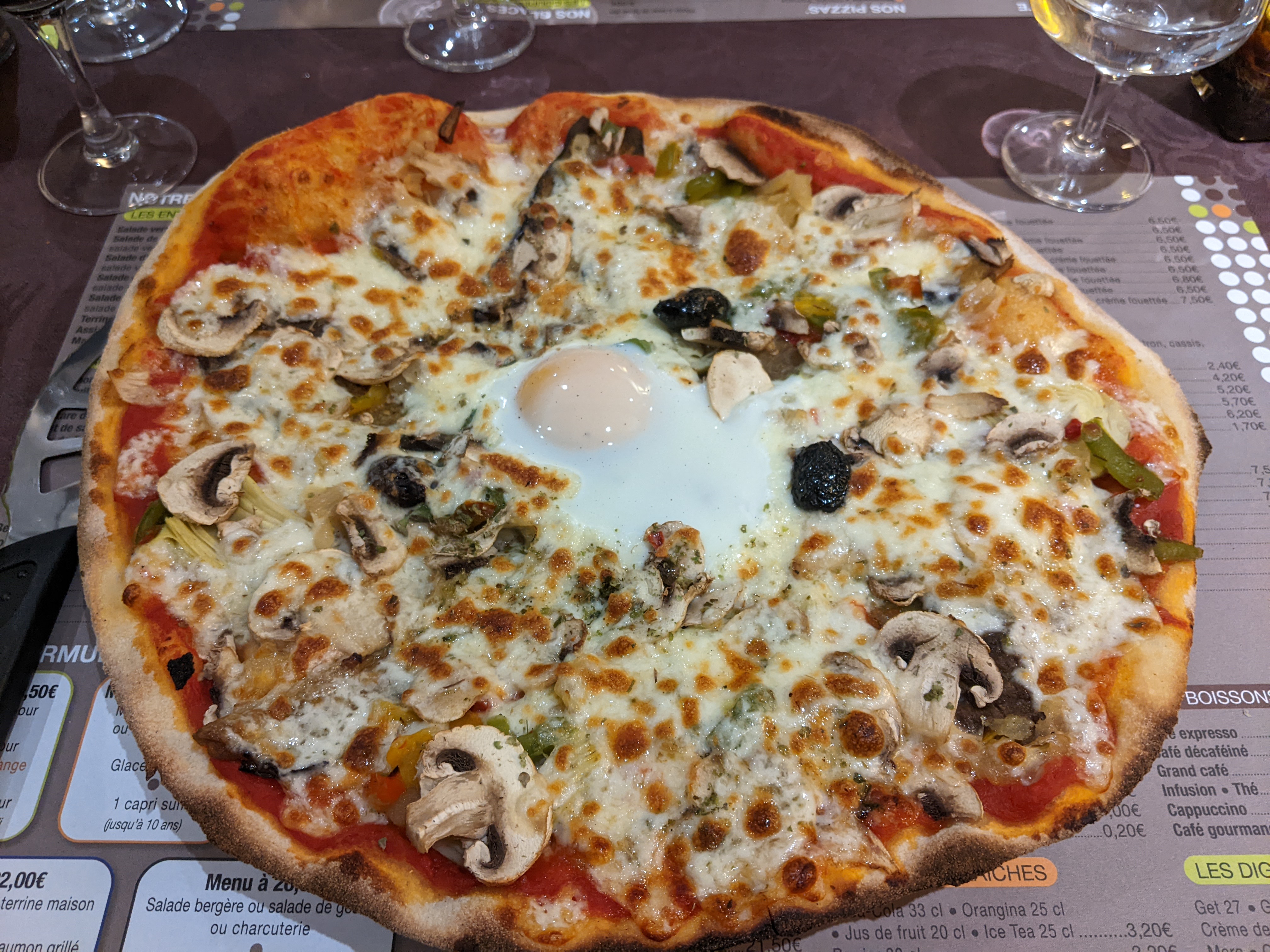 Avis uniquement sur les pizzas. Pizzas petites par rapport au prix. 1,20€ le supplément œuf !! Juste du vol...