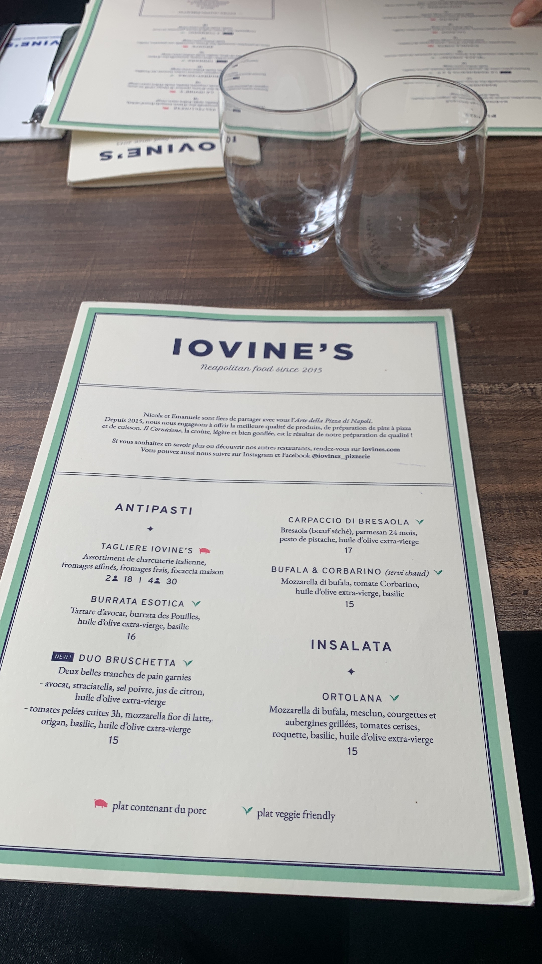 Excellente soirée, j'ai réservé une table pour 7 personnes et ils nous ont très bien accueilli avec une confirmation d'1h avant l'heure de la réservation. C'est vraiment une tuerie les grosses planches d'antipasti et la spécialité de leur pizza Iovine's, on sentait de tout, de la fraîcheur, du bon goût de fromage et du jambon et la croûte bien gonflé. Ensuite le dessert, le tiramisu, vraiment wow, je n'ai jamais goûté d'aussi bon dessert italien de ce genre. Puis ils nous ont offert un shot de liqueur de citron à chacun pour digérer le tout.