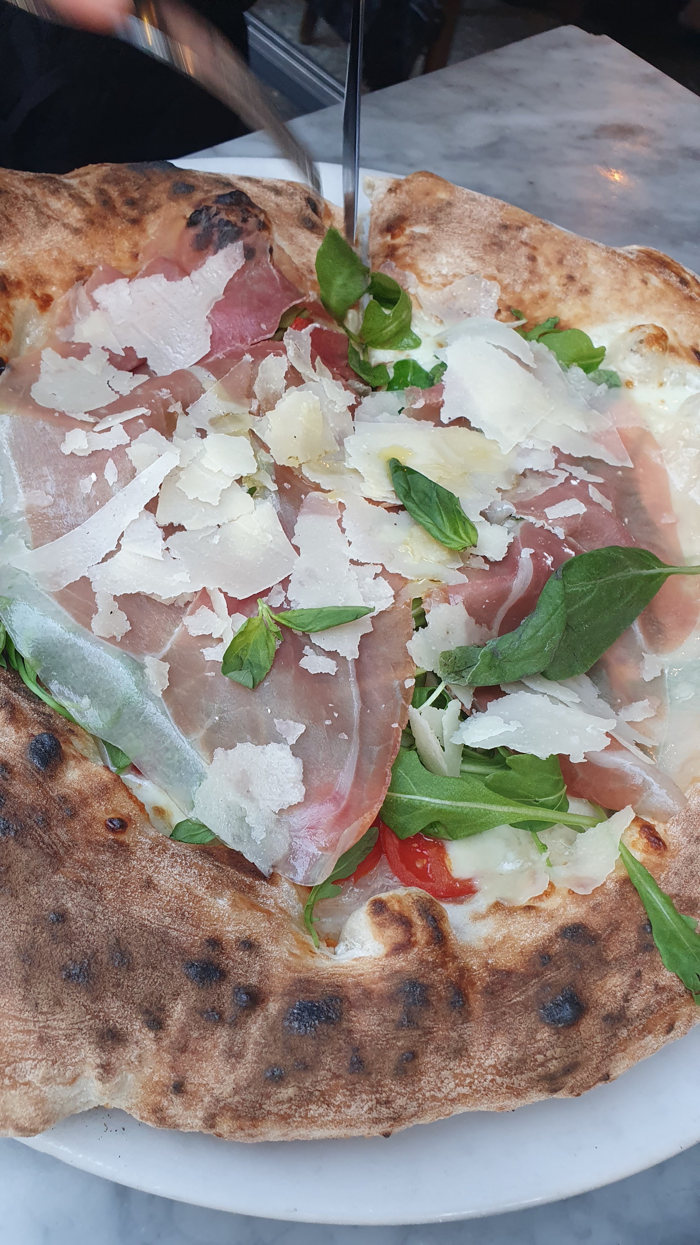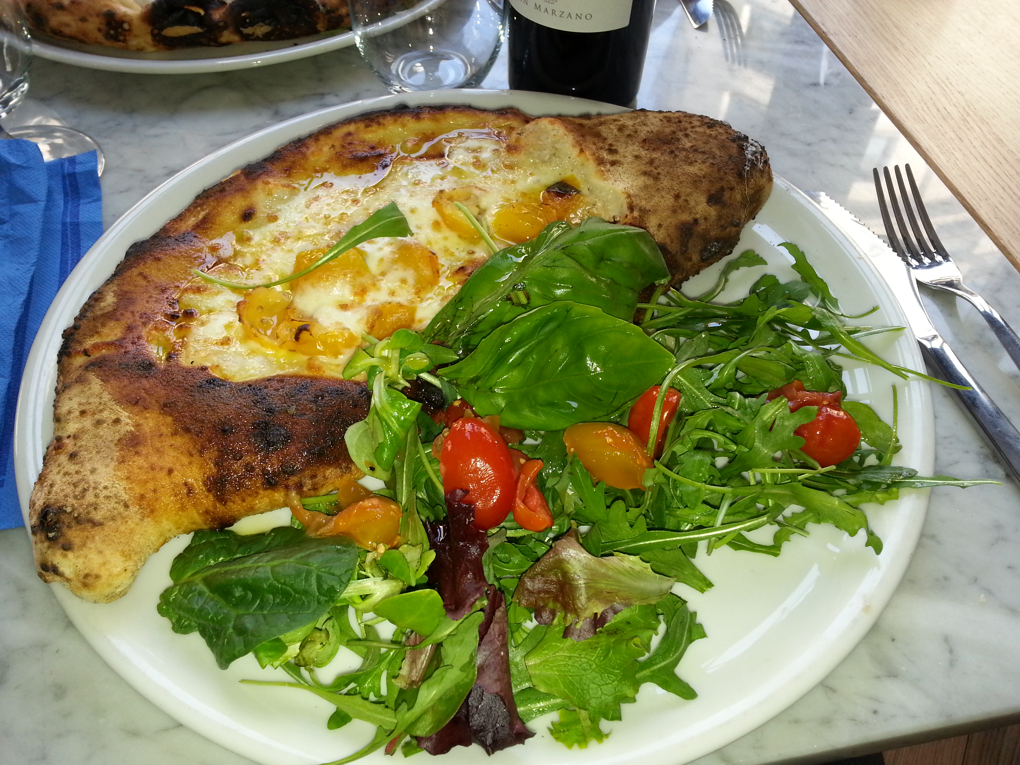 J'y suis allé seul pour le déjeuner et j'ai commandé une Margherita. Dommage qu'ils ne me donnent pas de table pour 2 personnes à l'extérieur, seulement le comptoir. La croûte est un peu brûlée mais la tomate mélangée au fromage est toujours excellente.