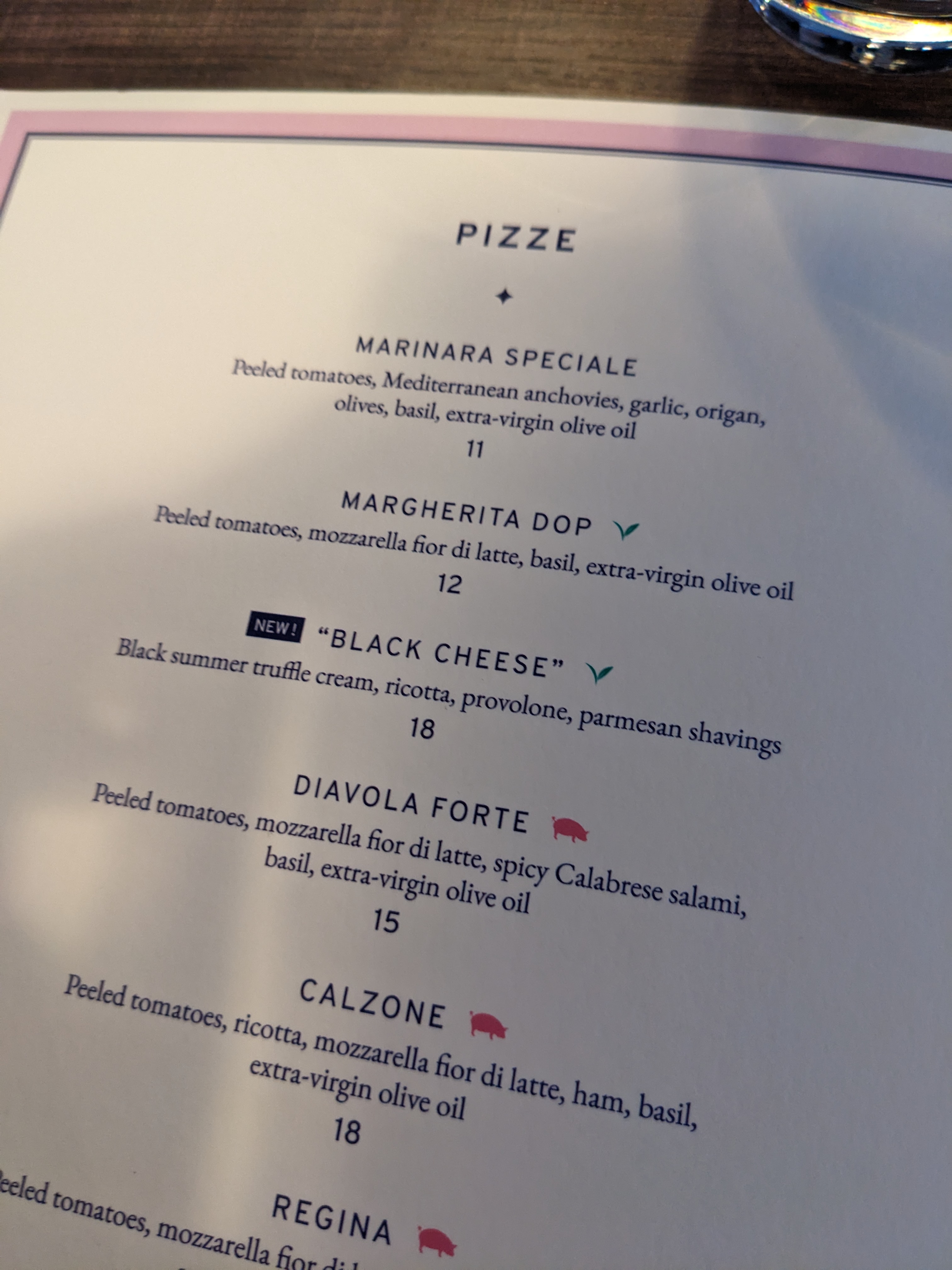 Très bonne pizza et c'était un style très italien. Même moi, un Américain, j'ai dû sortir la fourchette et le couteau parce que la croûte est si fine et fragile. J'ai testé les pizzas Margarita (13 €) et Diavola (18 € ?). J'ai davantage aimé la margarita. Il mettait en valeur le fromage, la sauce et la croûte de haute qualité. La Diavola était bonne aussi et avait de belles épices après avoir ajouté de l'huile de piment fort à chacune.